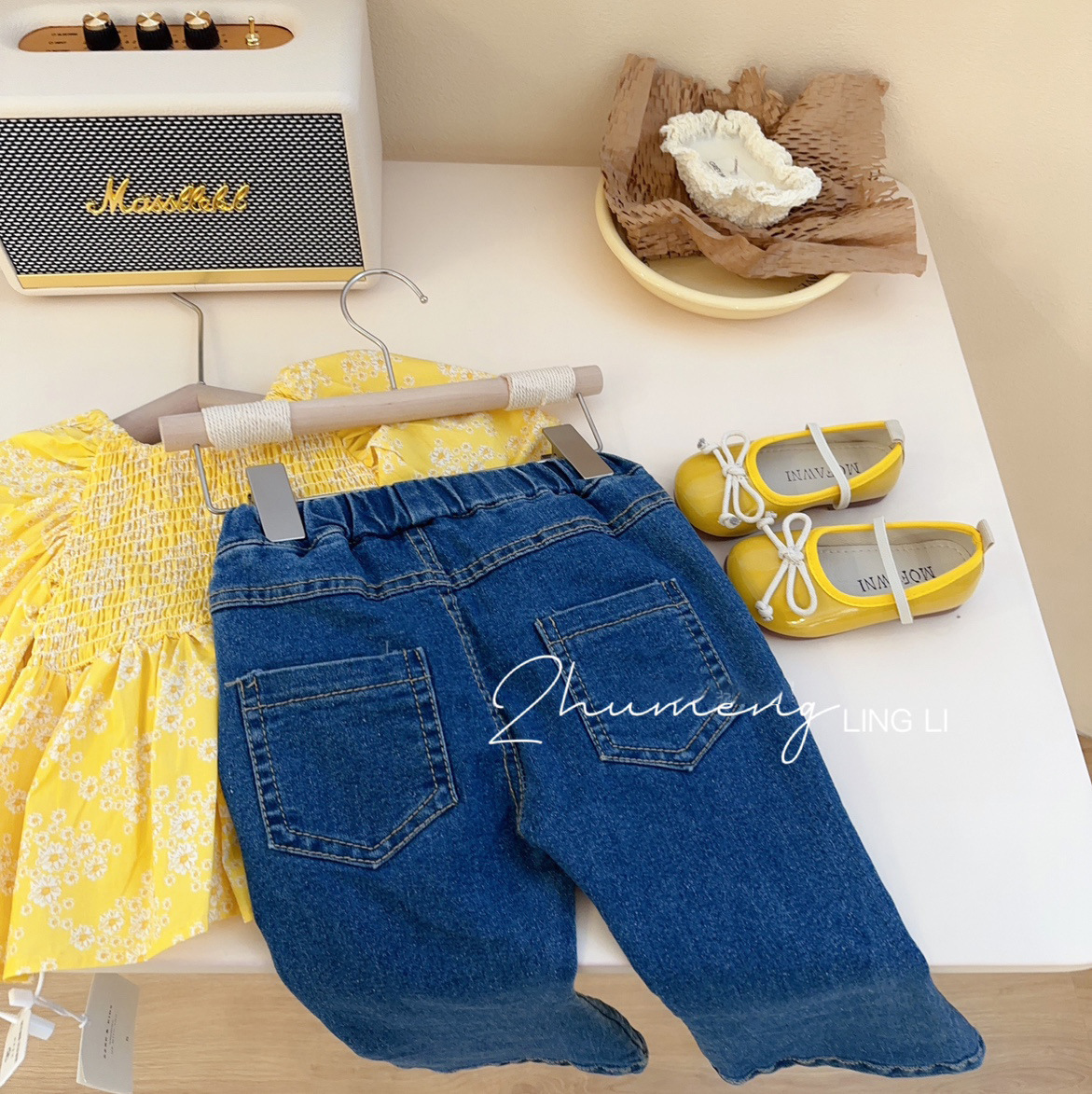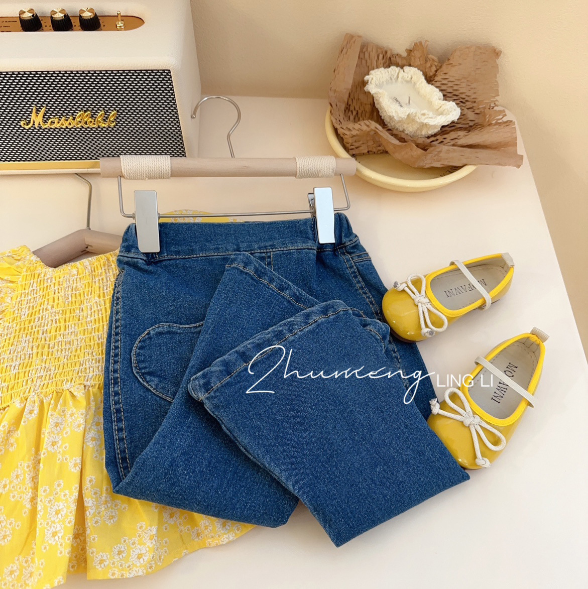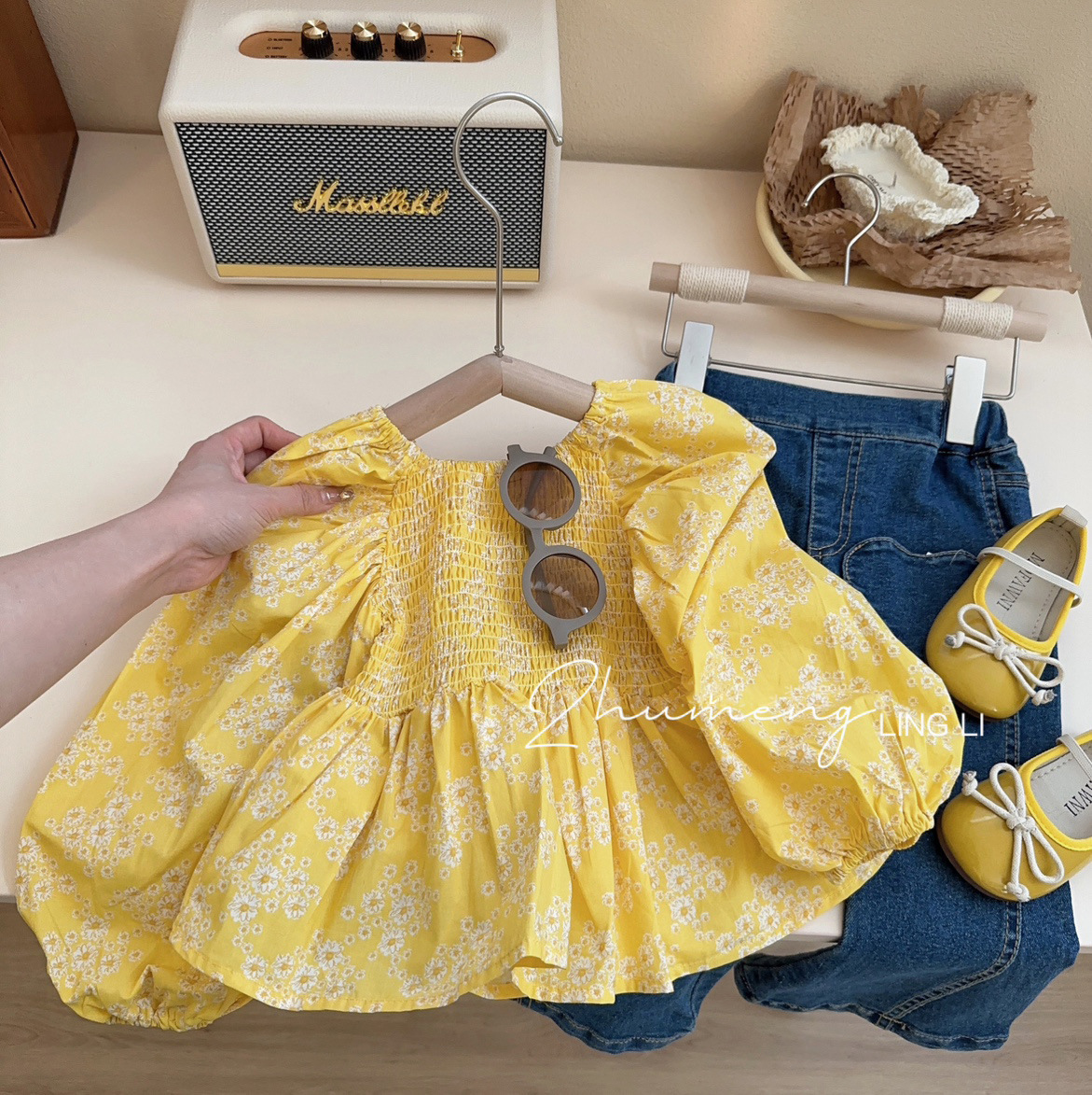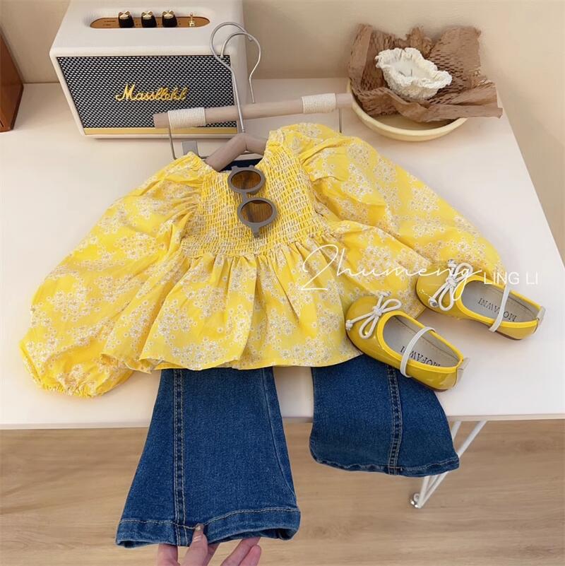 Lime Women's Children's Clothing Fashionable Western Style Suit Autumn Clothing Children's Yellow Bubble Sleeve Floral Shirt Jeans Two-piece Set