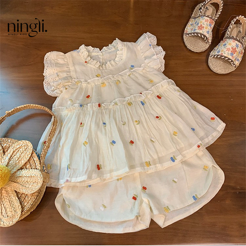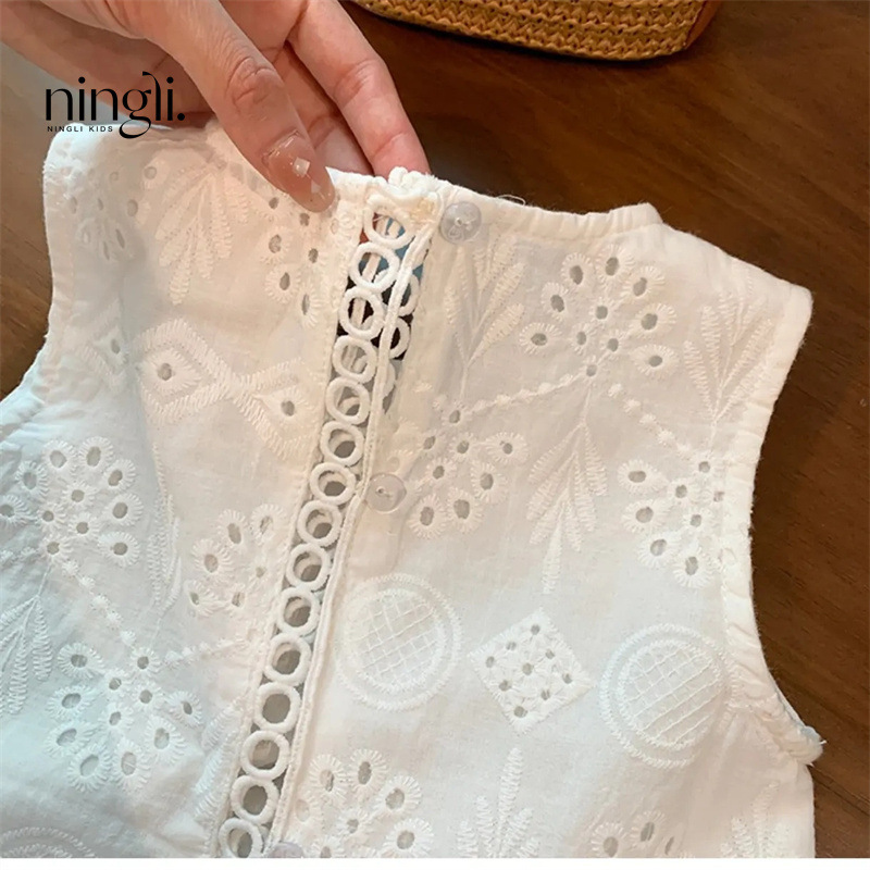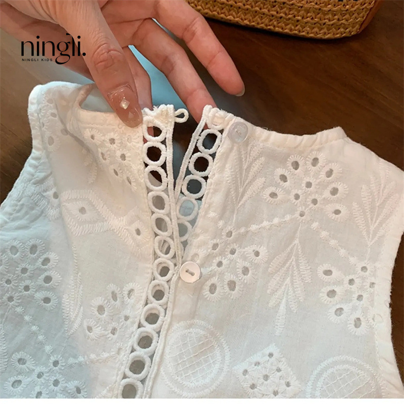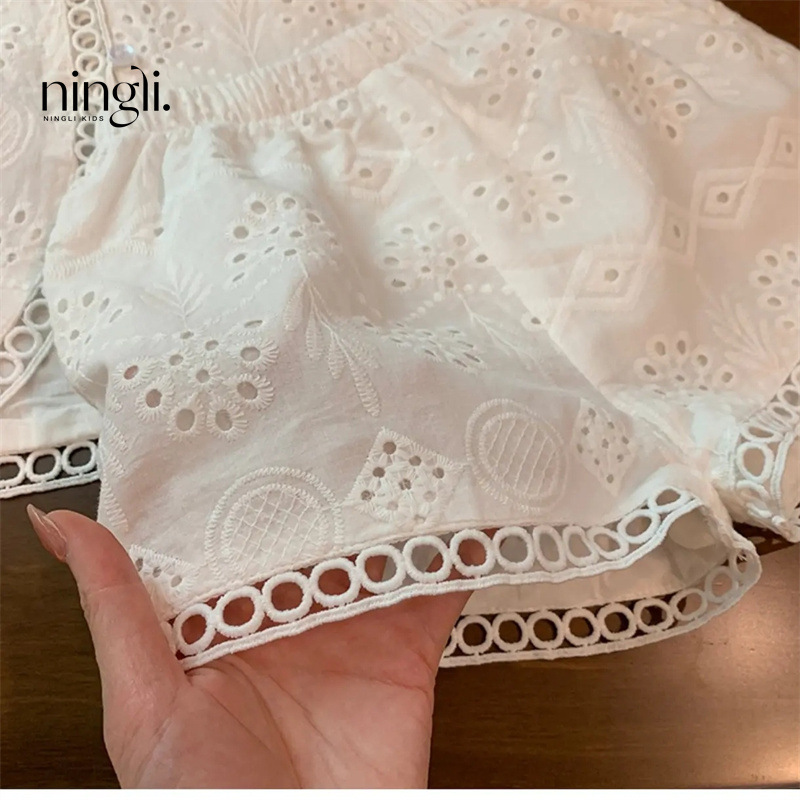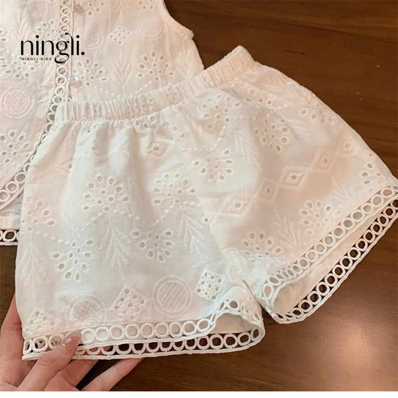 Ningli Kidsren's Clothing Girls Fashionable Internet Celebrity Summer New Suit Kidsren's Summer Clothing Cut Out Lace Vest Shorts Suit