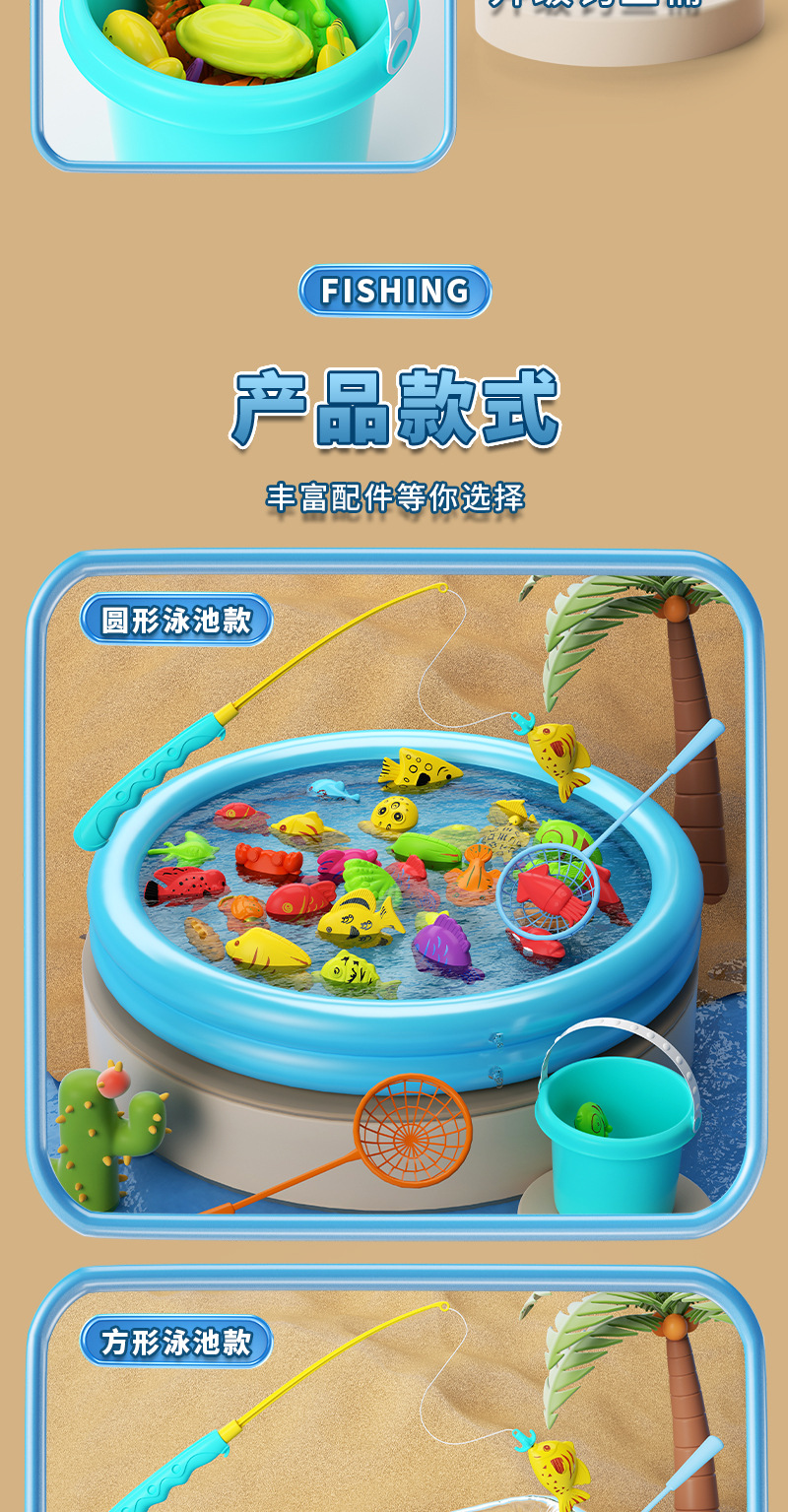 | Colour | Upgraded large square pool - 49-piece set (41 fish + 2 fishing rods + 2 nets + 1 pump + 1 large square pool + 2 fishing buckets) - 26 | Colour | Double-layered large round pool - 47-piece set (41 fish + 2 fishing rods + 2 nets + 1 pump + 1 large round pool) - 25 |