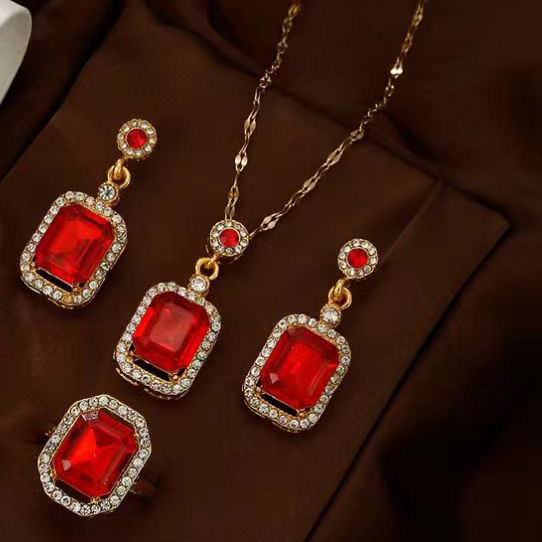 Hong Kong-style Geometric Three-piece Necklace Earrings Ring Women's Niche High-end Design Clavicle Chain Light Luxury All-match Necklace Chain