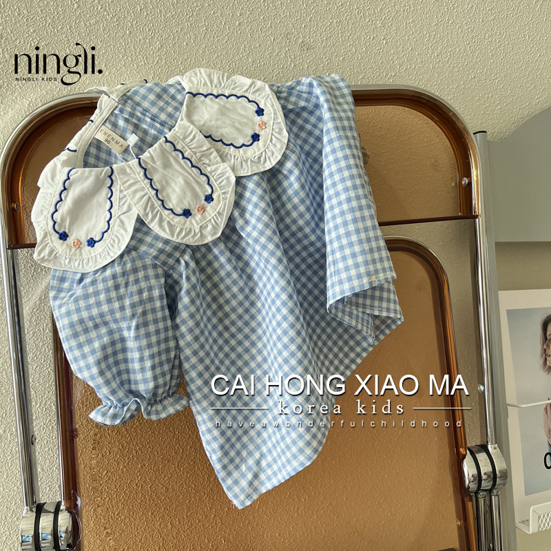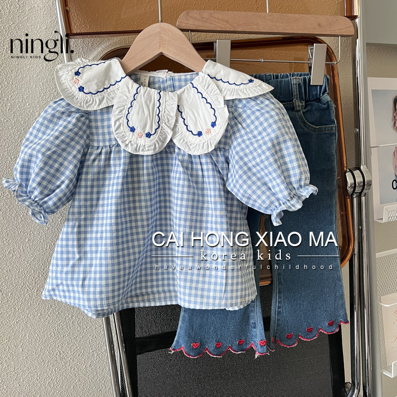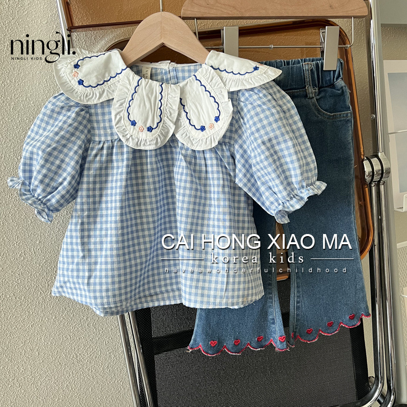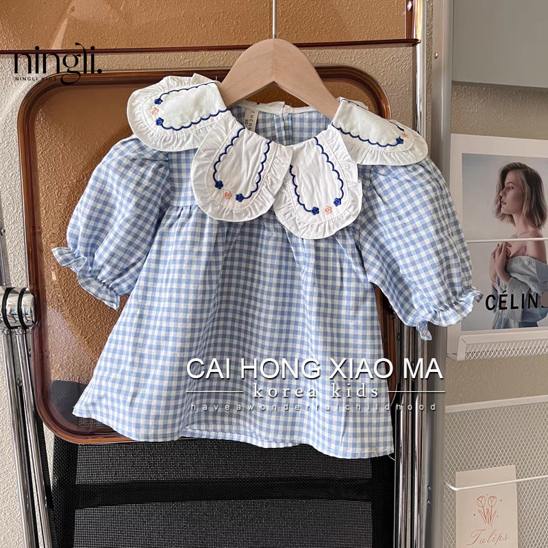 Lime Autumn Wear Children's Wear Girls' Puff Sleeve Shirt Children's Western Style Blue Plaid Baby Doll Shirt Long Sleeve Top