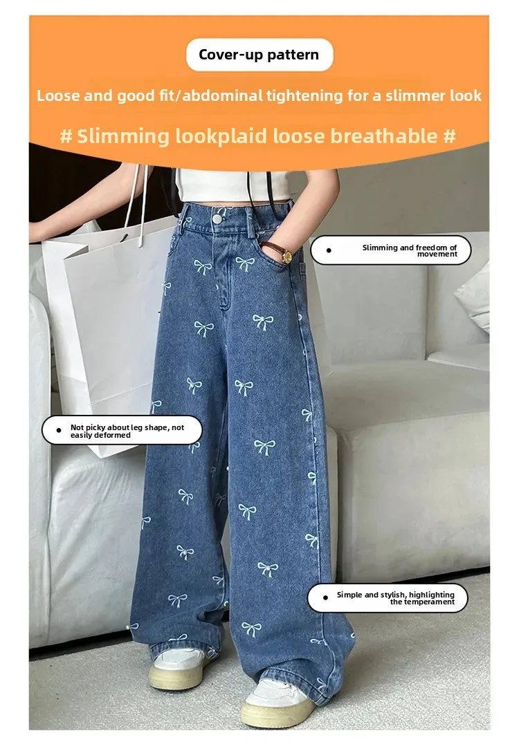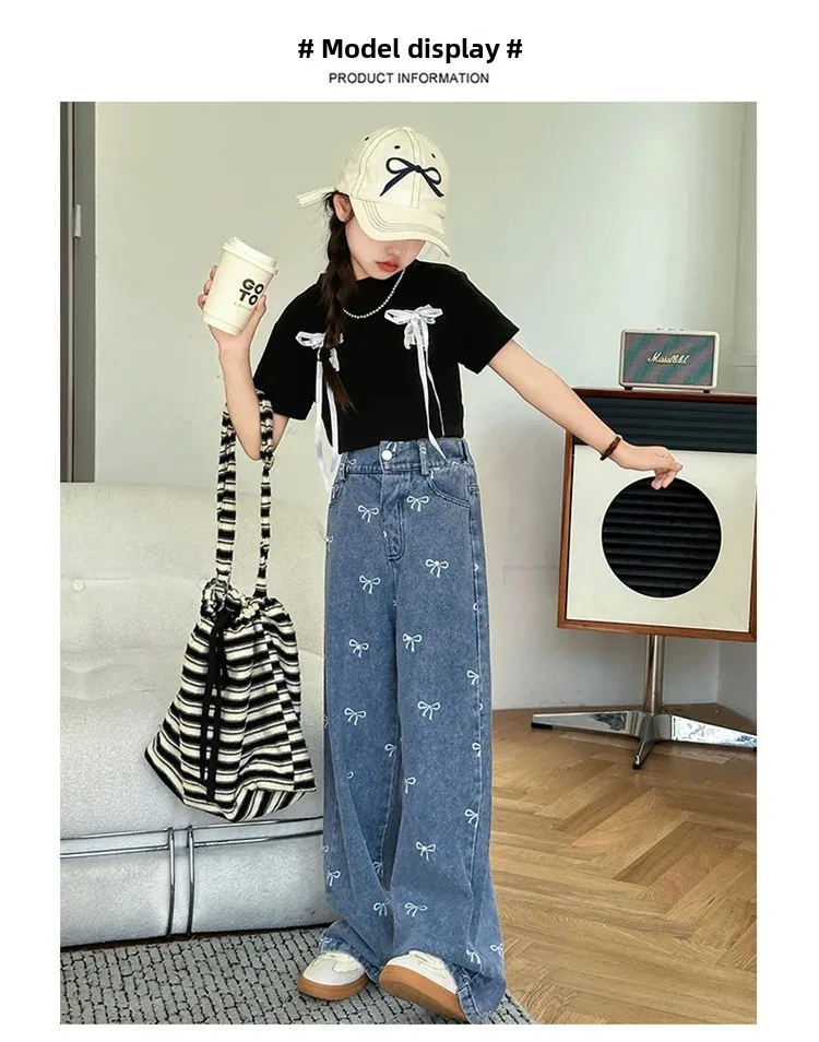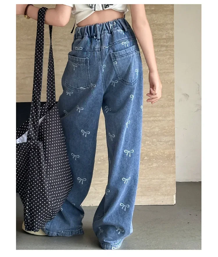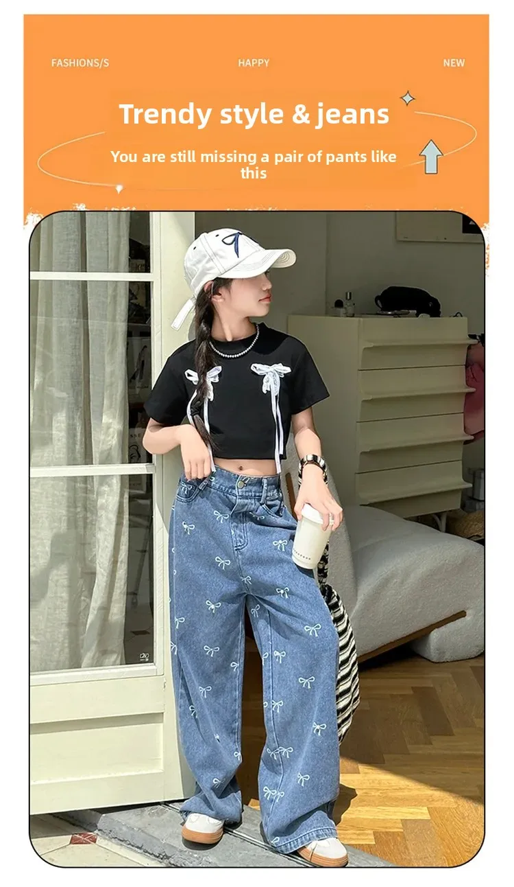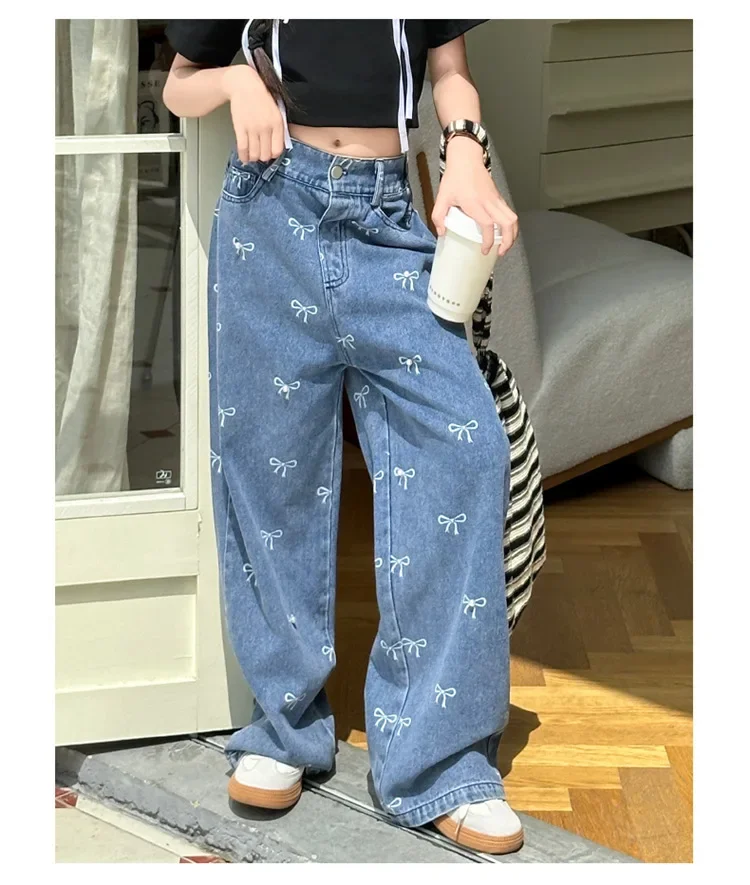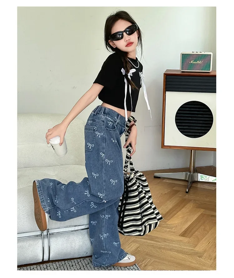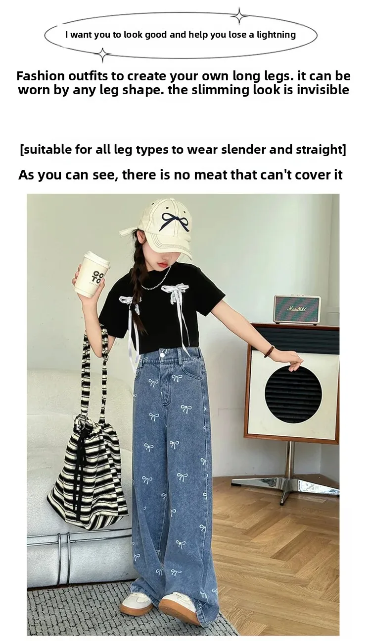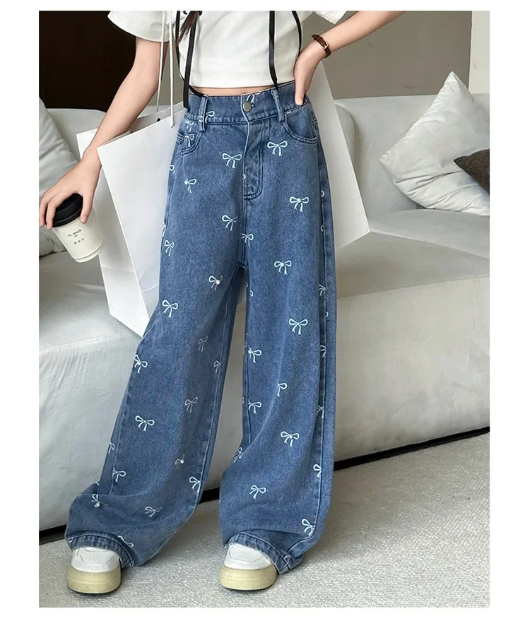 Children's Summer Pants 2025 New Elastic Waist Jeans Bow Printed Wide Leg Pants Fashionable Autumn Wear