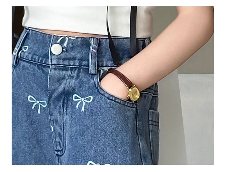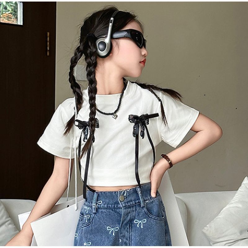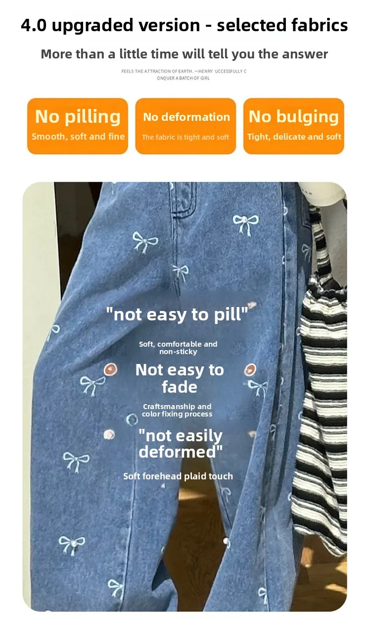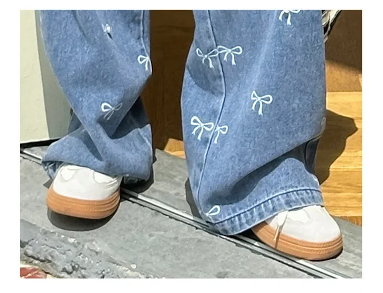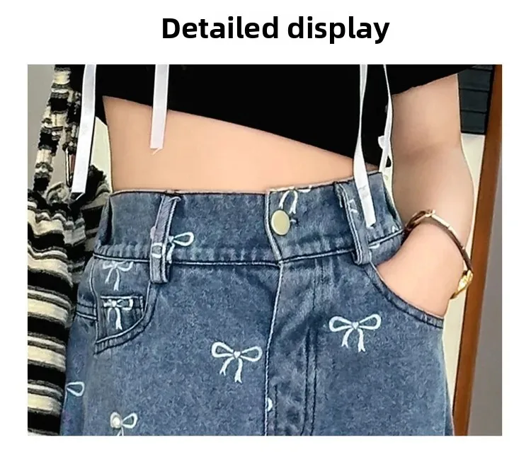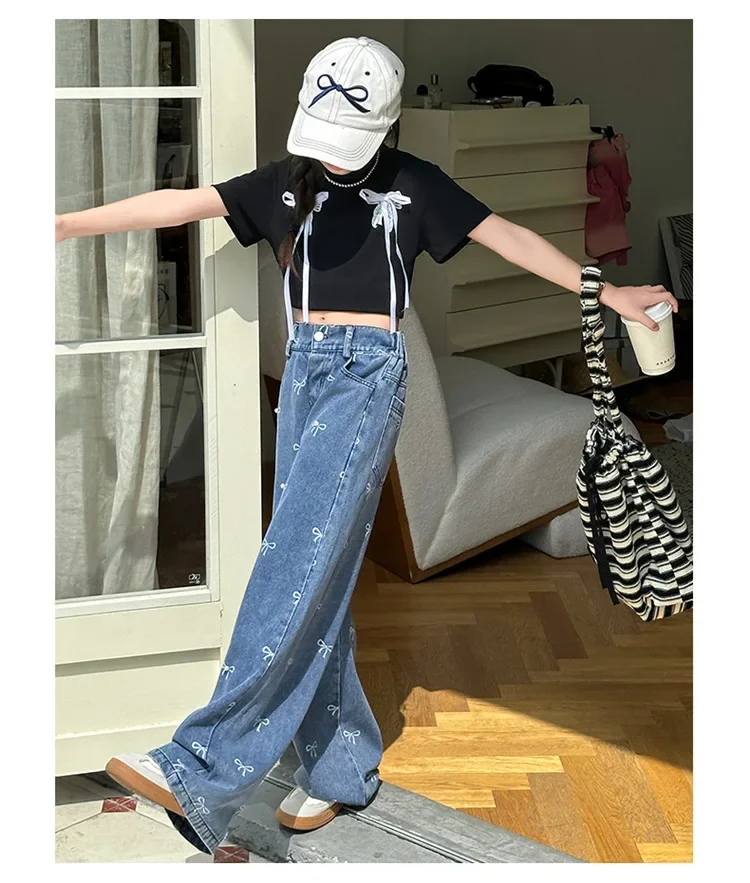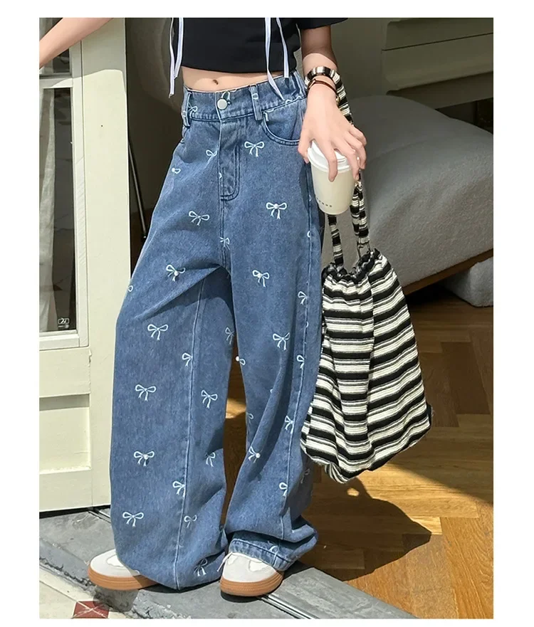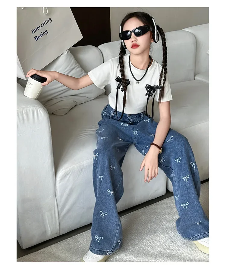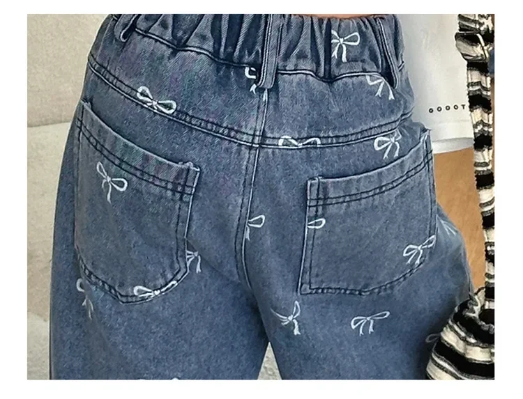 Children's Summer Pants 2025 New Elastic Waist Jeans Bow Printed Wide Leg Pants Fashionable Autumn Wear