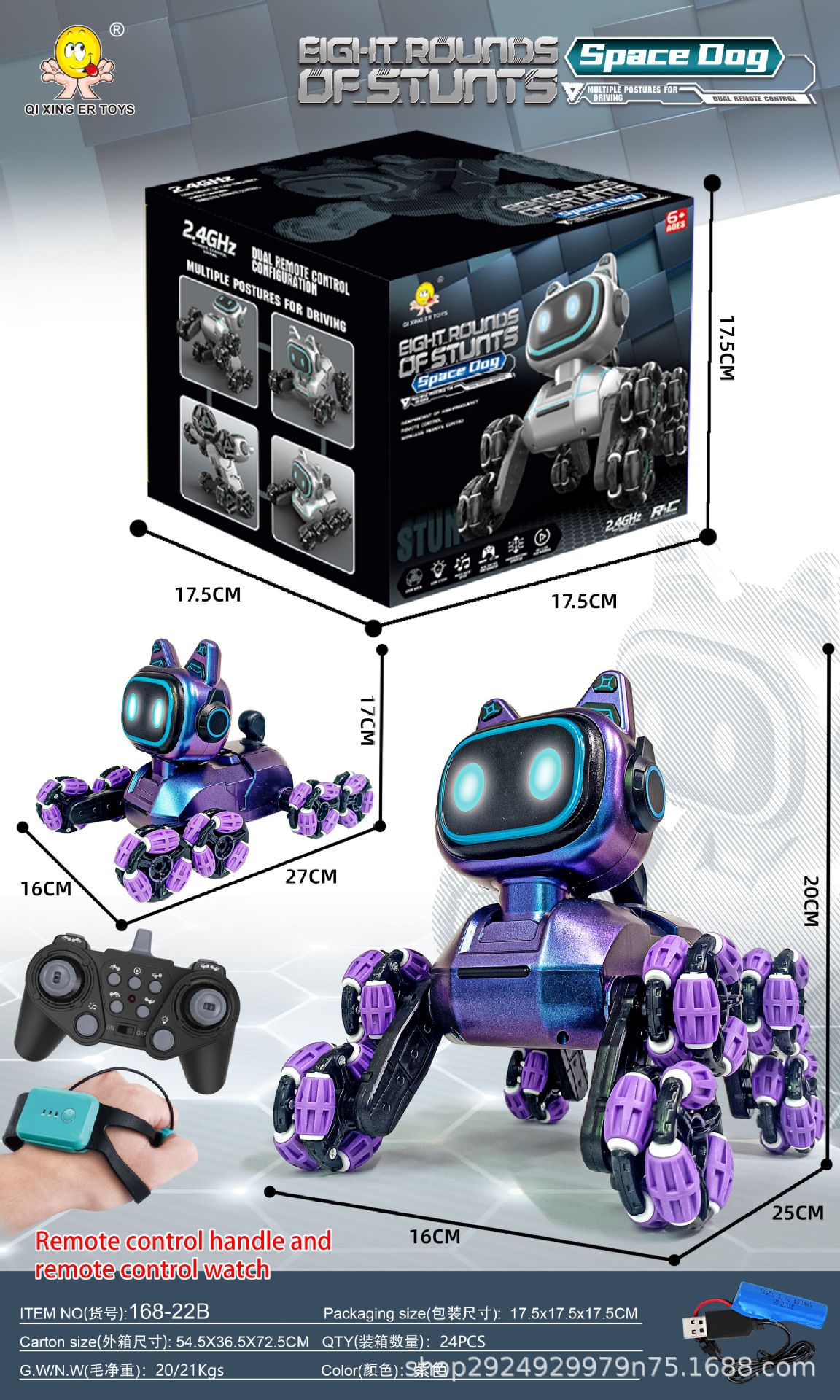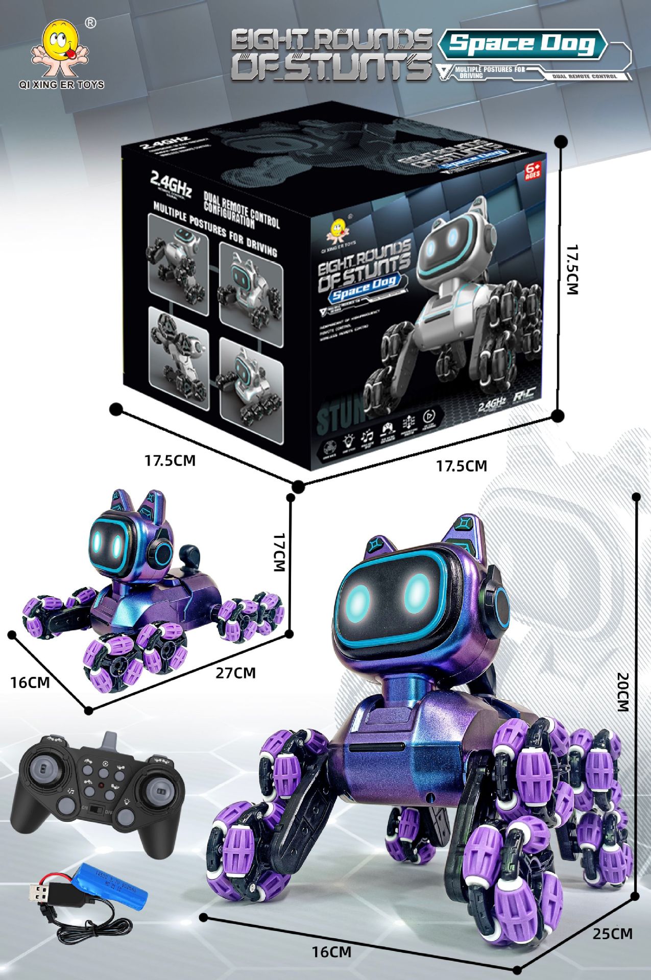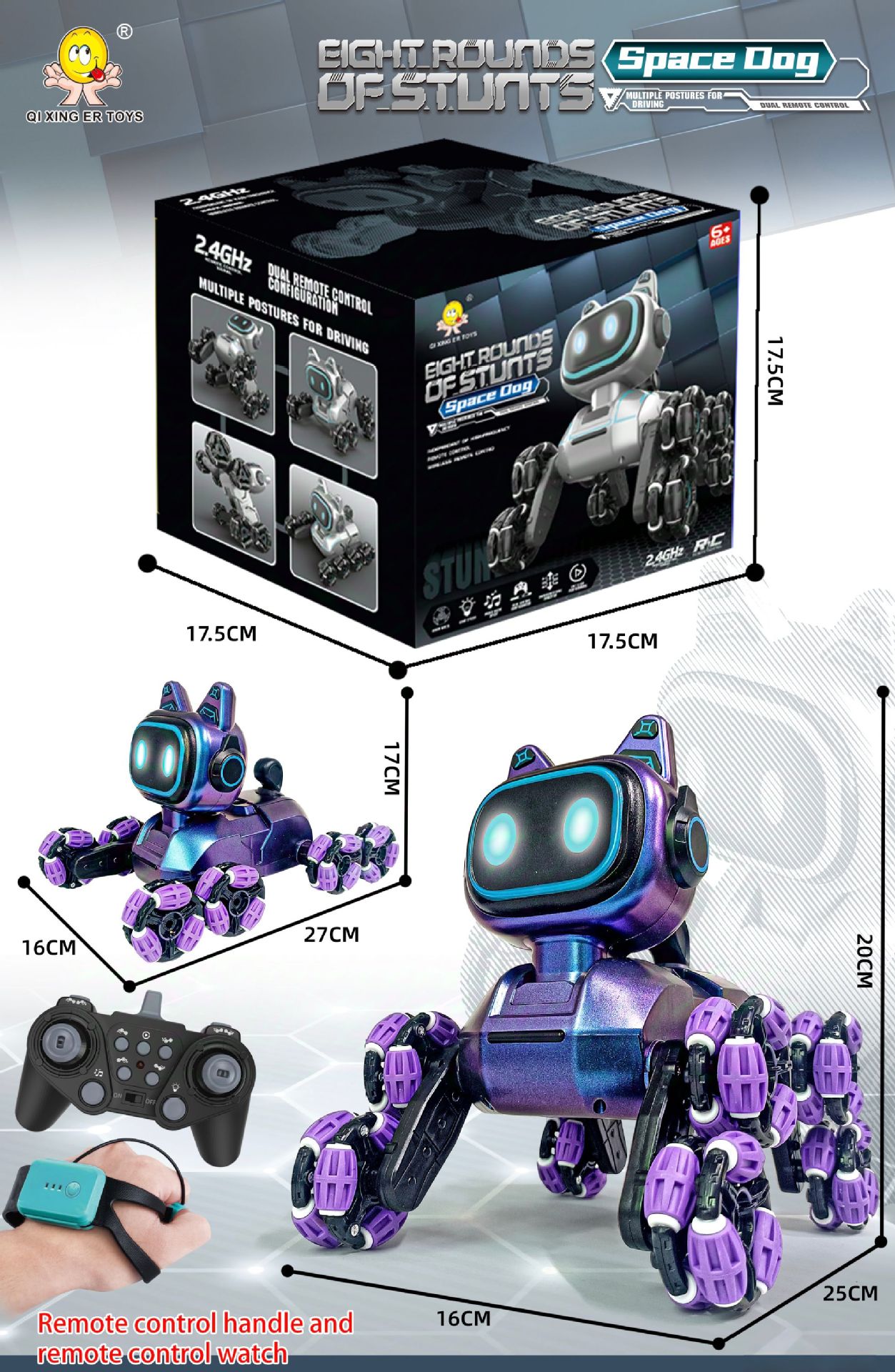 | Color | Cross-border eight-wheeled stunt car mechanical dog [purple single control] sealed color box | Color | Upgraded cross-border eight-wheeled stunt car mechanical dog [white dual control] sealed color box |