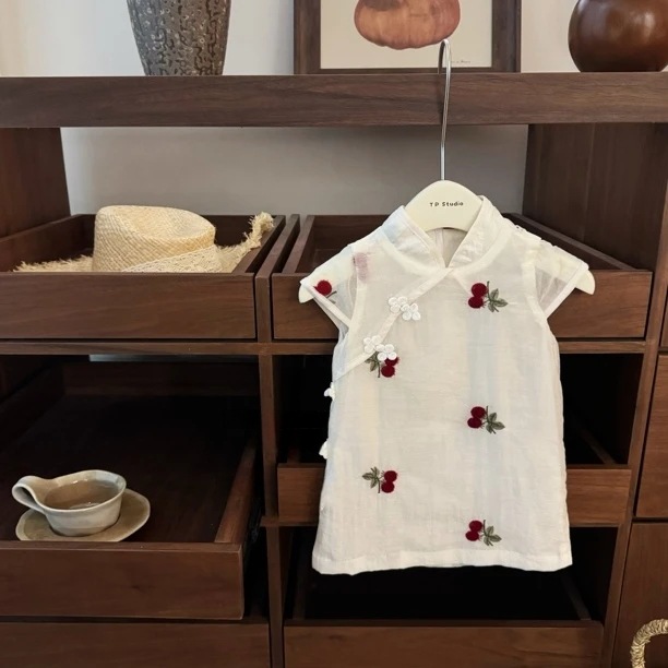 Summer new oriental beauty! Summer Baby Girl's New Chinese Style National Style Sweet Cherry Embroidered Cheongsam Vest Dress Trendy