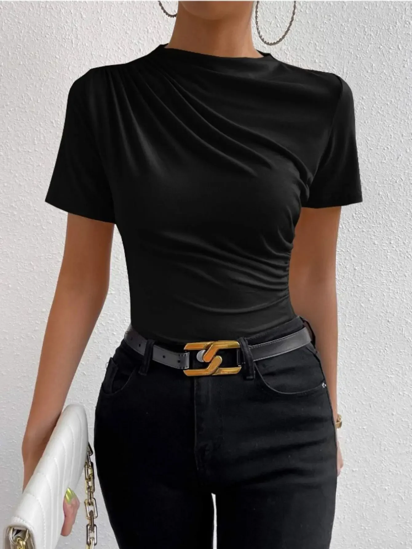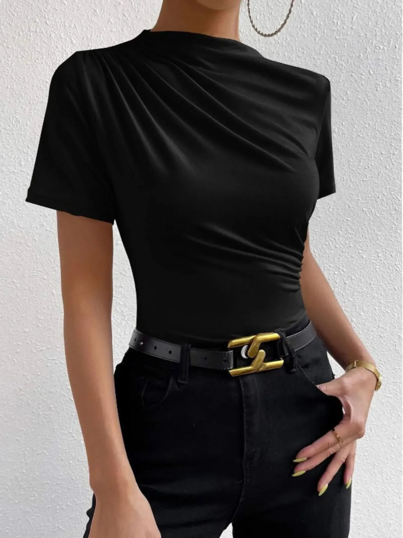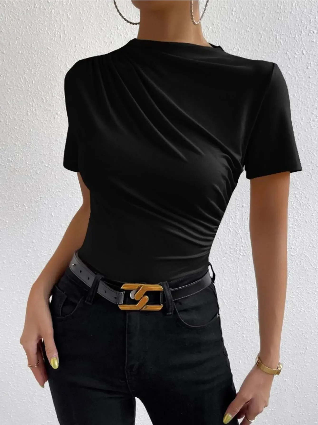 Short-sleeved T-shirt European and American Cross-border Short-sleeved French Temperament Slimming Women's Casual Pleated Round Neck T-shirt