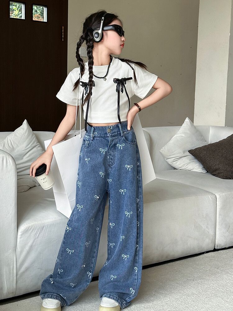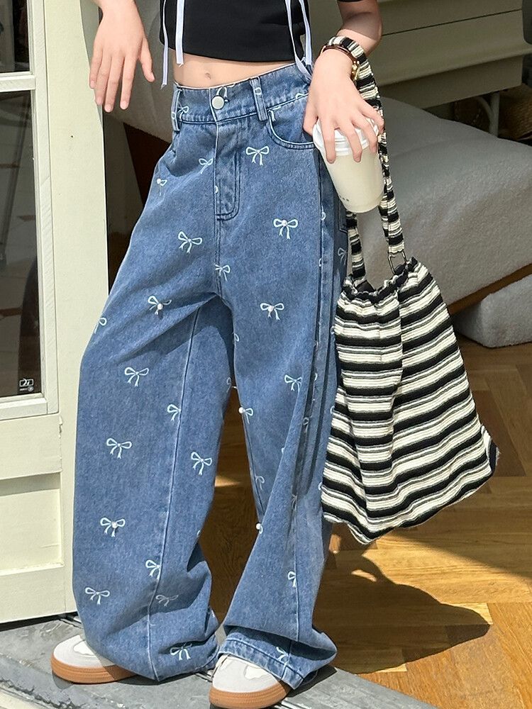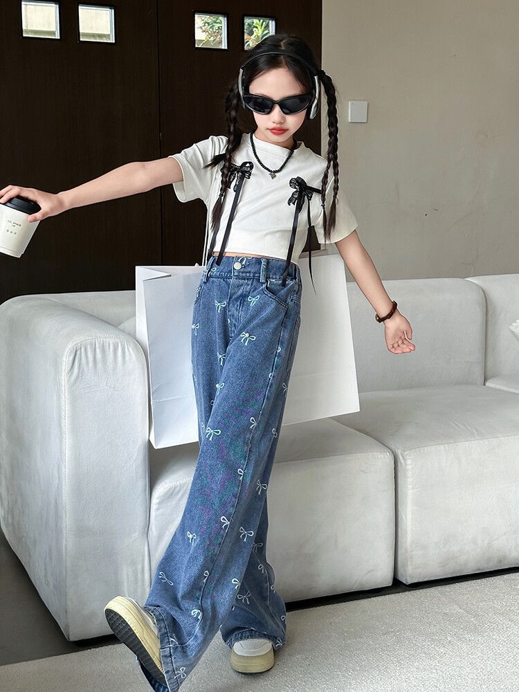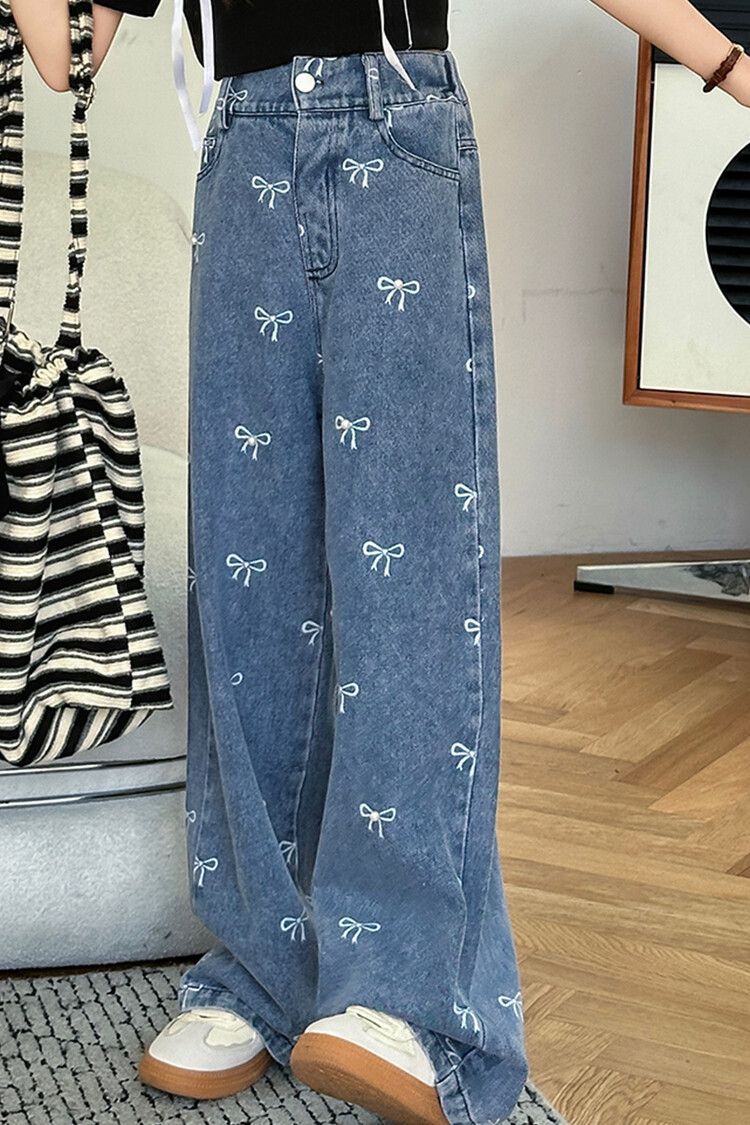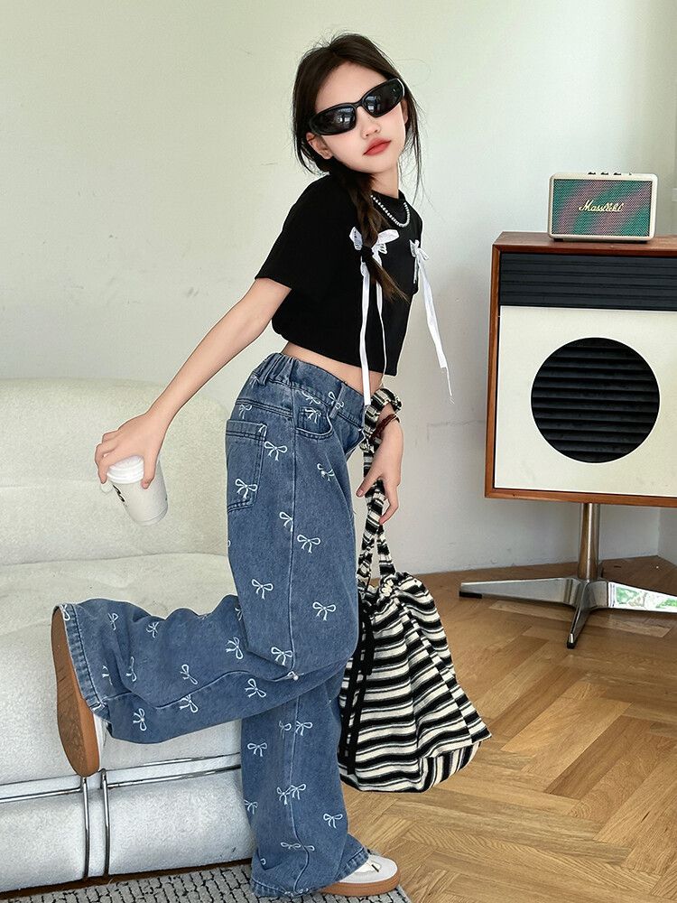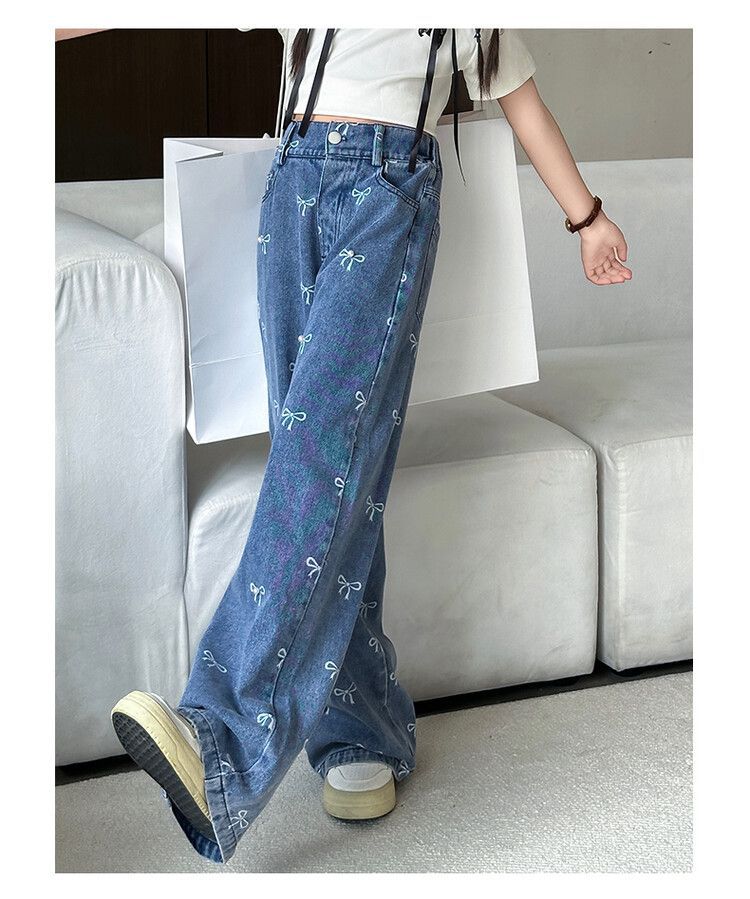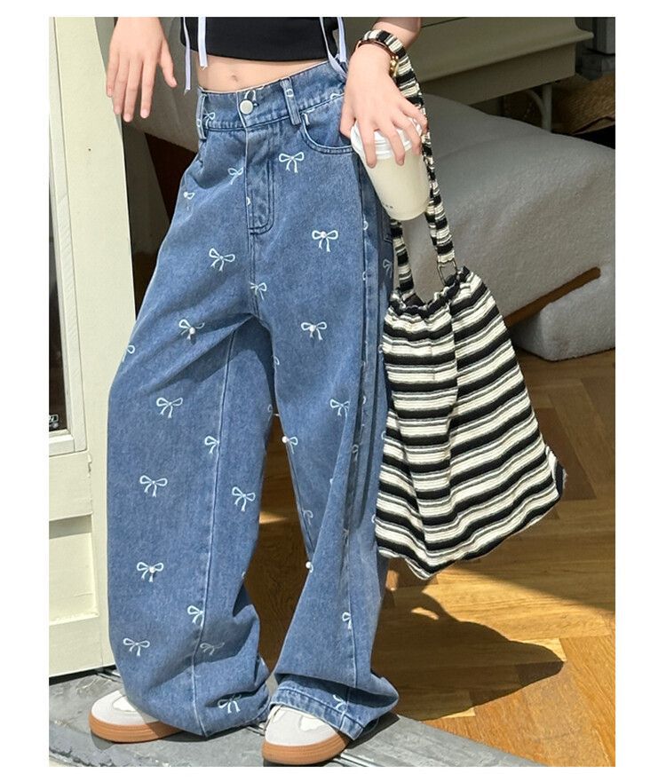 Girl's Vintage Washed Blue Bow Print Beaded Jeans Summer Children's High Waist Wide Leg Pants
