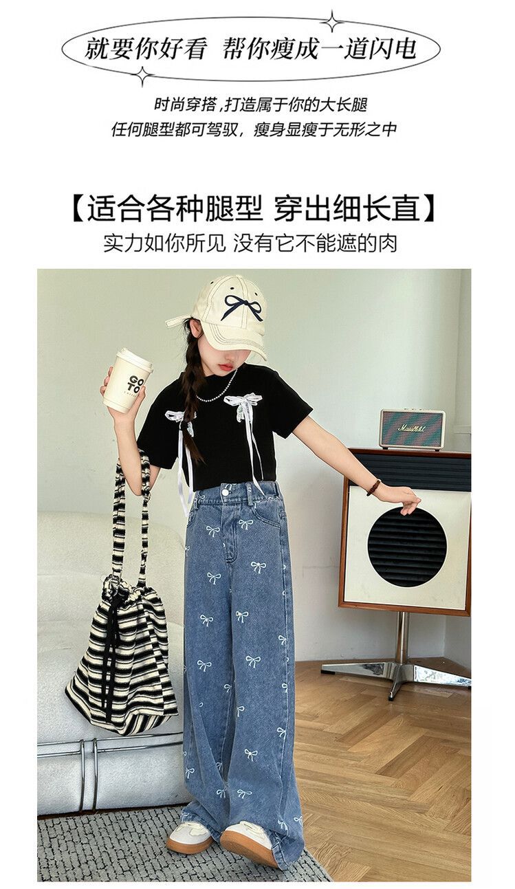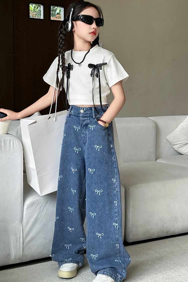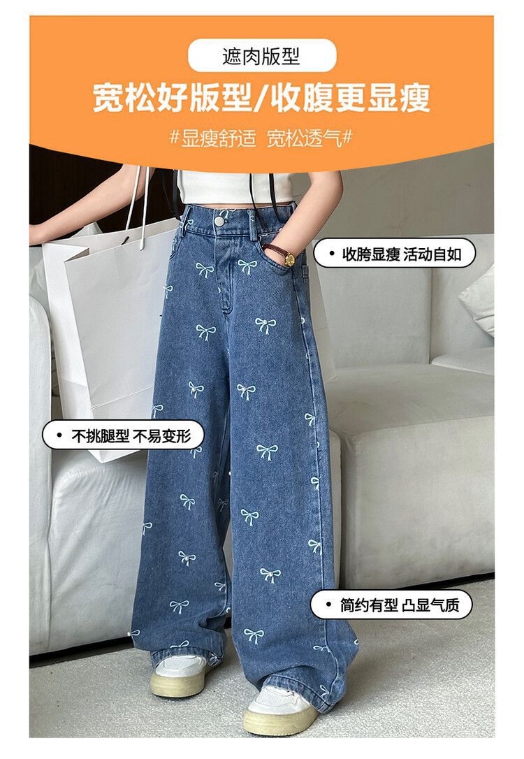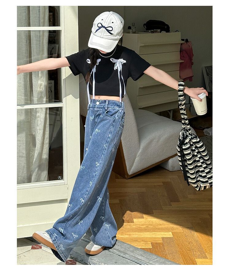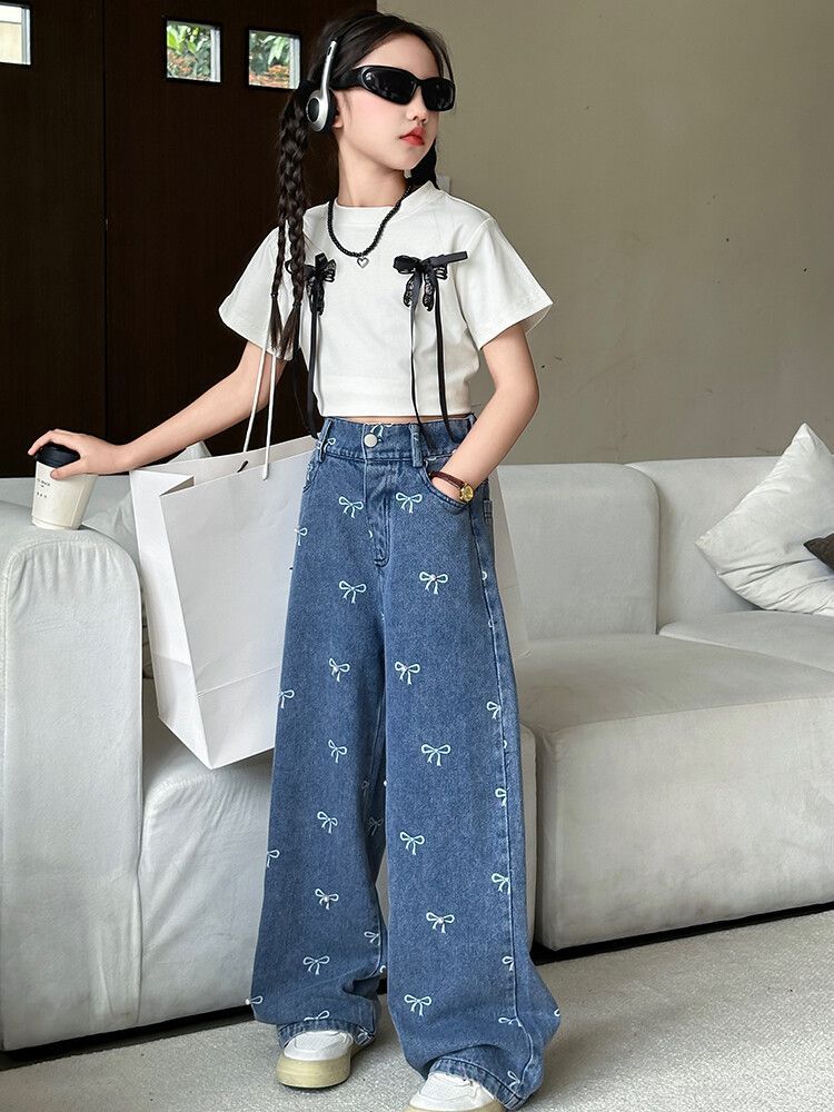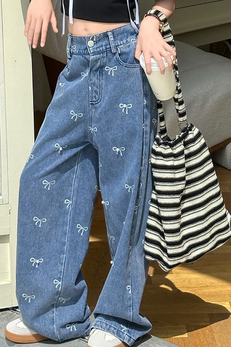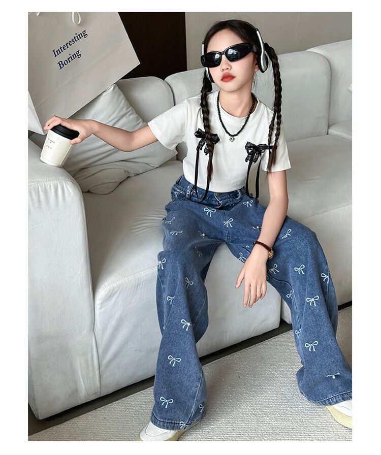 Girl's Vintage Washed Blue Bow Print Beaded Jeans Summer Children's High Waist Wide Leg Pants