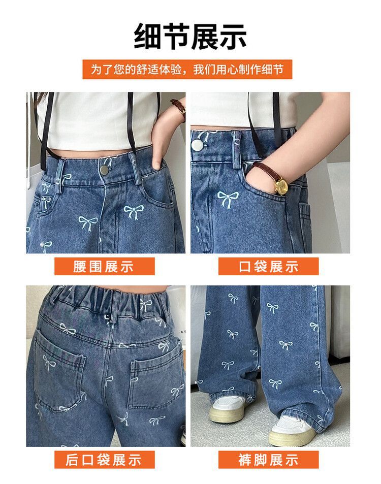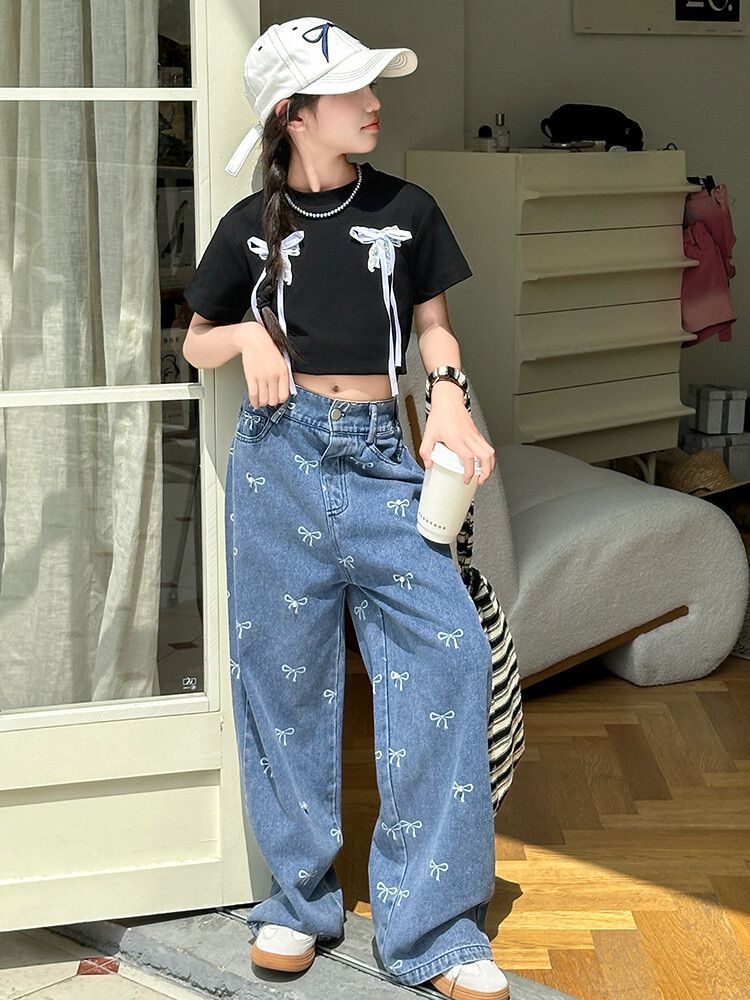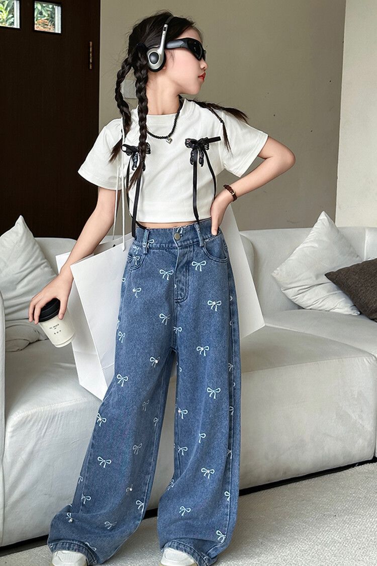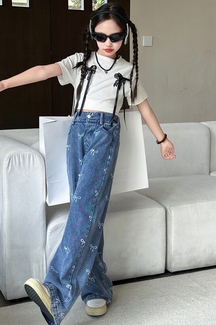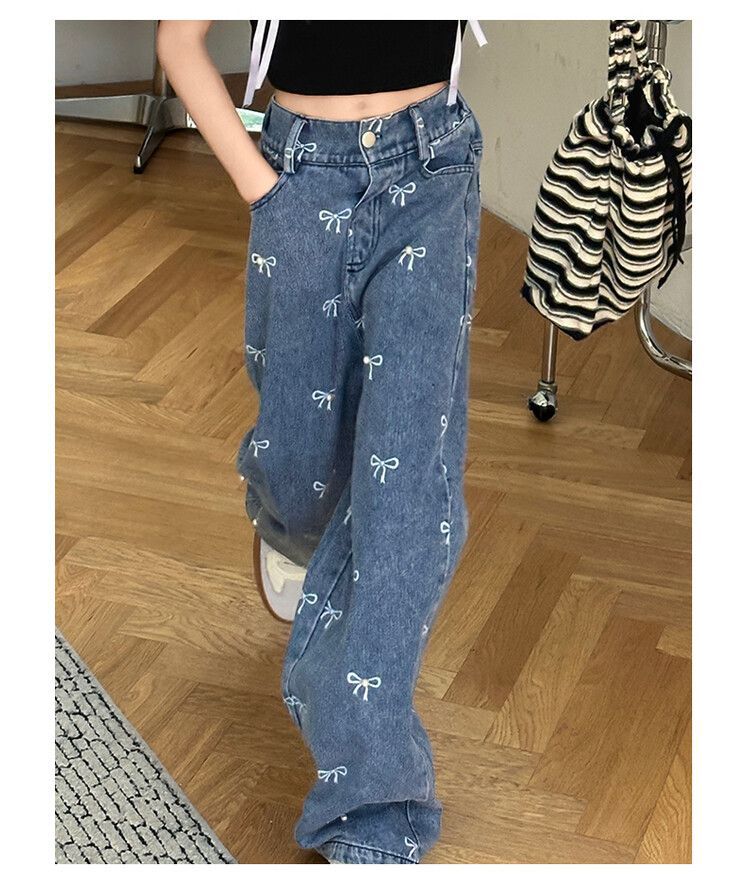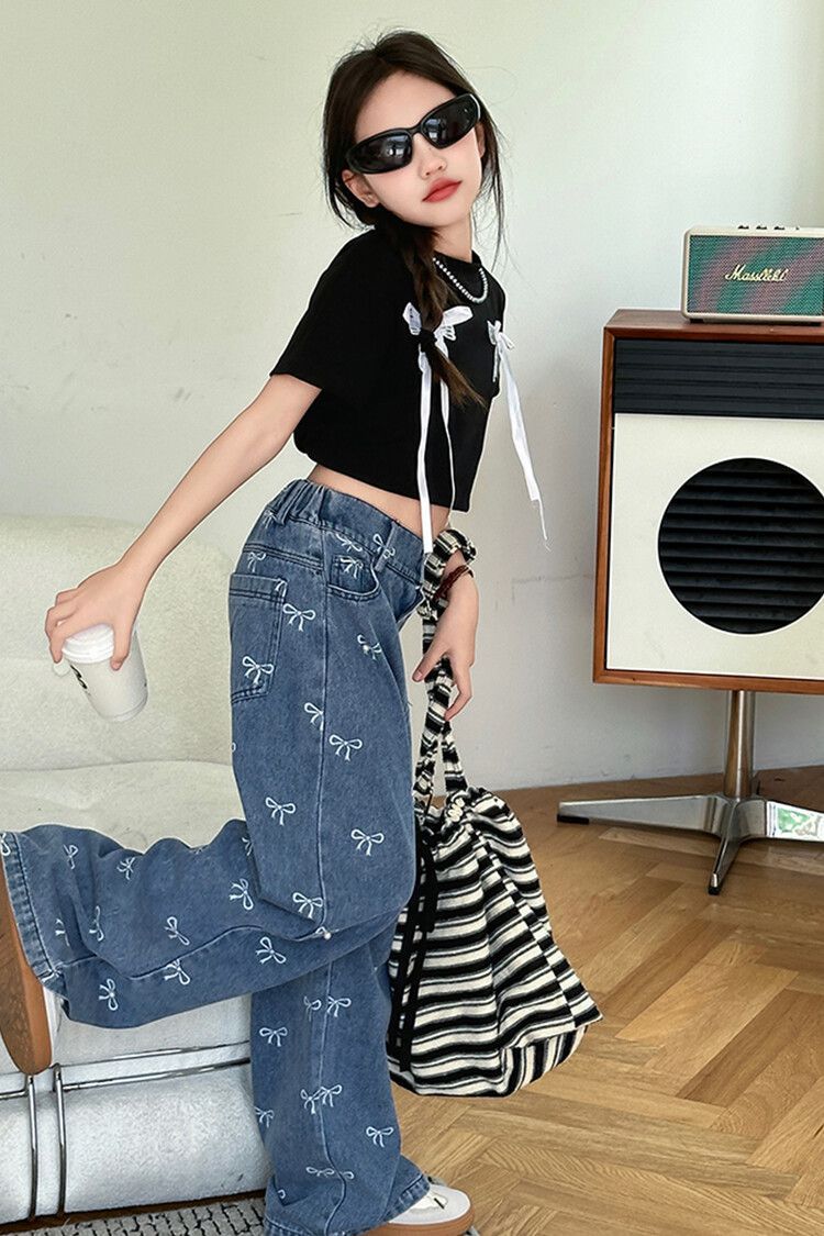 Girl's Vintage Washed Blue Bow Print Beaded Jeans Summer Children's High Waist Wide Leg Pants