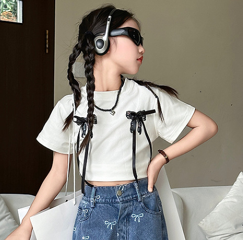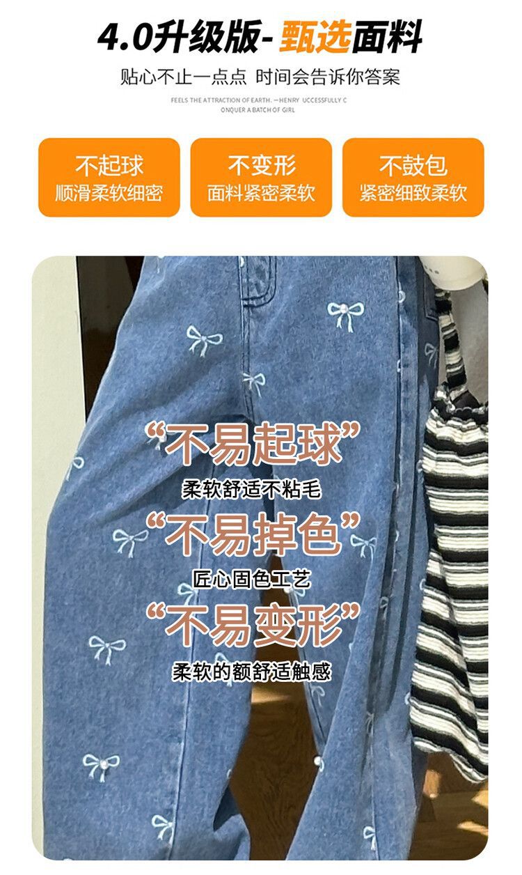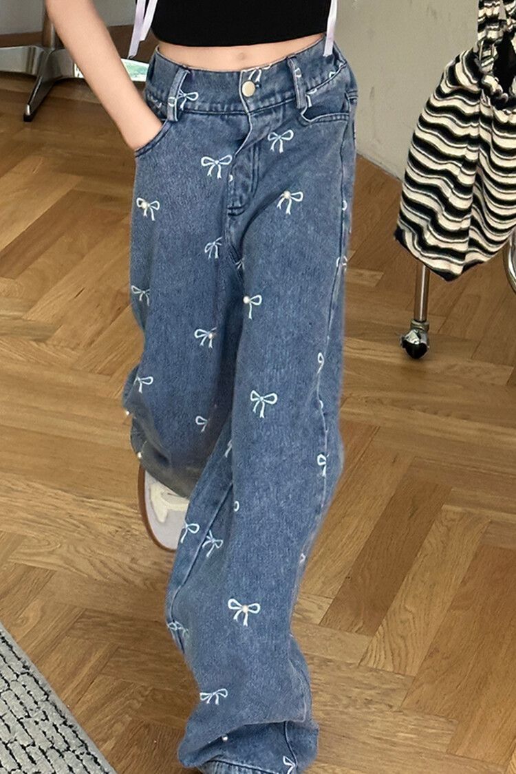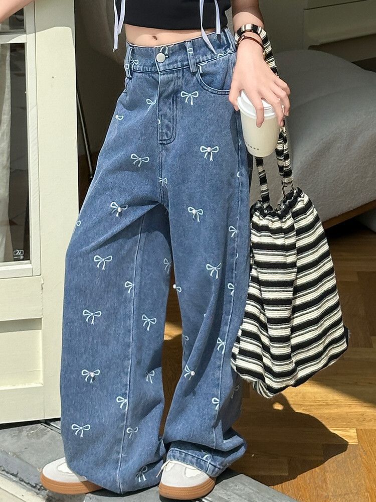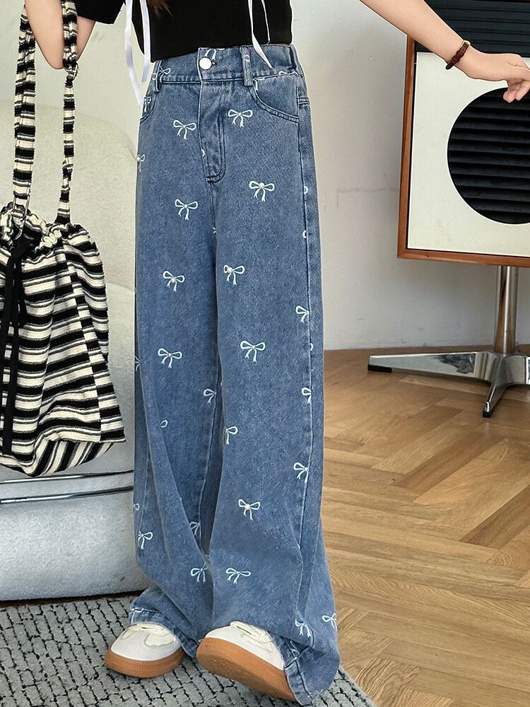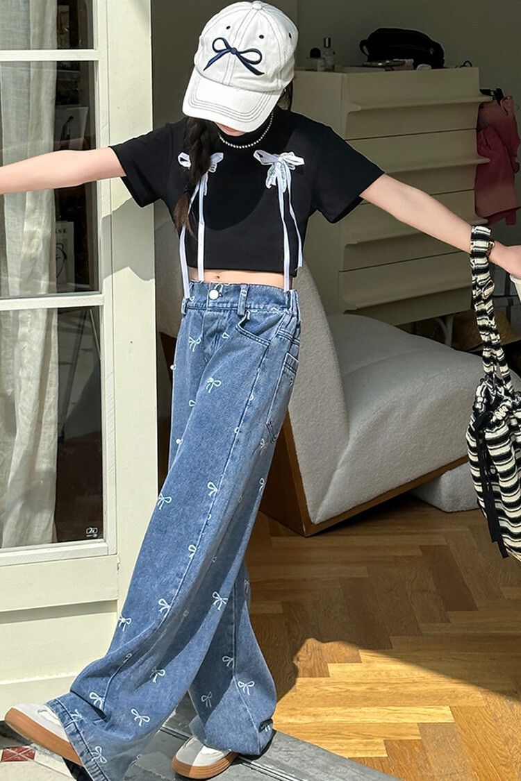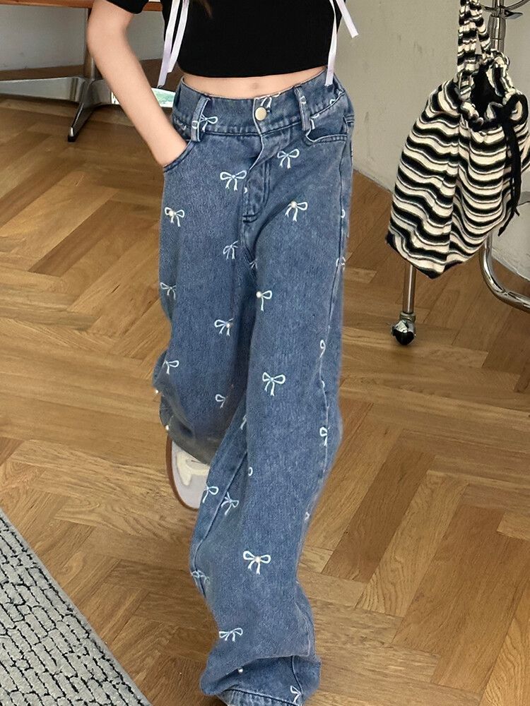 Girl's Vintage Washed Blue Bow Print Beaded Jeans Summer Children's High Waist Wide Leg Pants