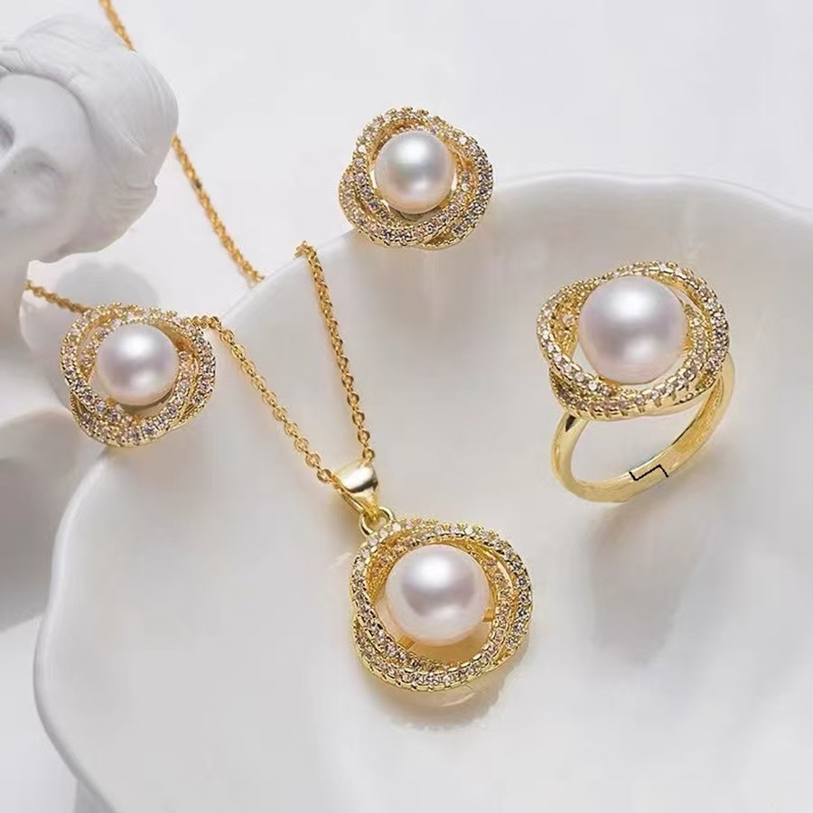 2025 New Flower Rich Petal Necklace Ring Earrings suit Wrap Pearl Light Luxury Jewelry Clavicle Chain