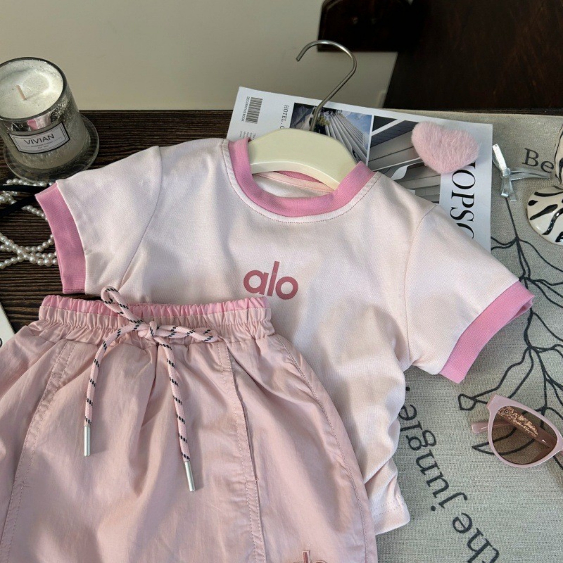 Ningli Korean children's clothing new summer girls color matching letter short sleeve T-shirt children's pink culottes two-piece trendy