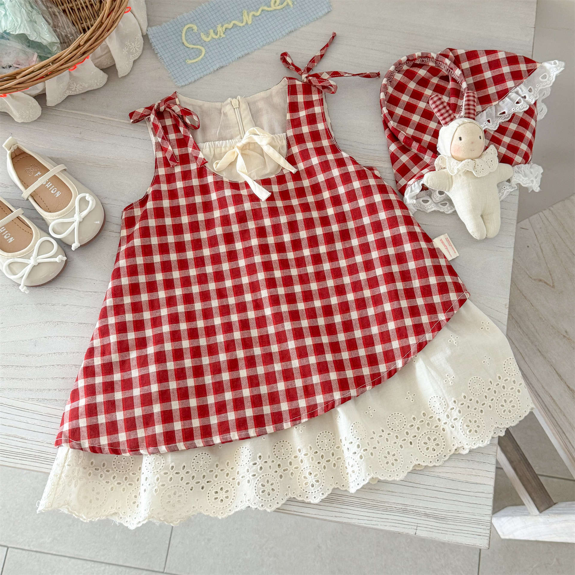 [Free Headband] Children's Clothing Girls Red Plaid Cotton Dress Summer New Style Kidsren's Baby Girl Vest Dress