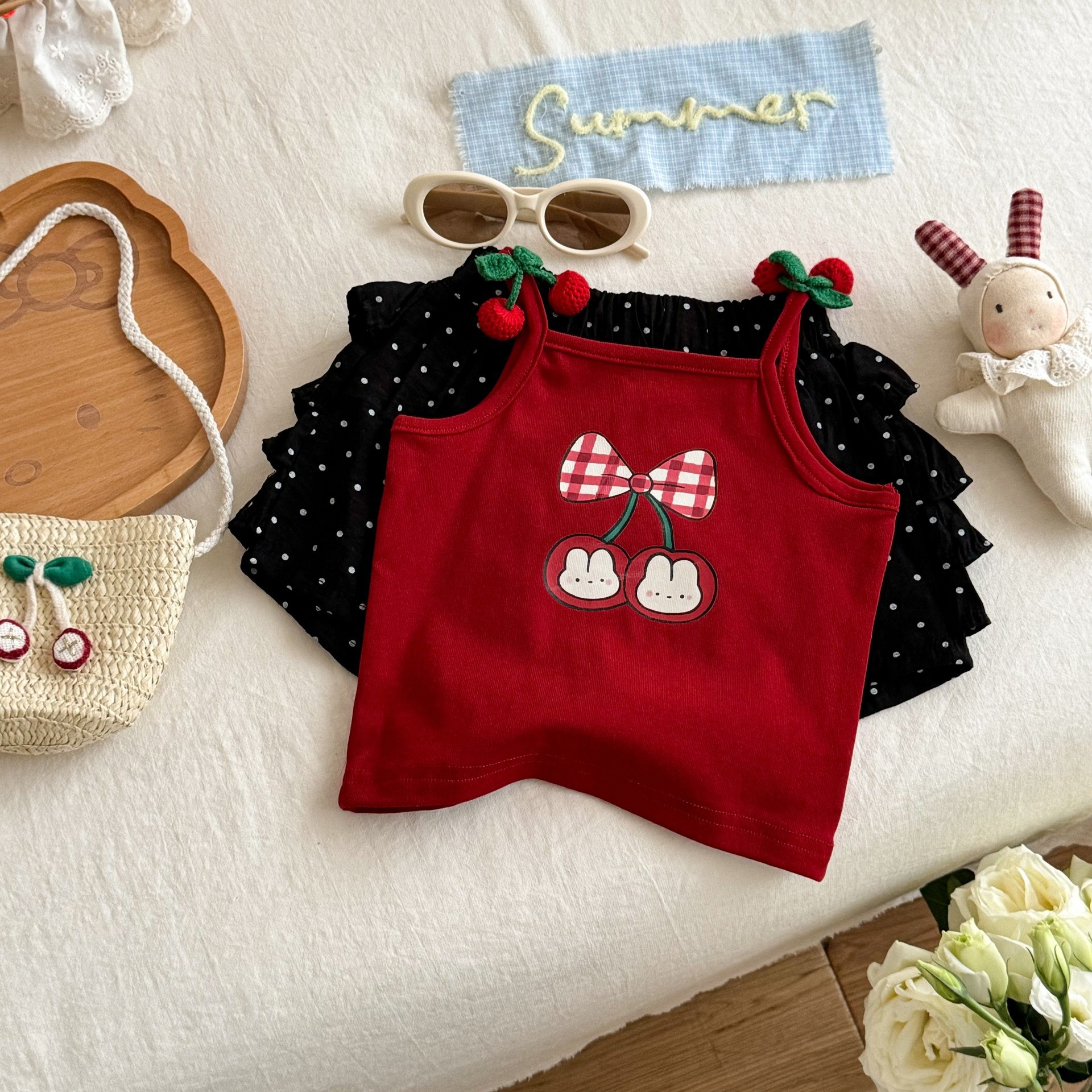 [Nengli] 2026 Summer Girls' Cute Cartoon Print Sleeveless Top and Polka Dot Bowknot Bloomers Set