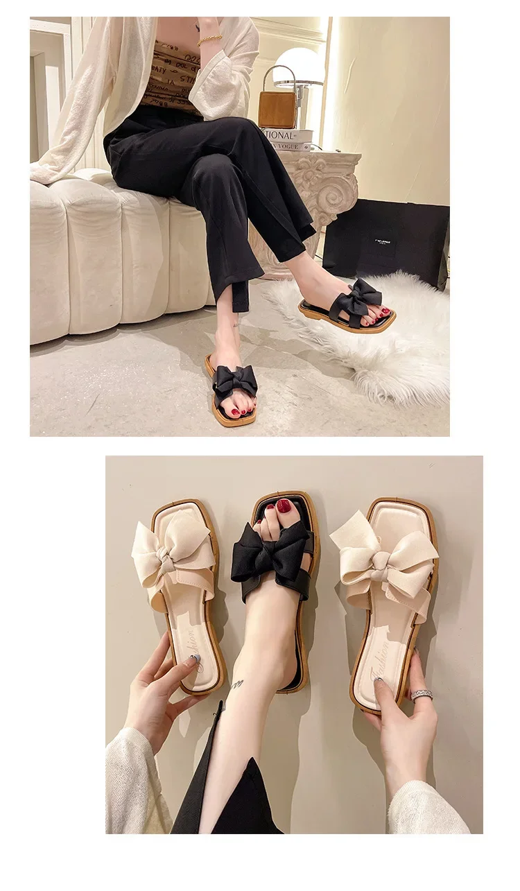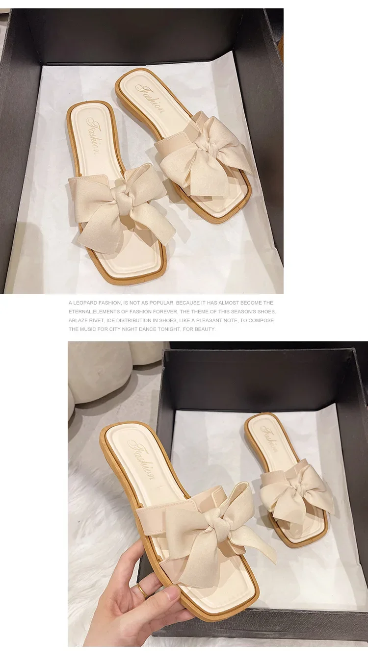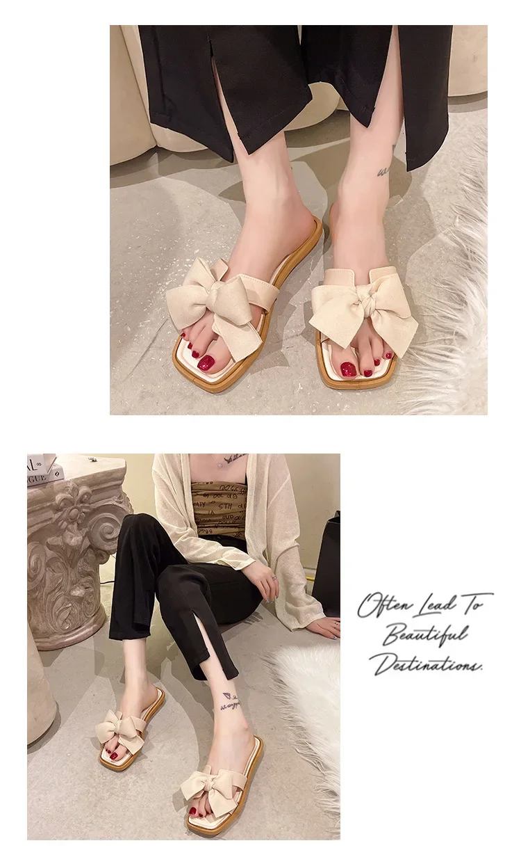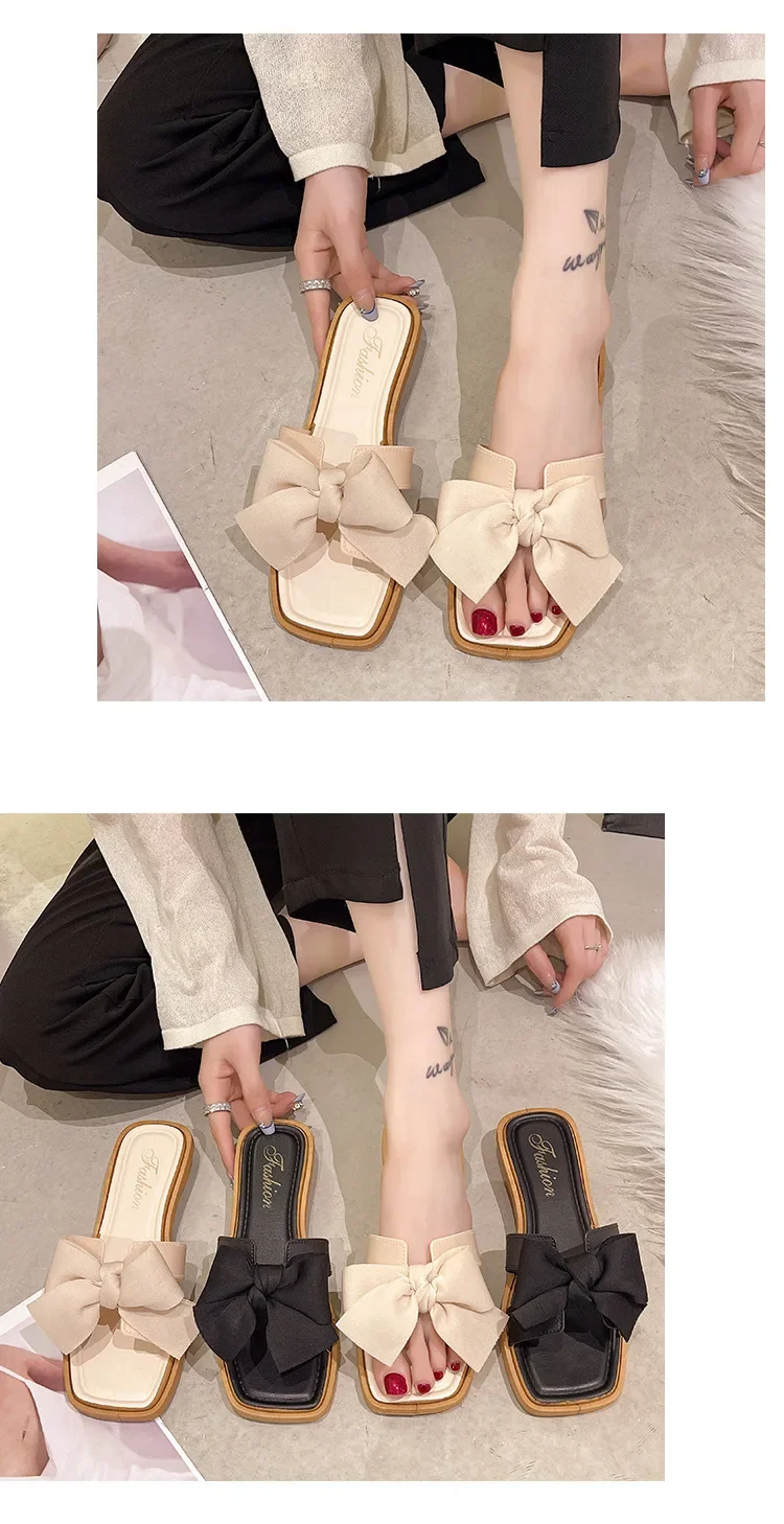2025 New Bow Slippers Women's Summer Flat Outerwear Casual Fairy Style Beach Versatile One-Line Sandals