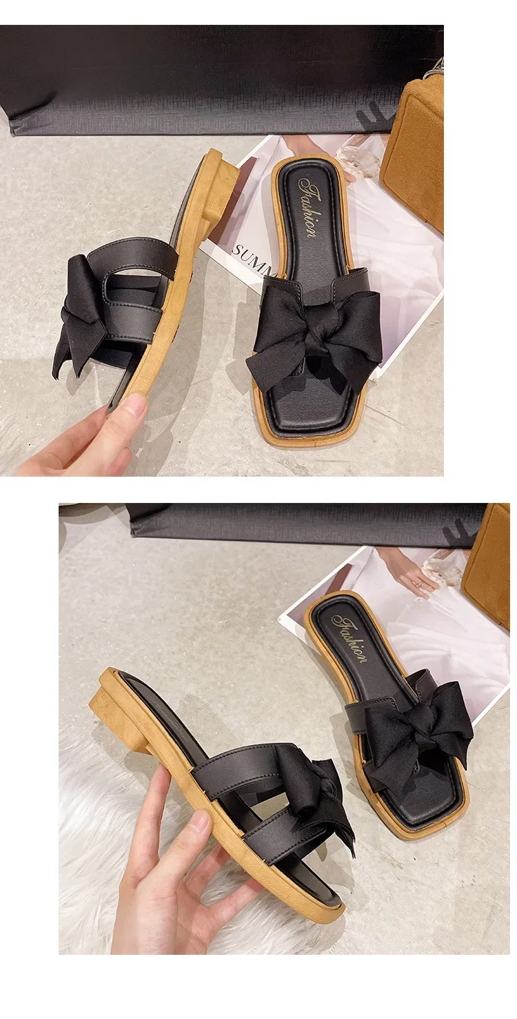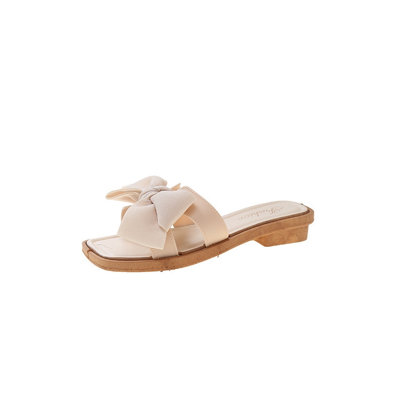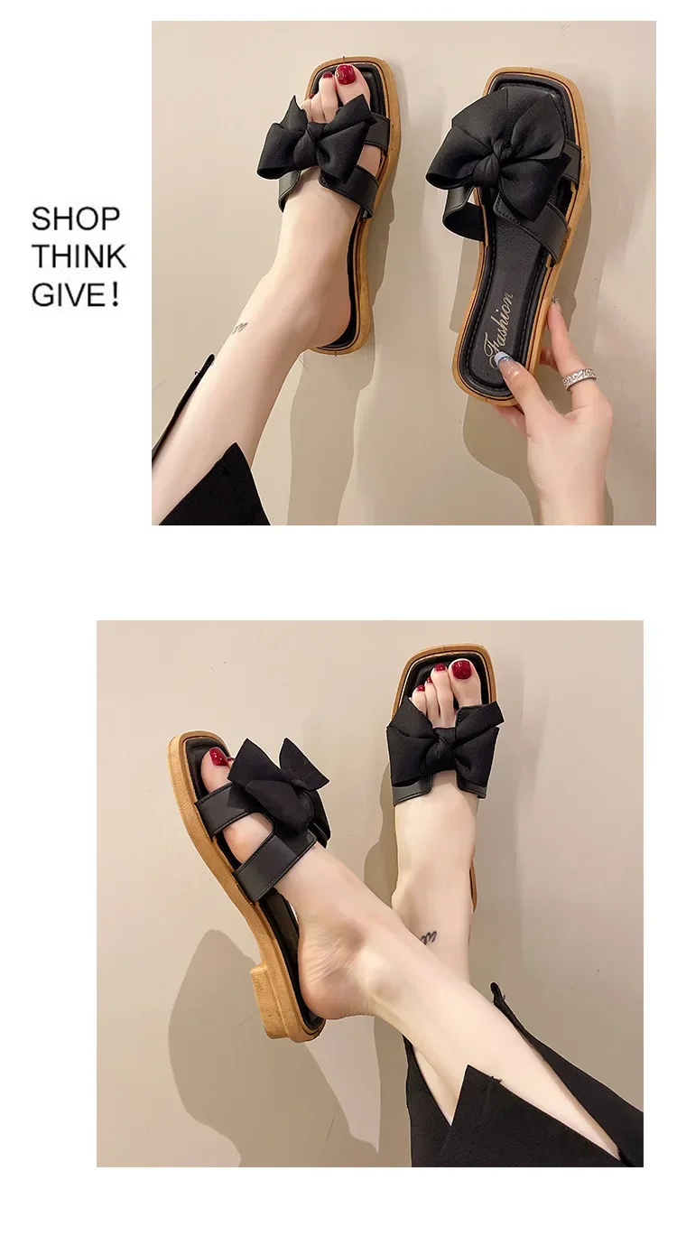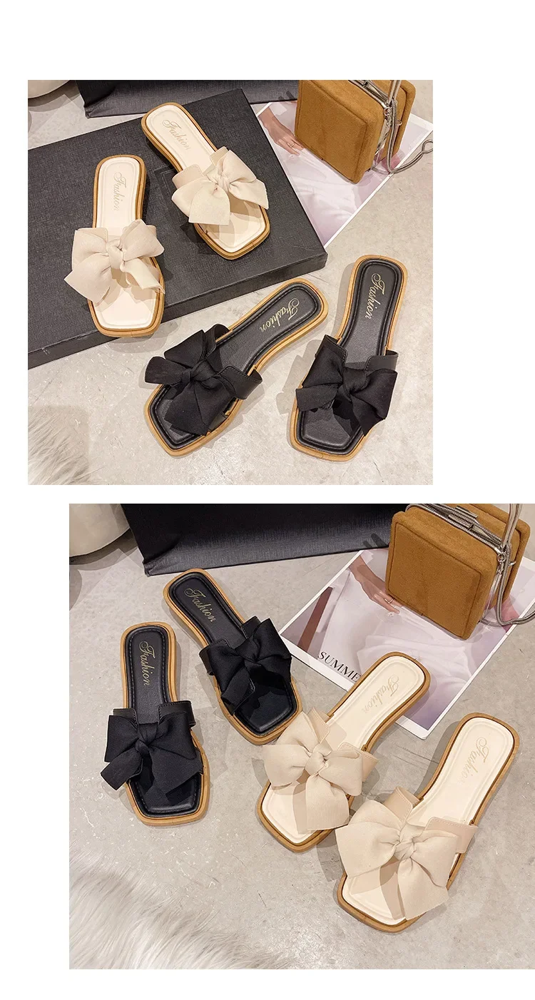2025 New Bow Slippers Women's Summer Flat Outerwear Casual Fairy Style Beach Versatile One-Line Sandals