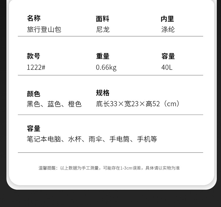 | Lining texture | Nylon | Carrying system | Physiological curve back panel |