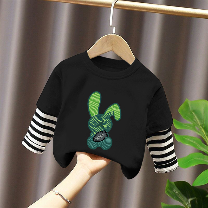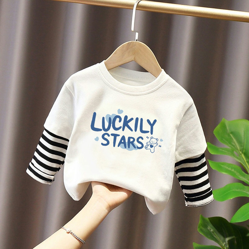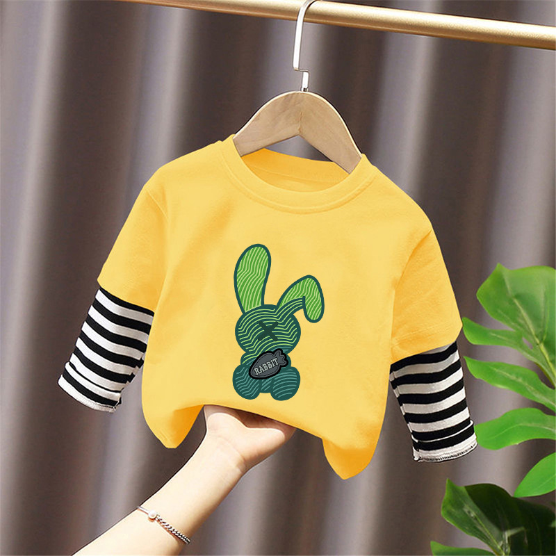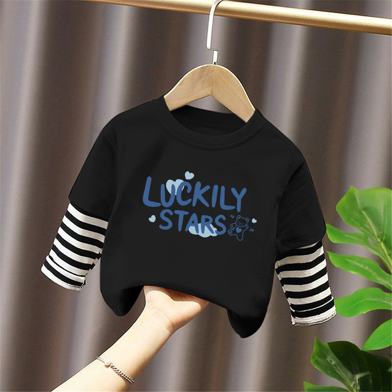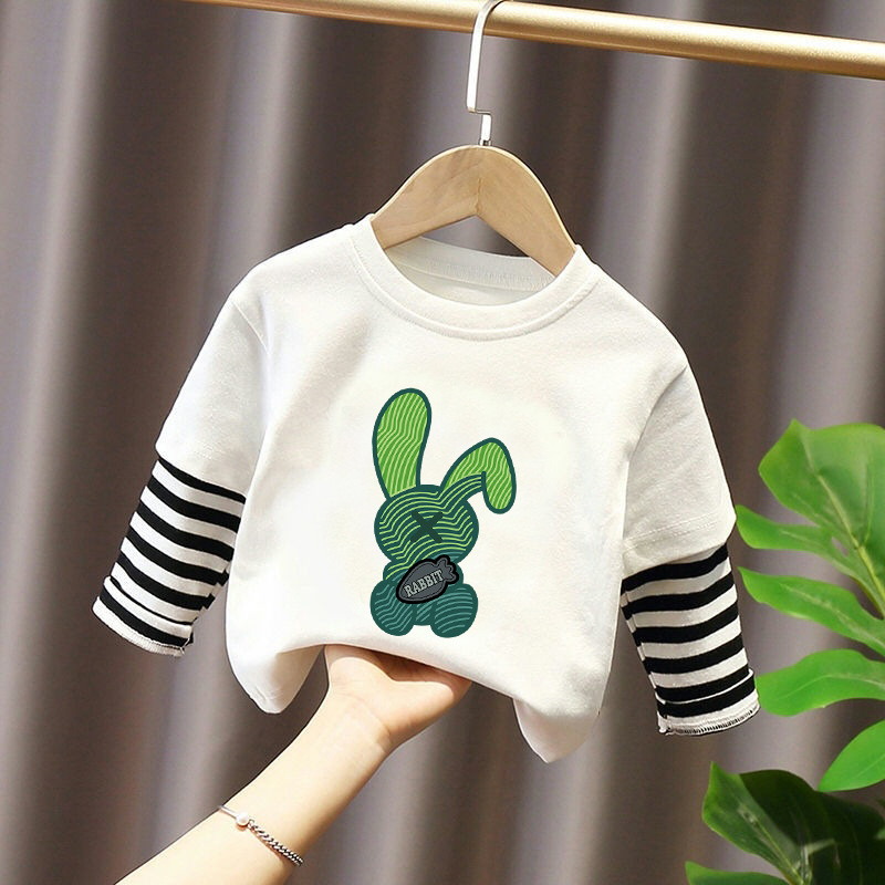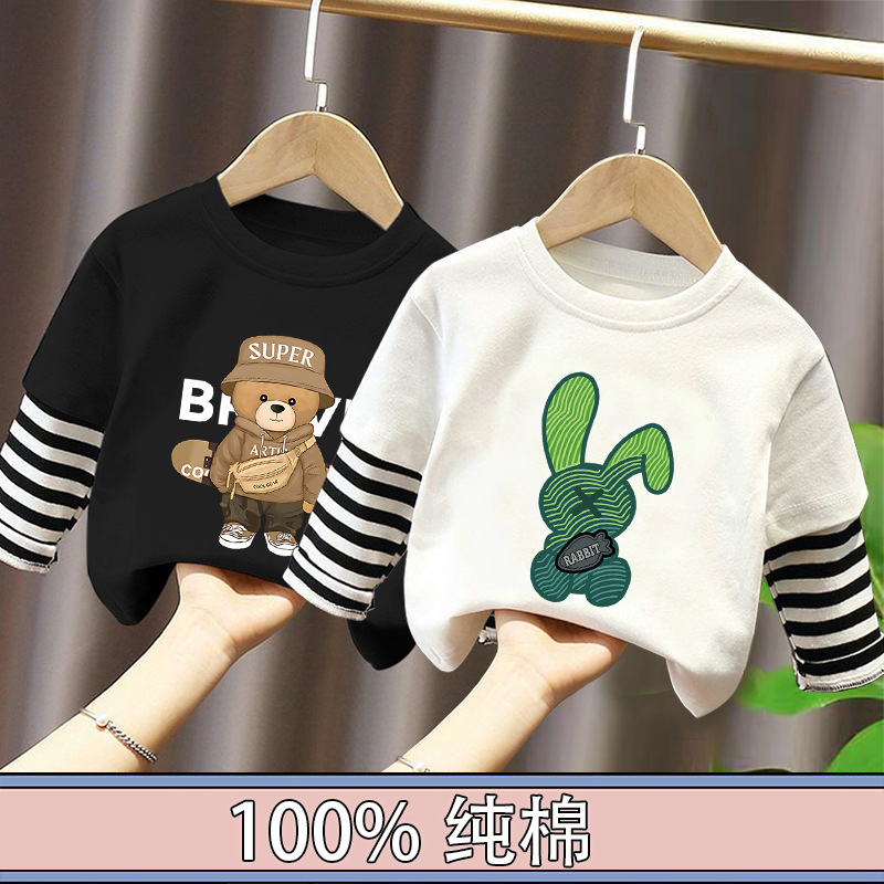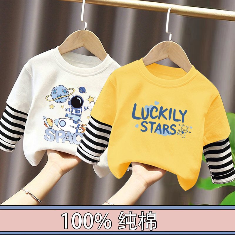 Children's Long-Sleeved T-Shirt Pure Cotton 2025 New Spring and Autum Boys' Fake Two-Piece Spliced Sleeve Tops Baby Bottoming Shirt