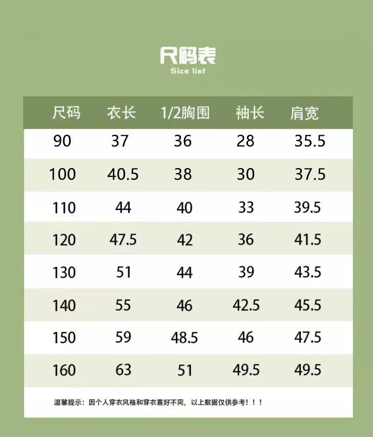| Sleeve length | Long sleeves | Suitable for age group | Infants and young children (1~3 years old, 80~100cm) |