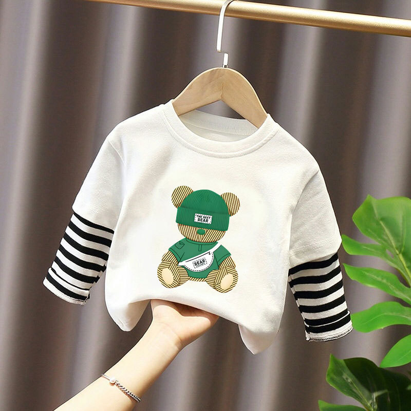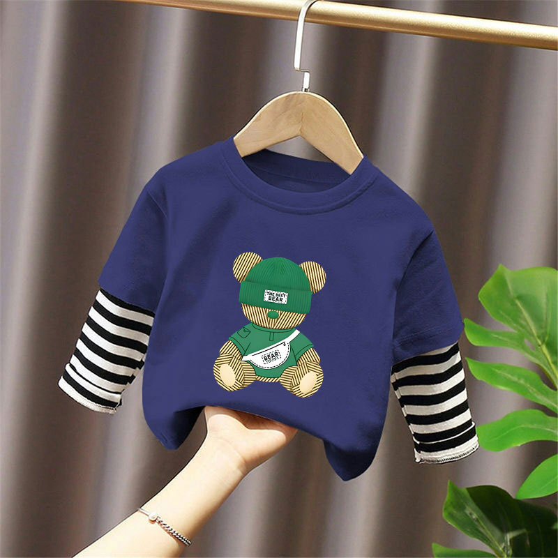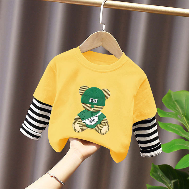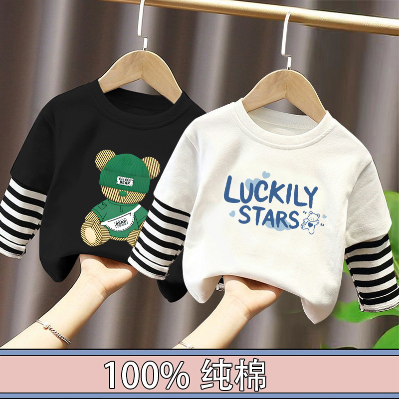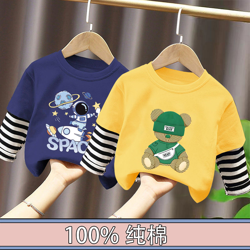 Children's Long-Sleeved Cartoon T-Shirt 2025 Spring & Fall New Style Boys' Pure Cotton Fake Two-Piece Tops, Fashionable and Cute Bottoming Shirts