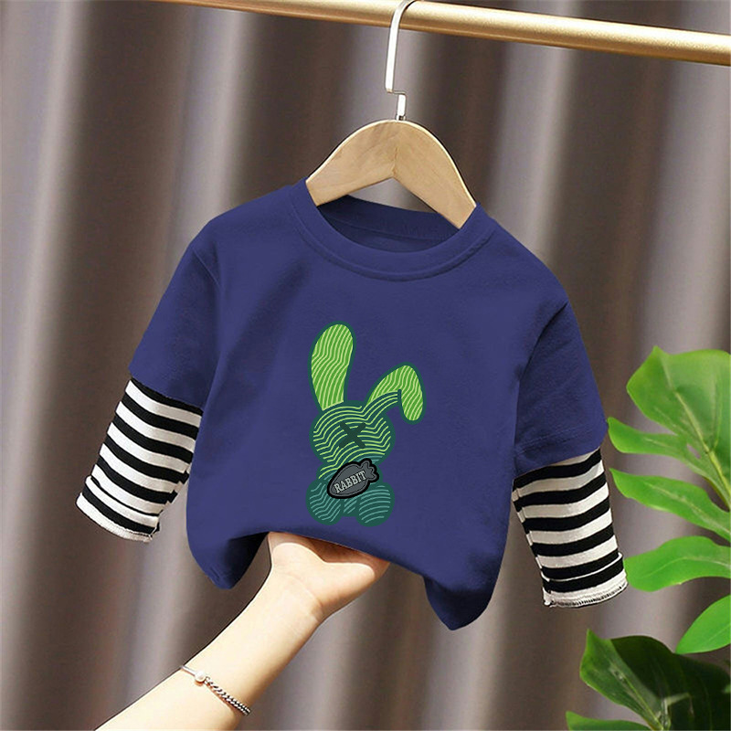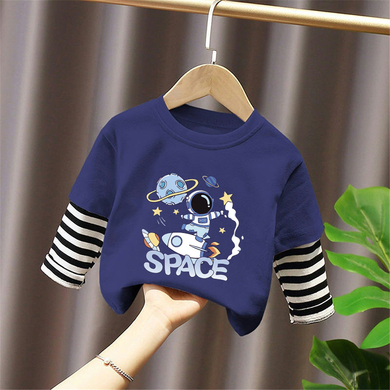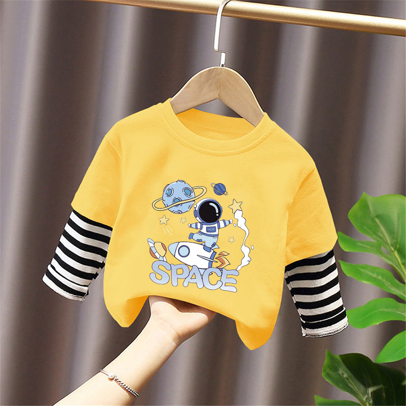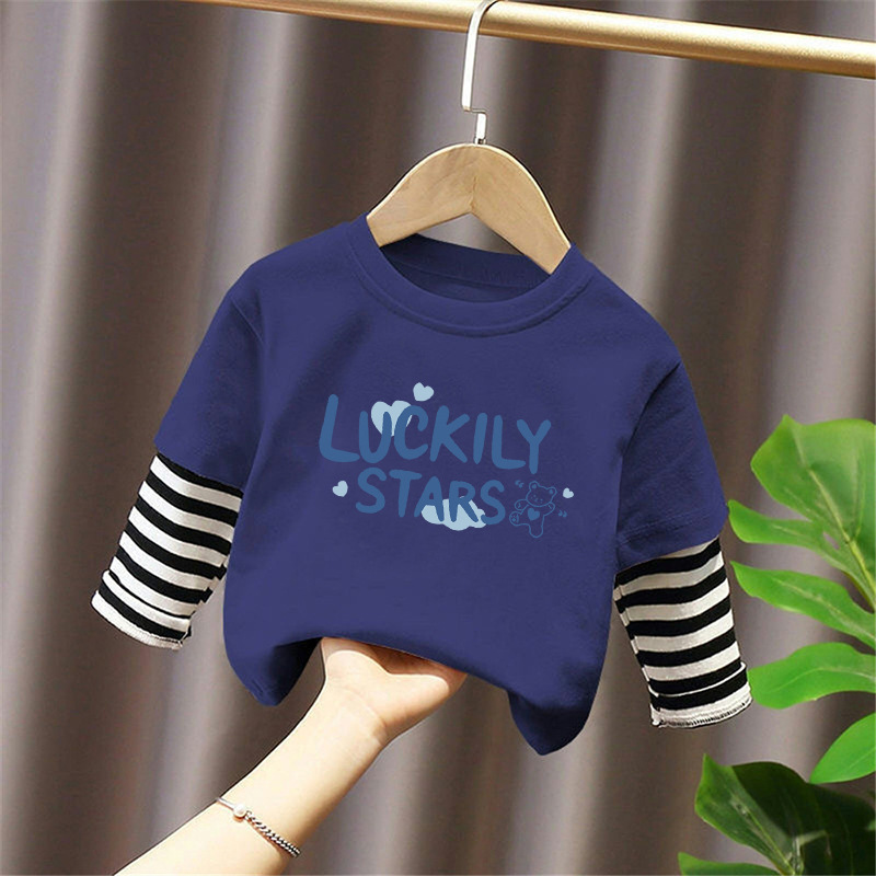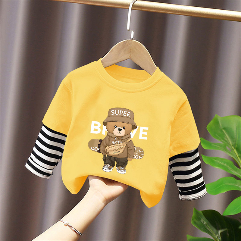 Children's Long-Sleeved Cartoon T-Shirt 2025 Spring & Fall New Style Boys' Pure Cotton Fake Two-Piece Tops, Fashionable and Cute Bottoming Shirts