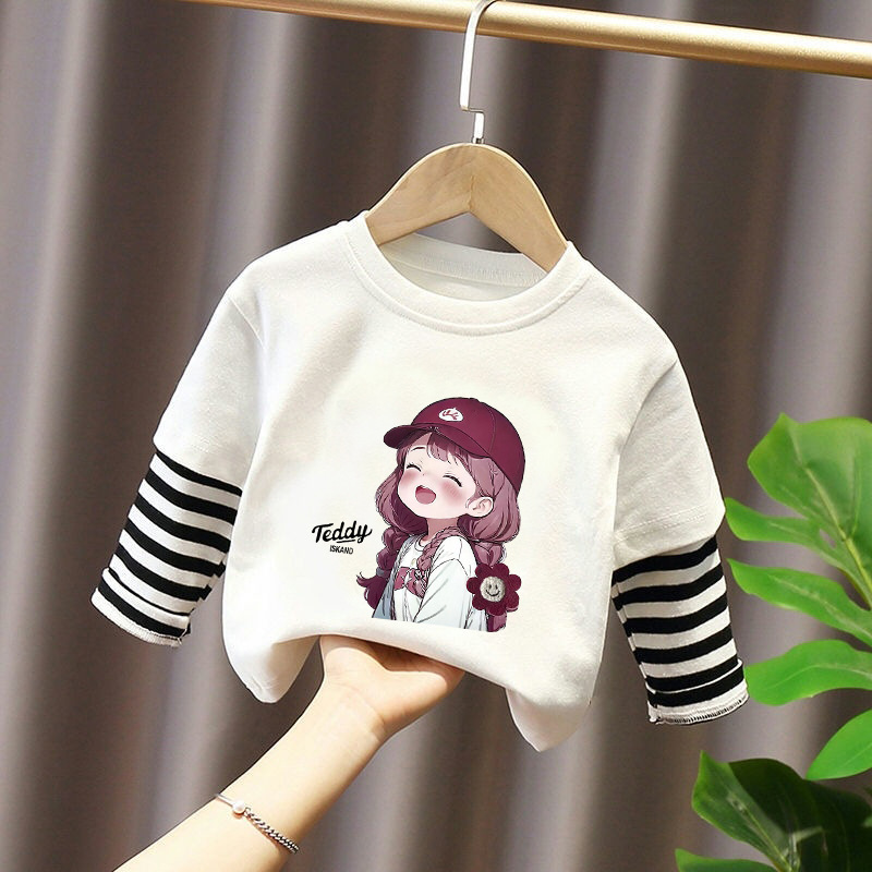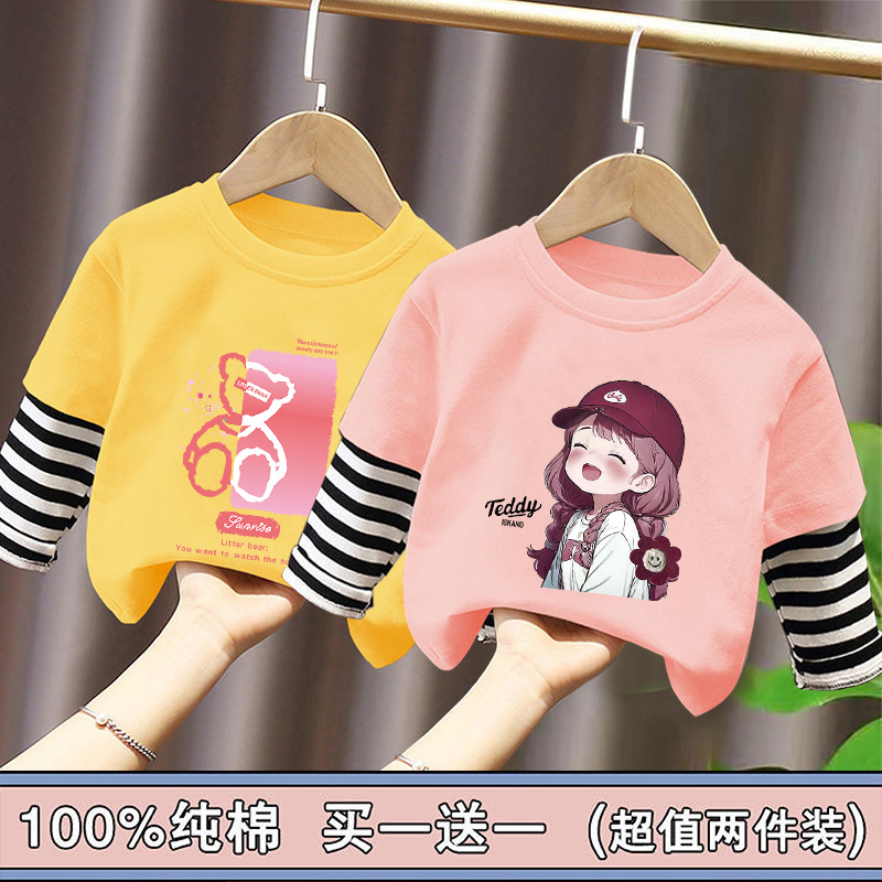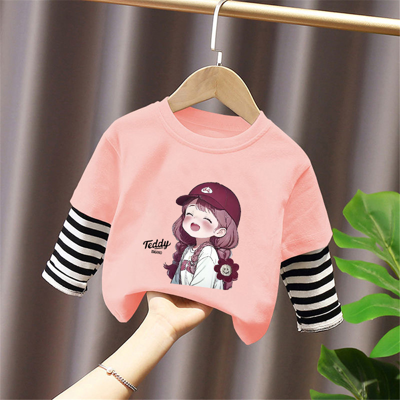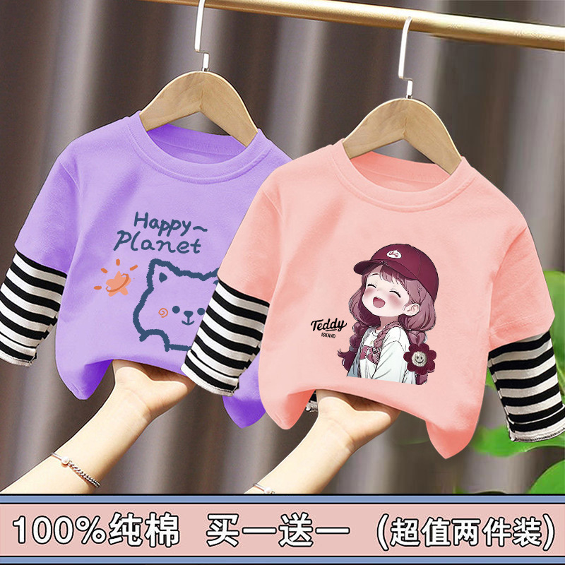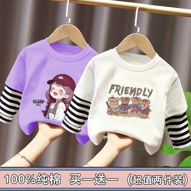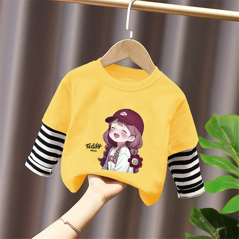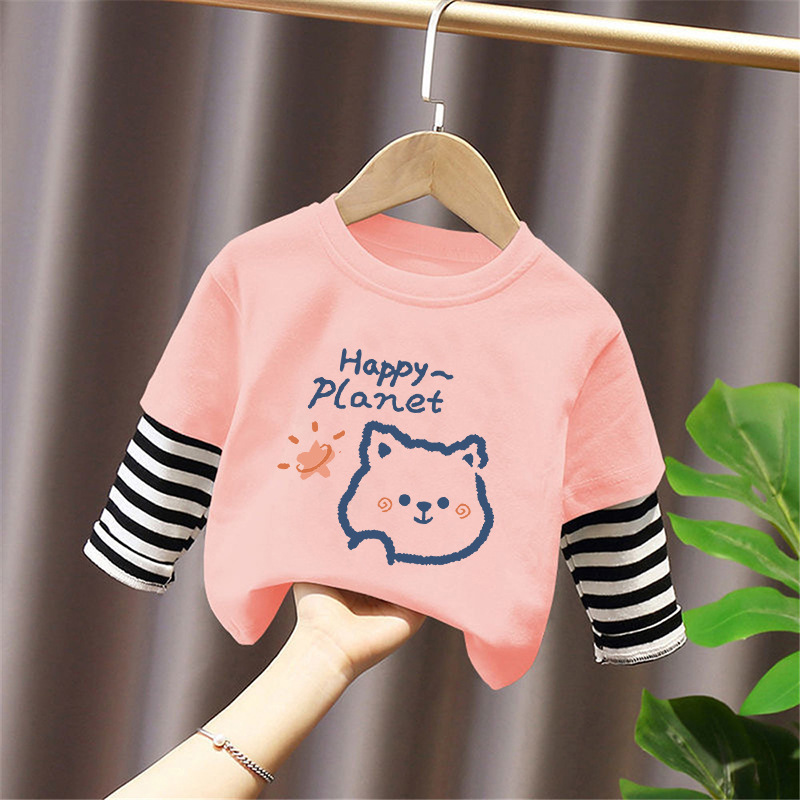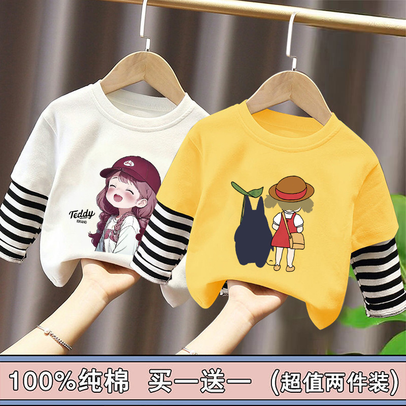 Spring and Autumn New Style 100% Cotton Girls' Fake Two-Piece Long-Sleeved T-Shirts Children's Cartoon Cute Printed Contrast Color Tops for Women