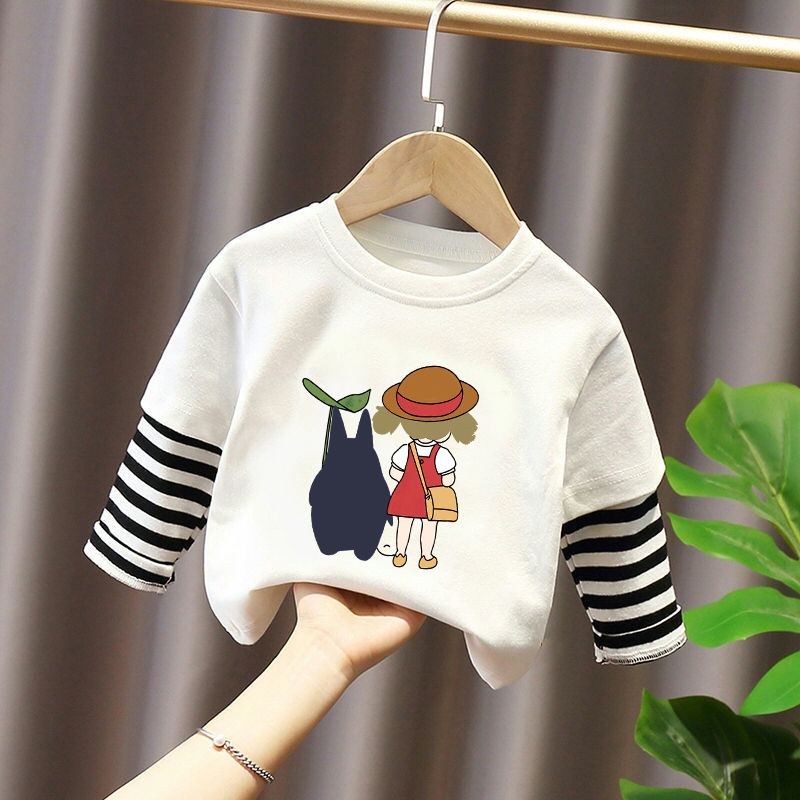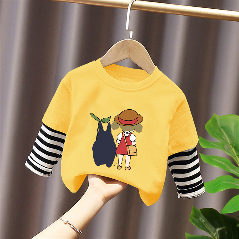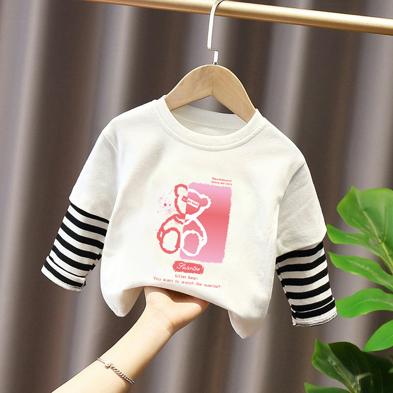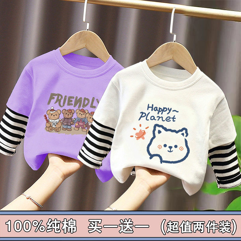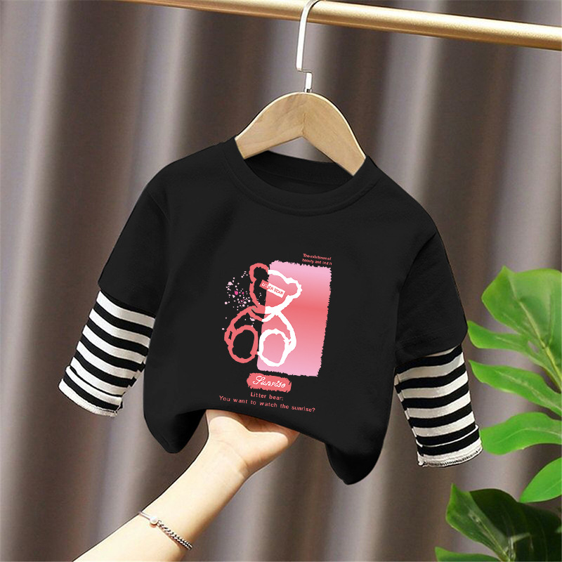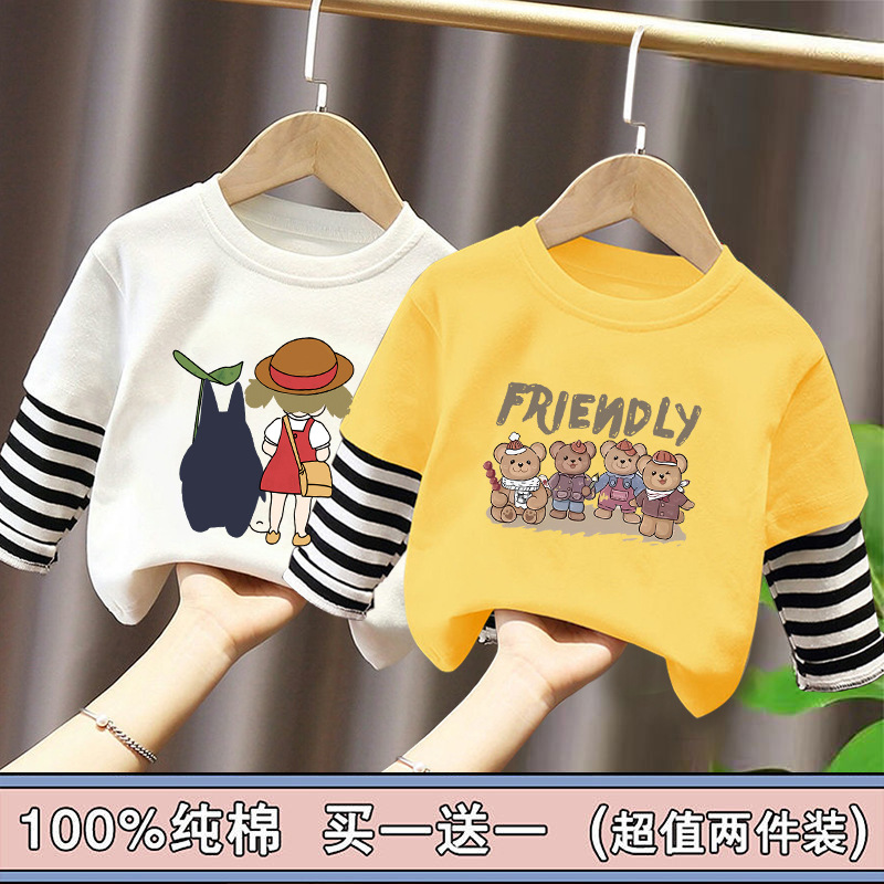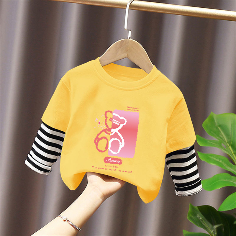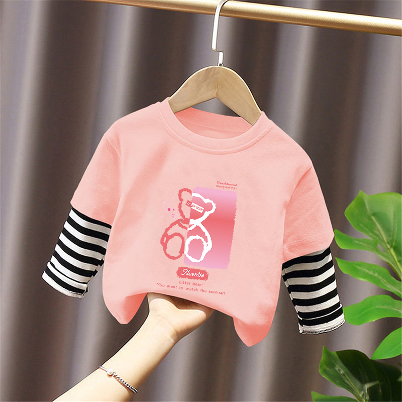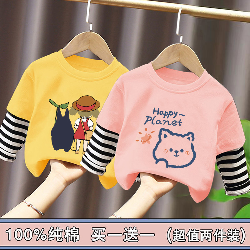 Spring and Autumn New Style 100% Cotton Girls' Fake Two-Piece Long-Sleeved T-Shirts Children's Cartoon Cute Printed Contrast Color Tops for Women