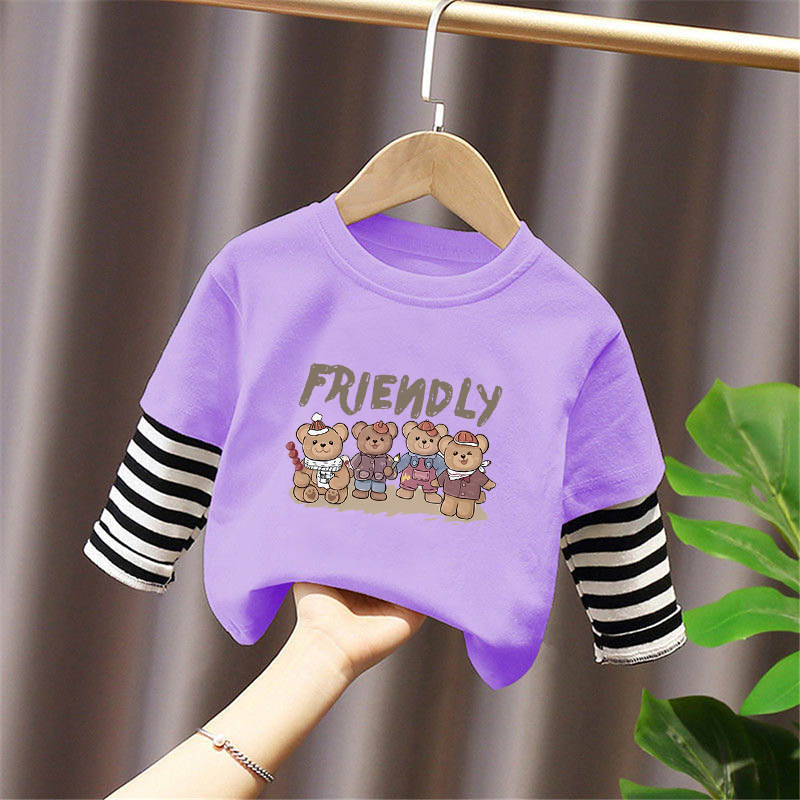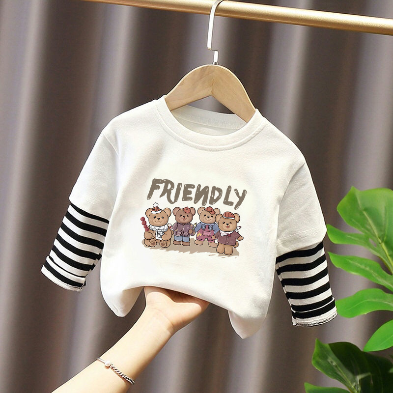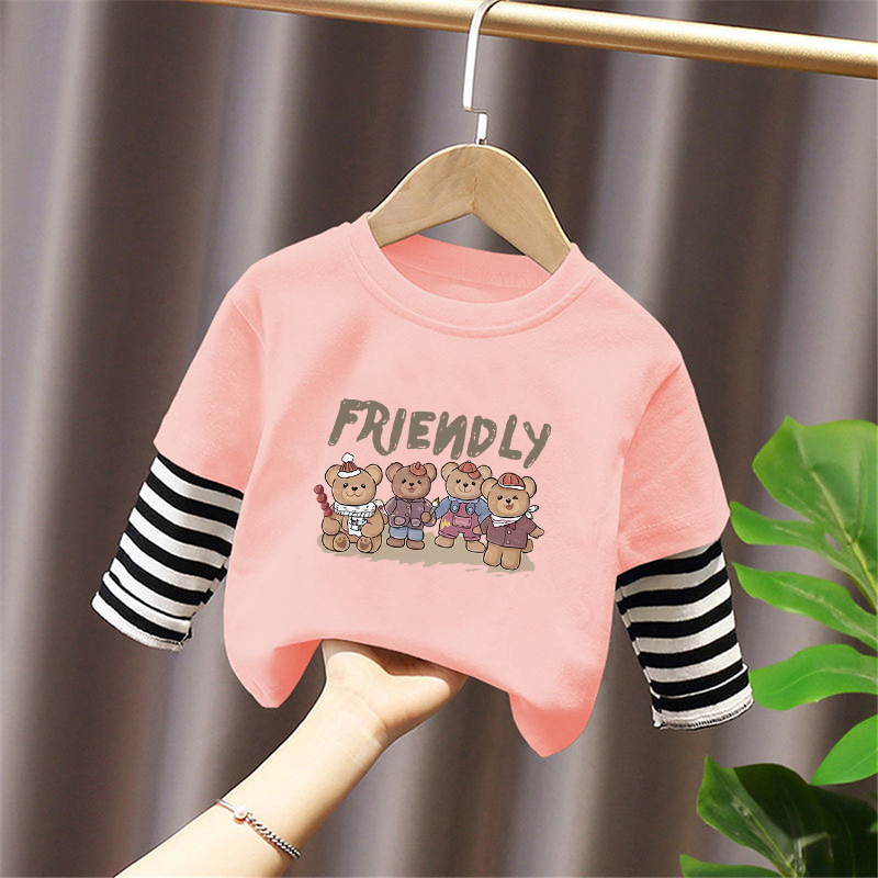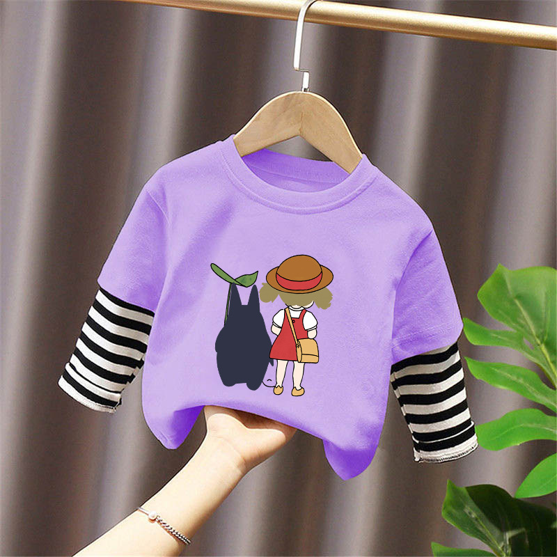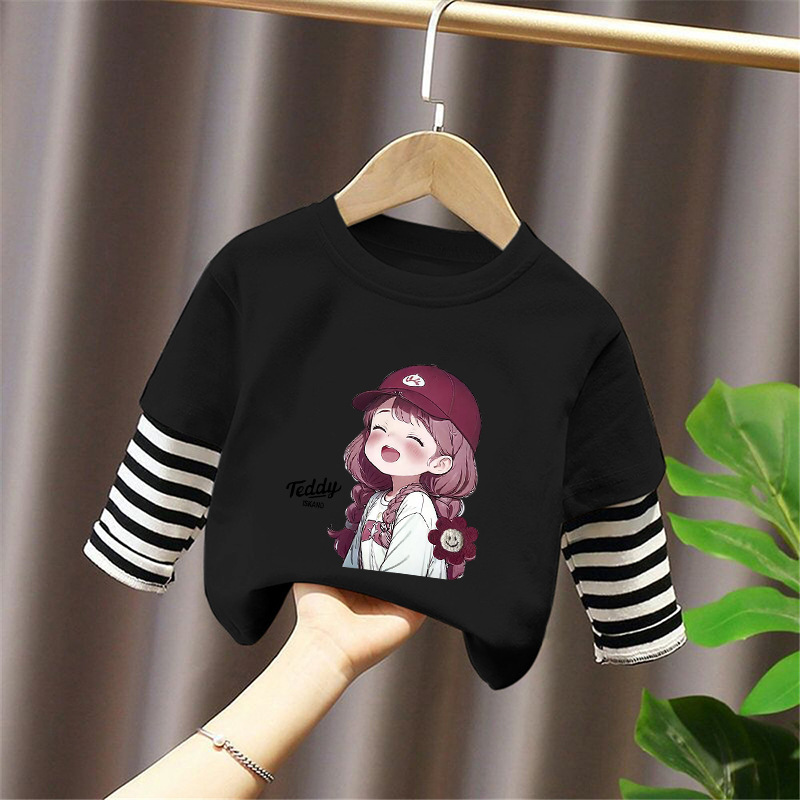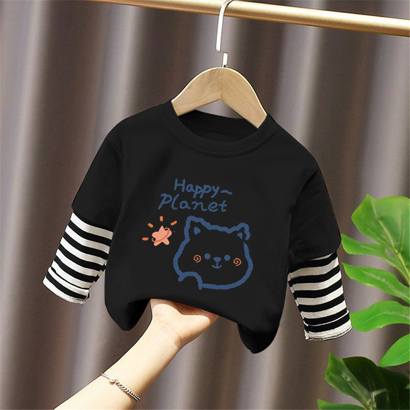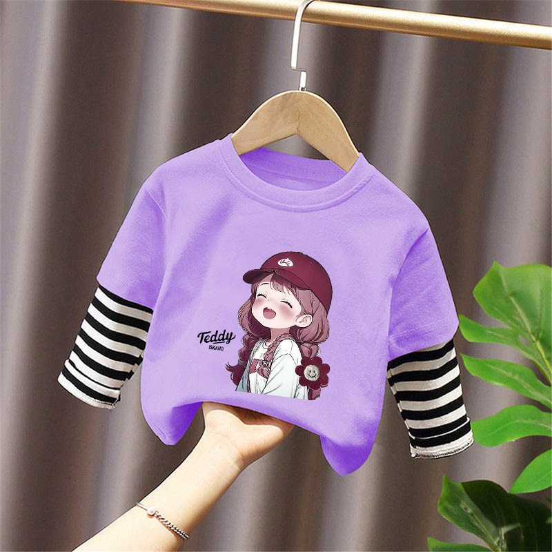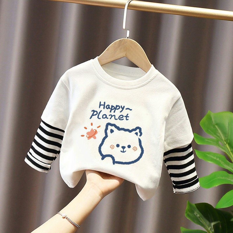 Spring and Autumn New Style 100% Cotton Girls' Fake Two-Piece Long-Sleeved T-Shirts Children's Cartoon Cute Printed Contrast Color Tops for Women