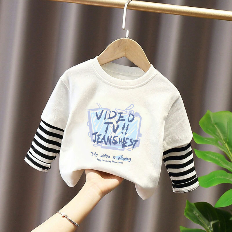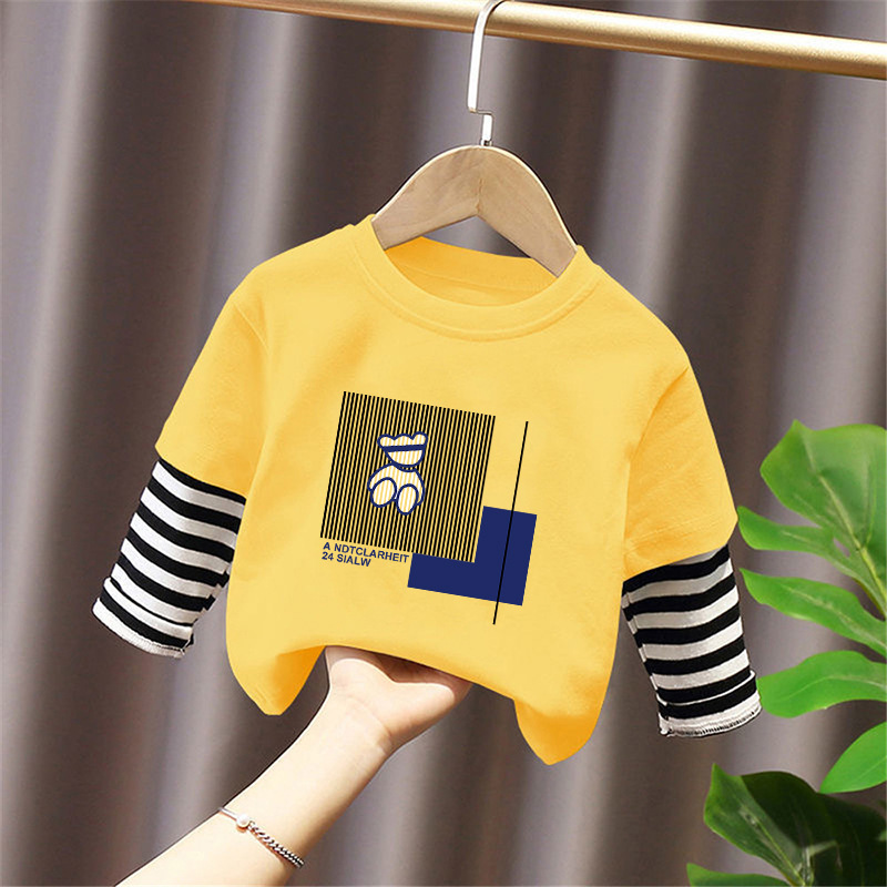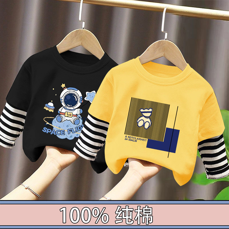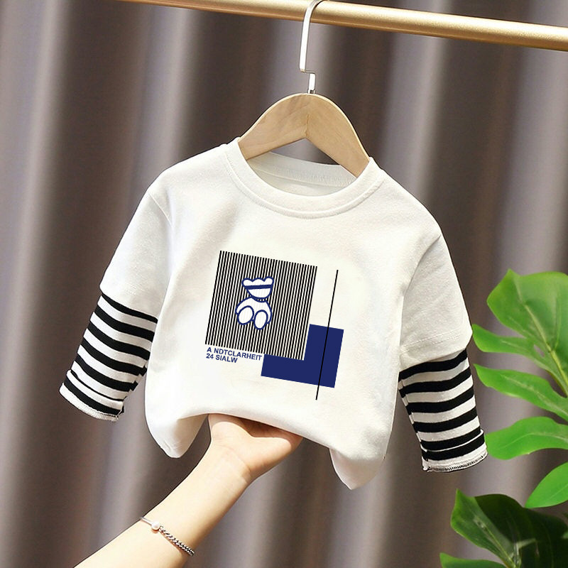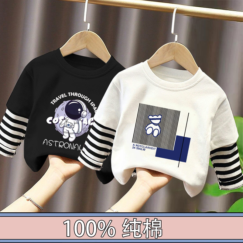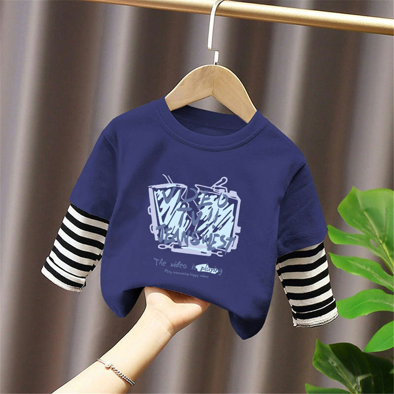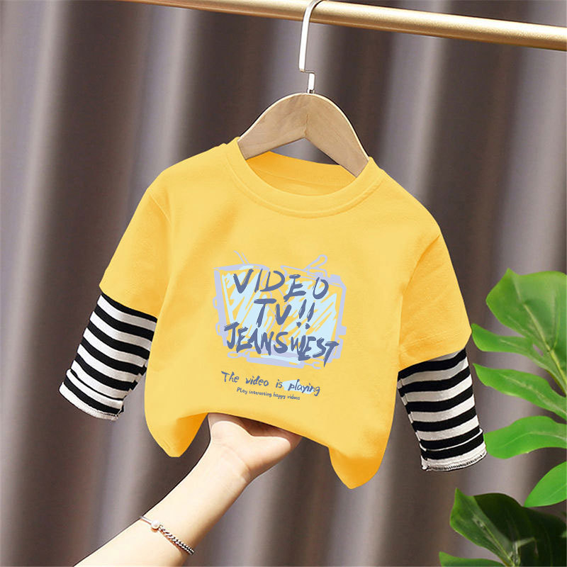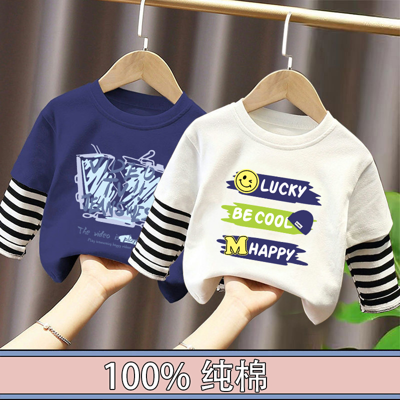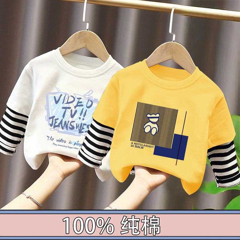 100% Cotton Boys' Fake Two-Piece Long-Sleeved T-Shirt Spring and Autum New Style Kidsren's Baby Fashionable Versatile Casual Tops