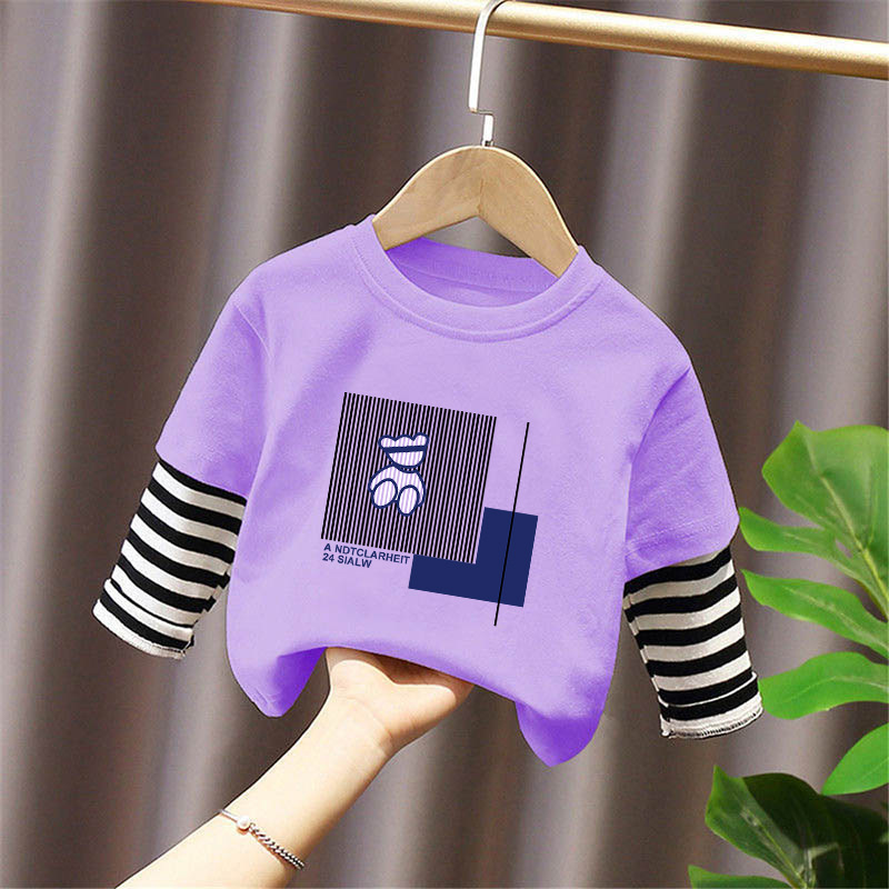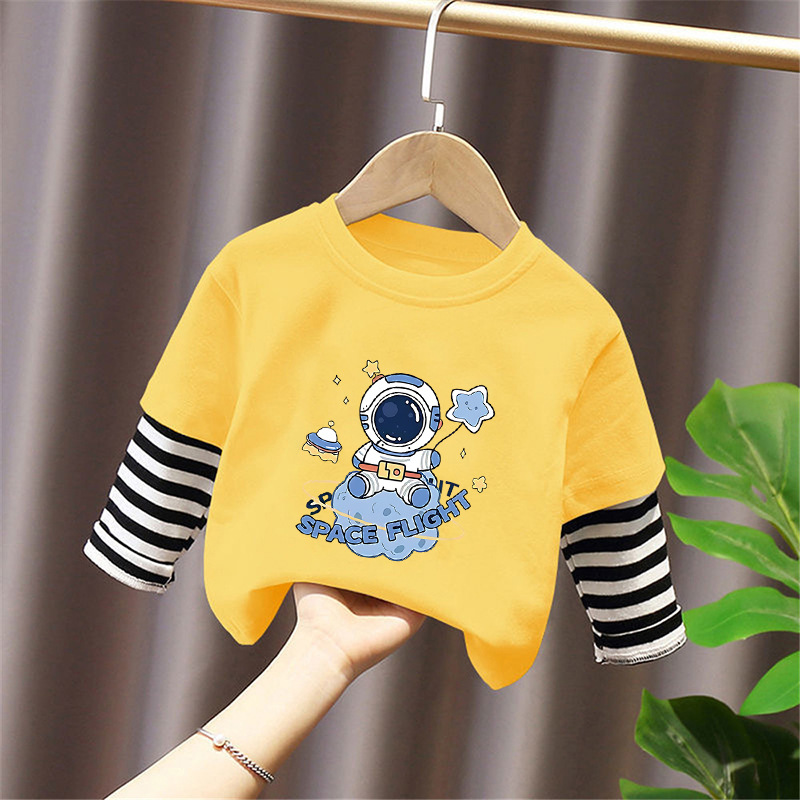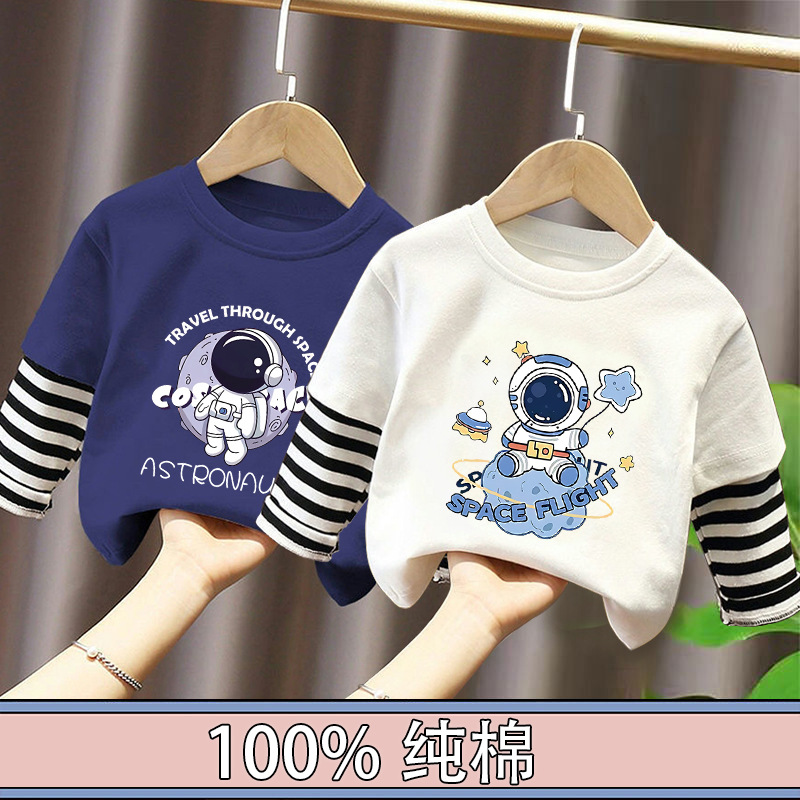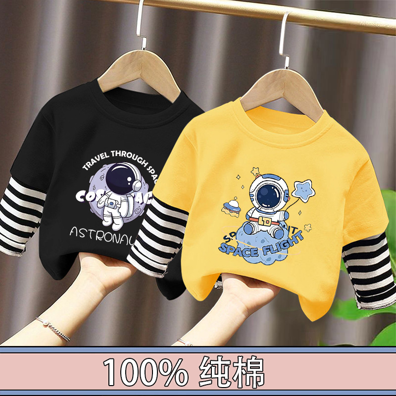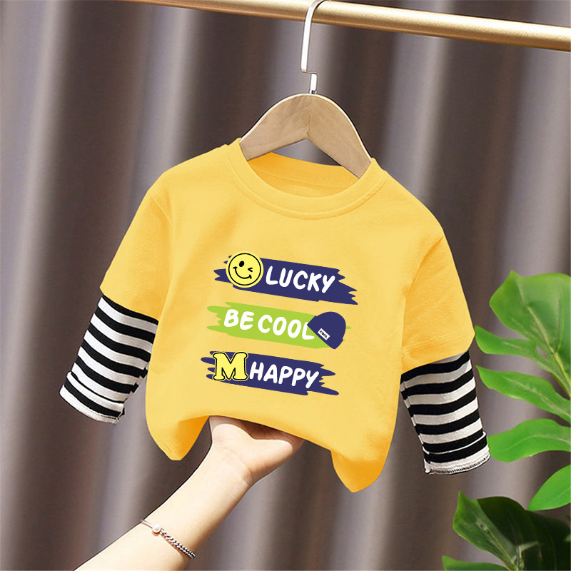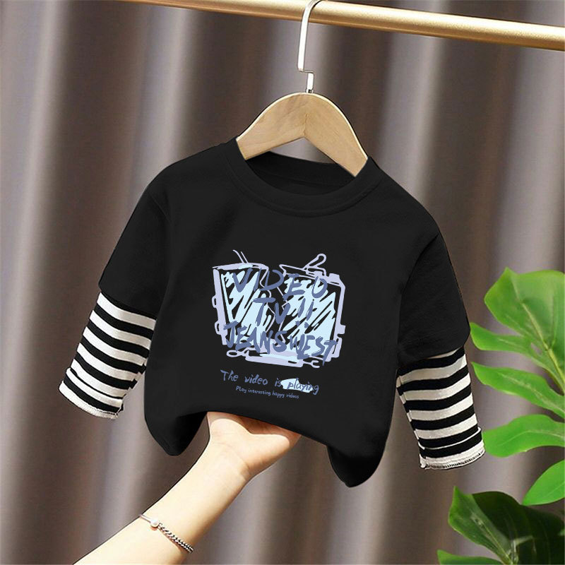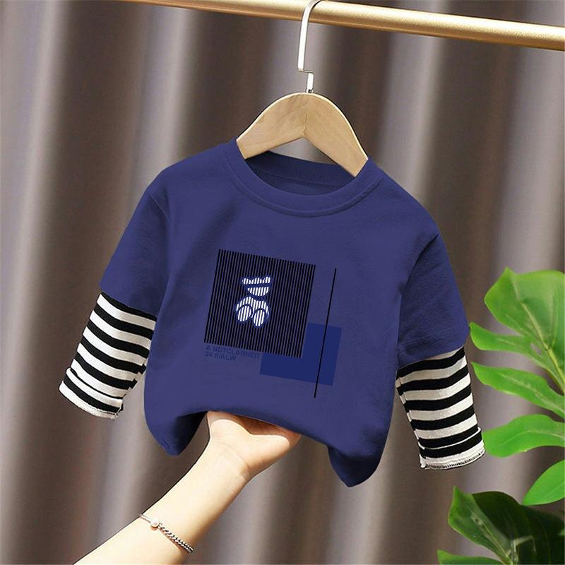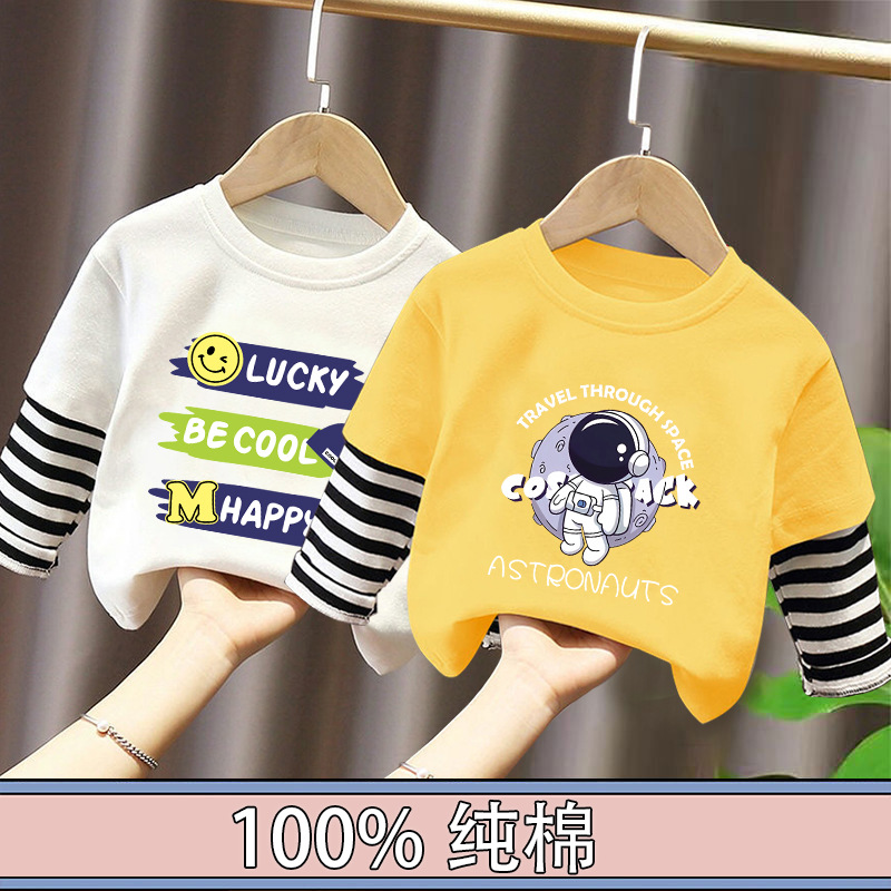 100% Cotton Boys' Fake Two-Piece Long-Sleeved T-Shirt Spring and Autum New Style Kidsren's Baby Fashionable Versatile Casual Tops