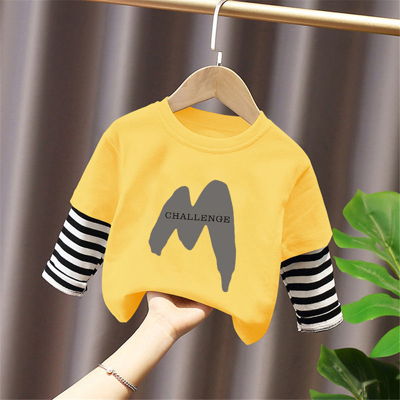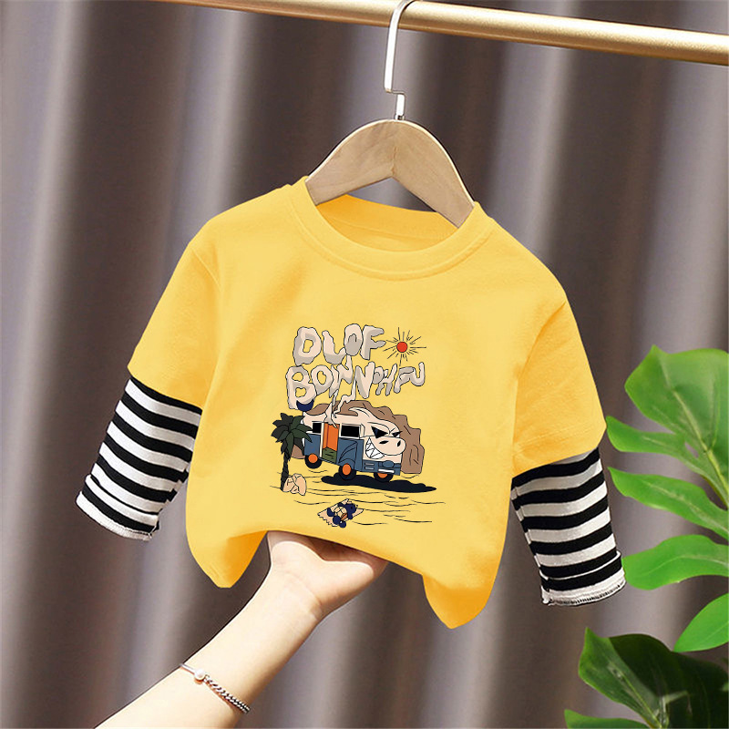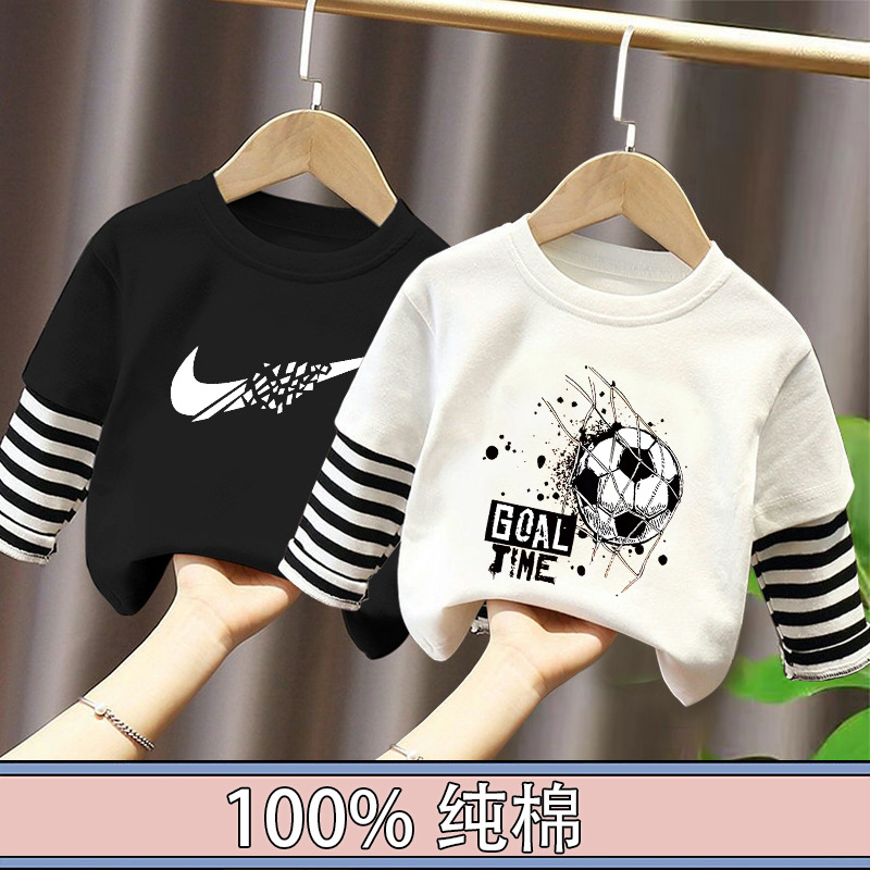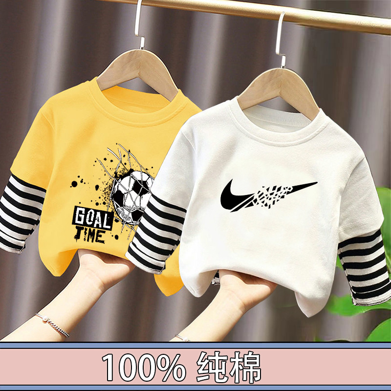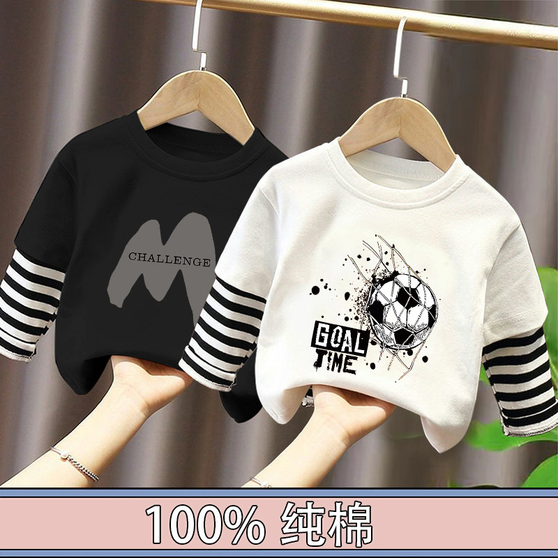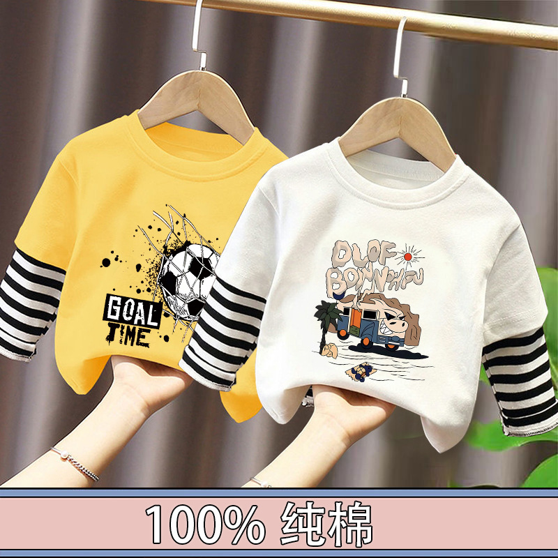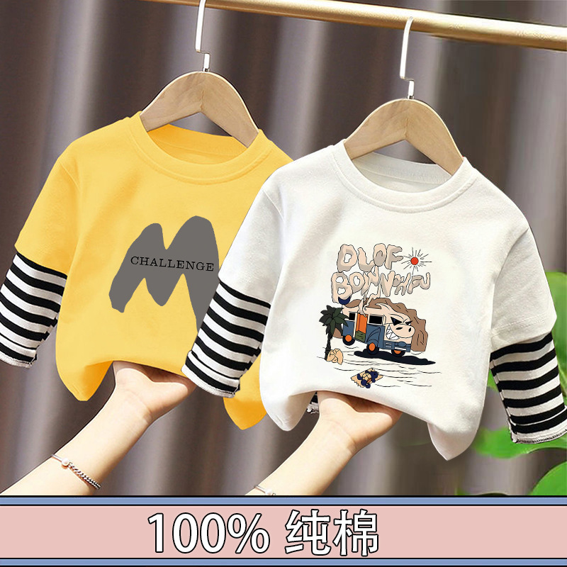 Boys' Long-Sleeve T-Shirt Children's Base Shirt Autumn Toddler Pure Cotton Autumn Outfit Baby Spring and Autumn Thin Style Boys' Faux Two-Piece T-Shirt