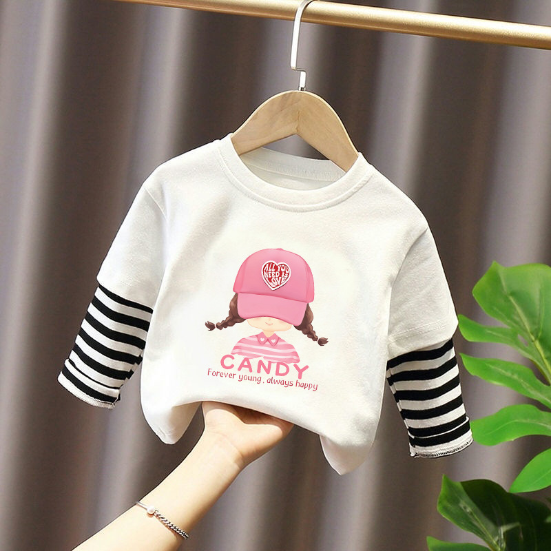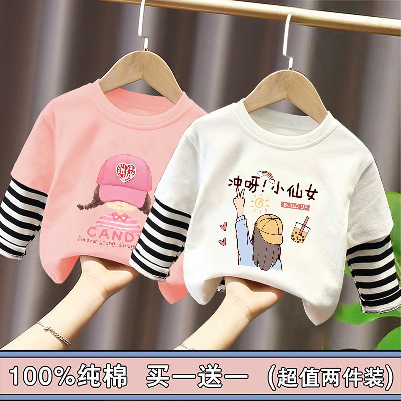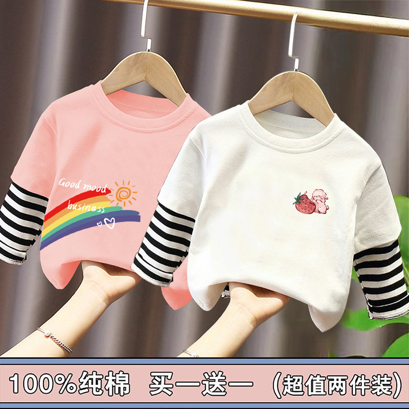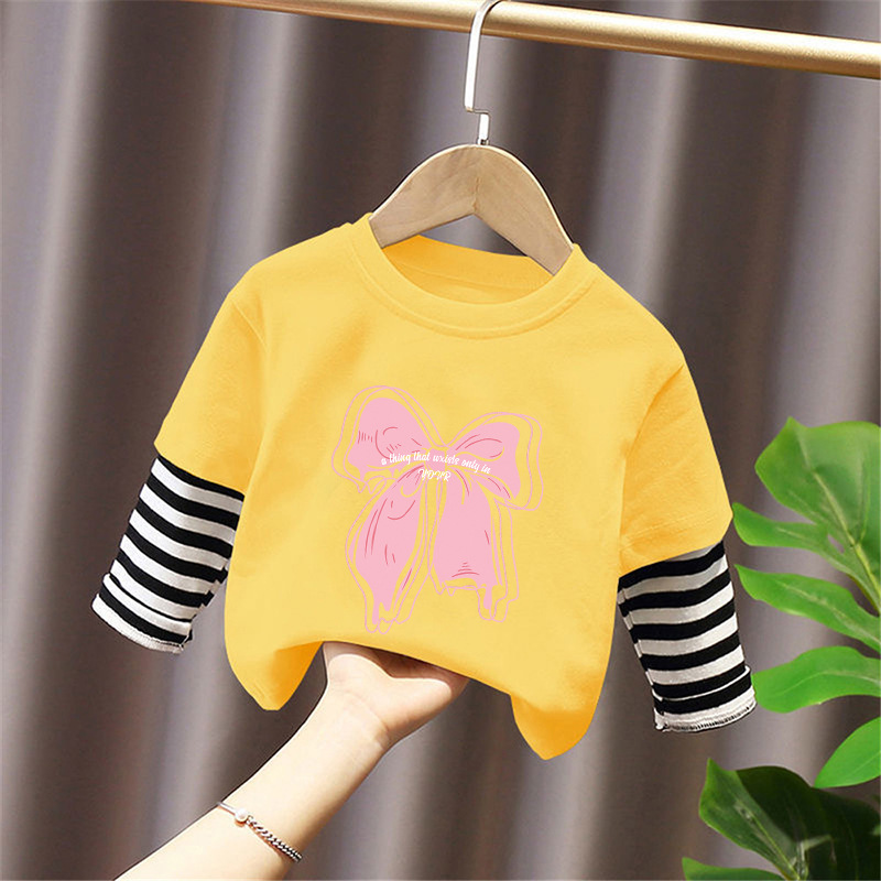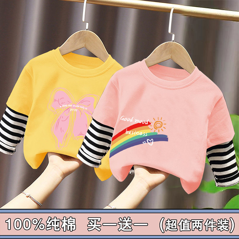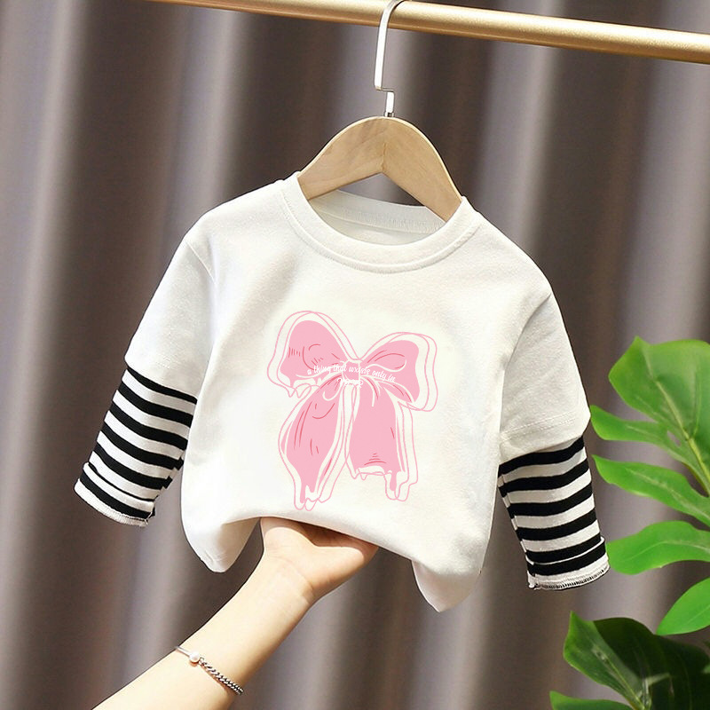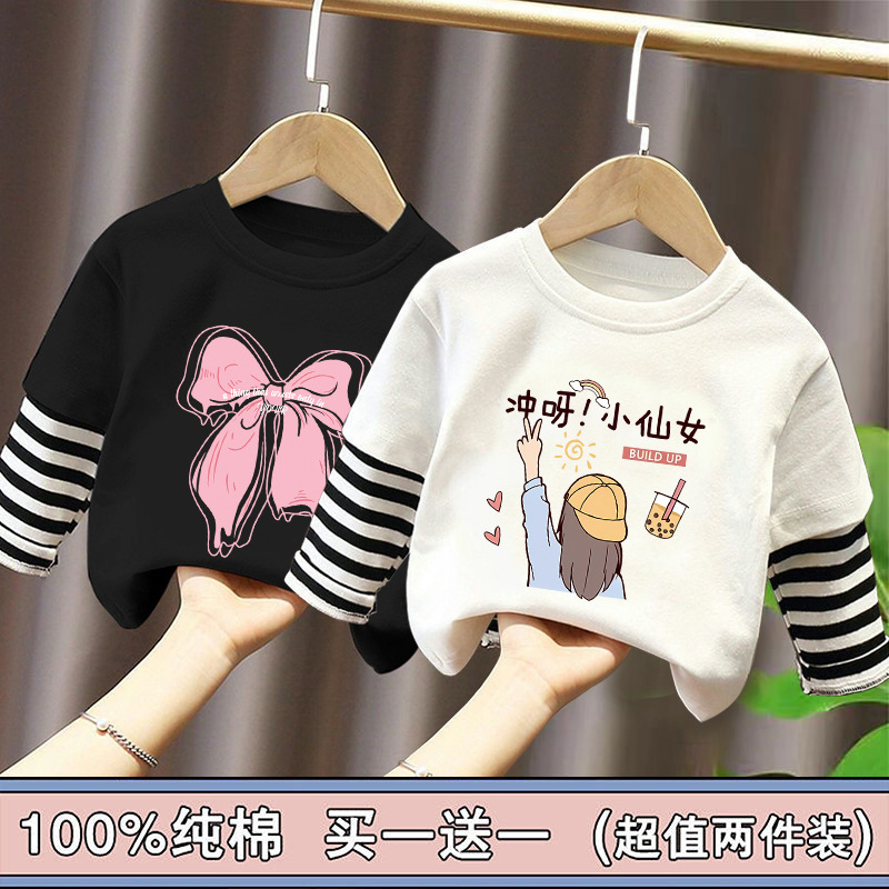 Girls' Pure Cotton Long-Sleeve T-Shirt, Faux Two-Piece Top, Stylish Children's Base Shirt, Medium and Large Children's Wear, 2025 Spring and Autumn New Model