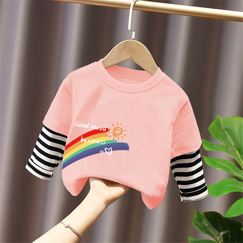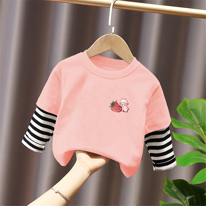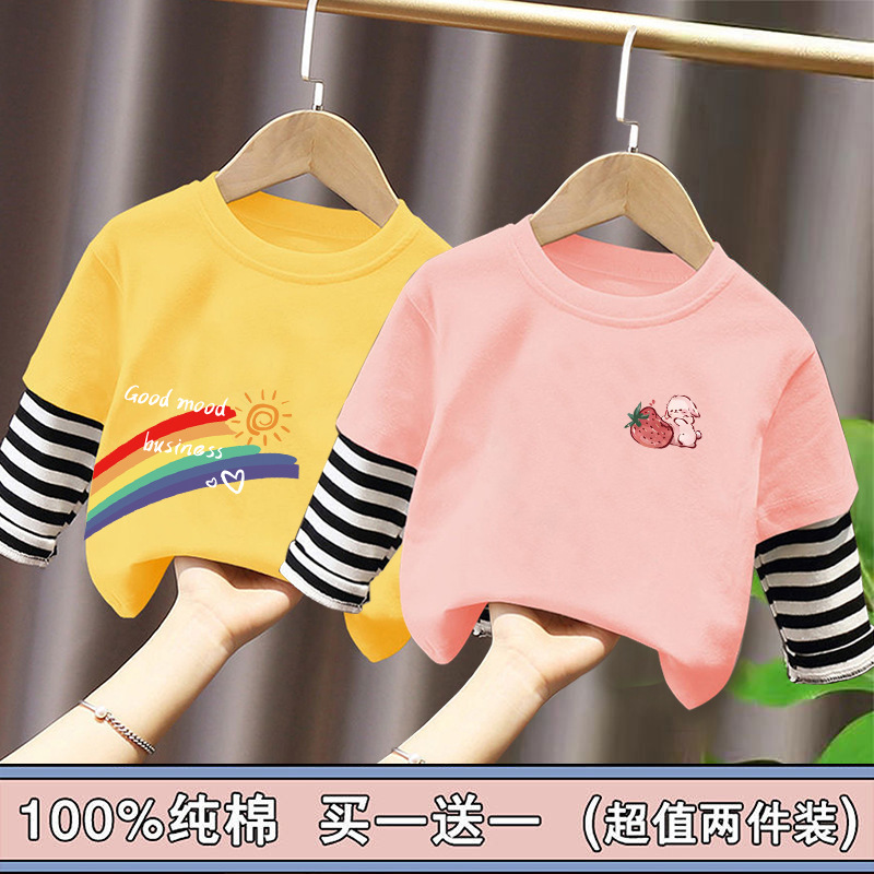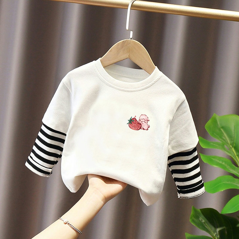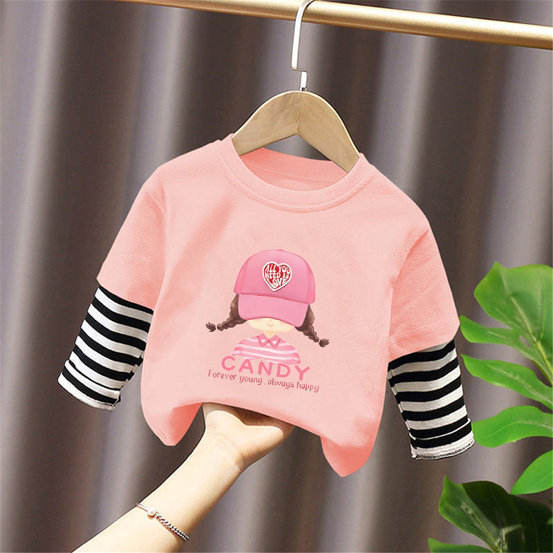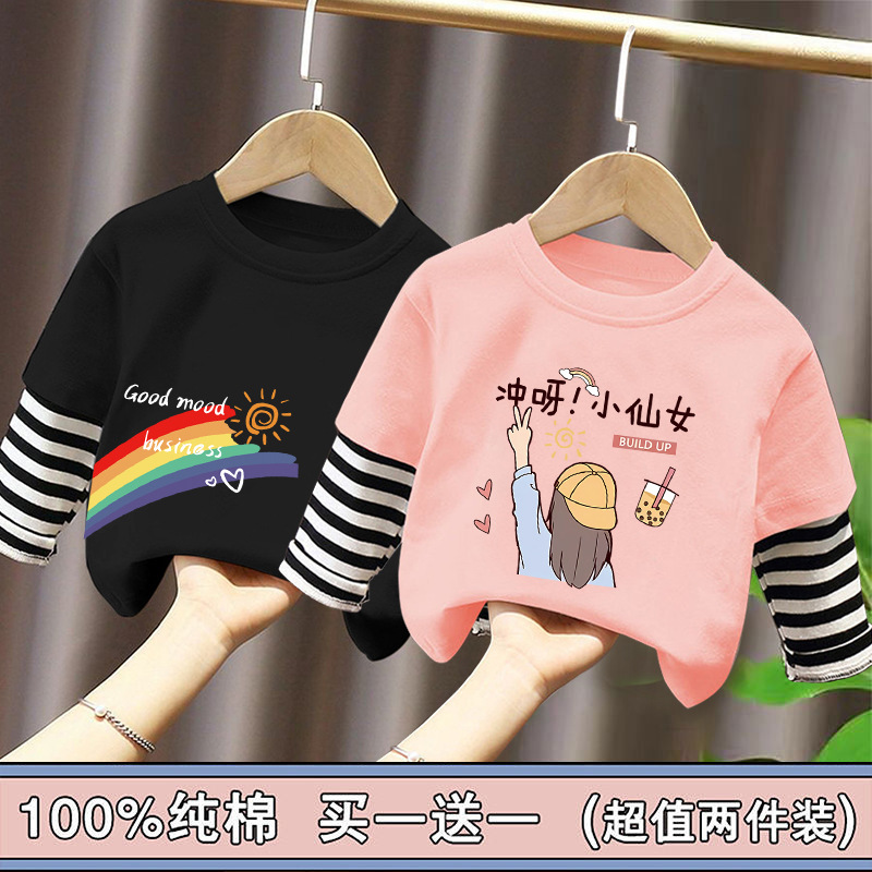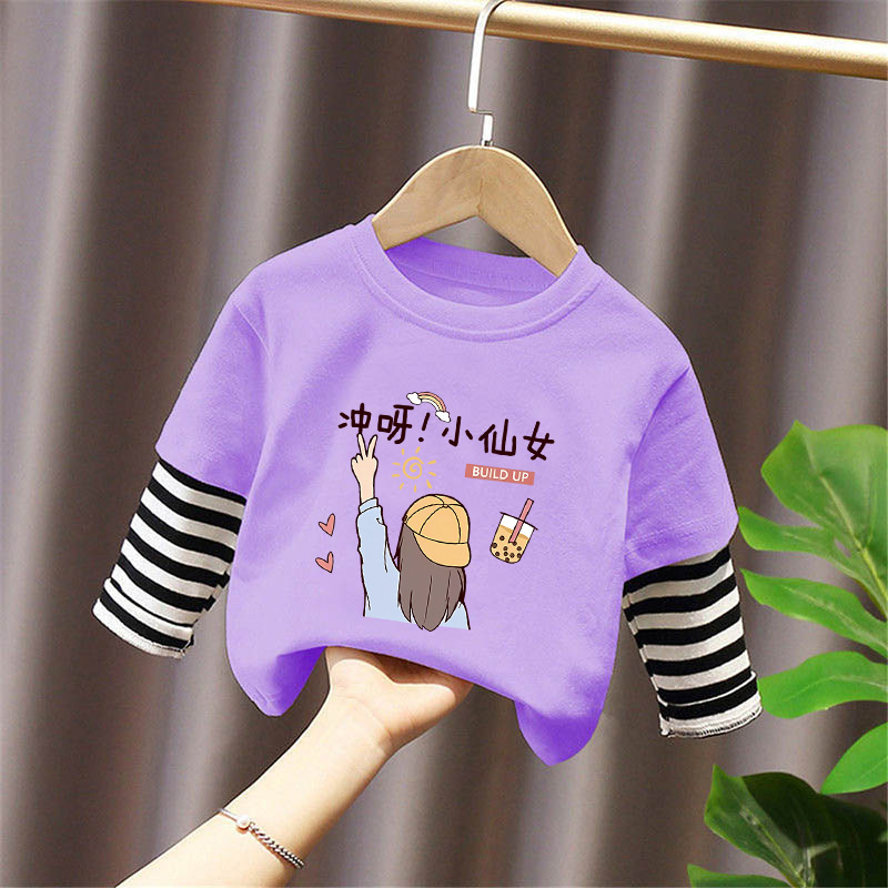 Girls' Pure Cotton Long-Sleeve T-Shirt, Faux Two-Piece Top, Stylish Children's Base Shirt, Medium and Large Children's Wear, 2025 Spring and Autumn New Model