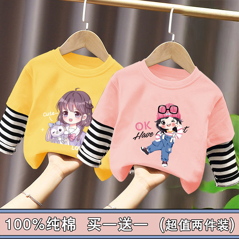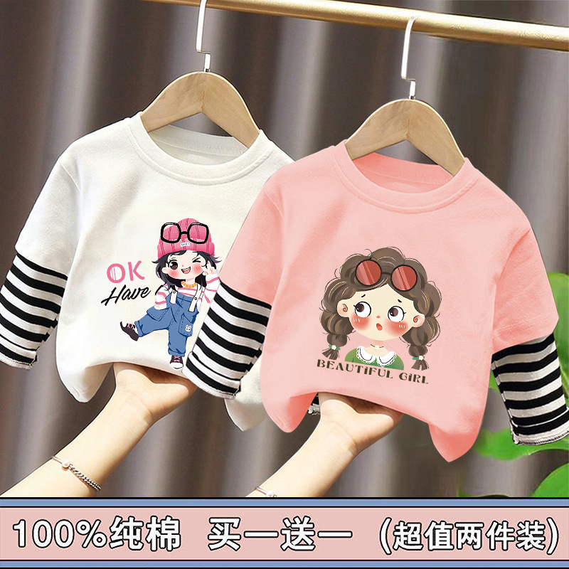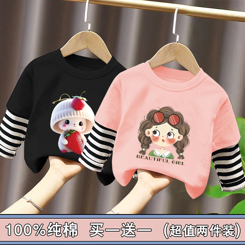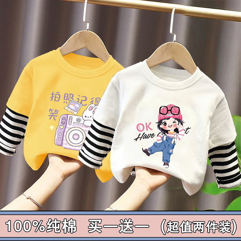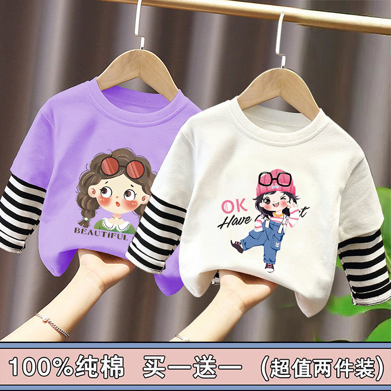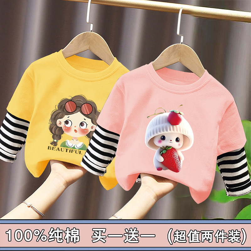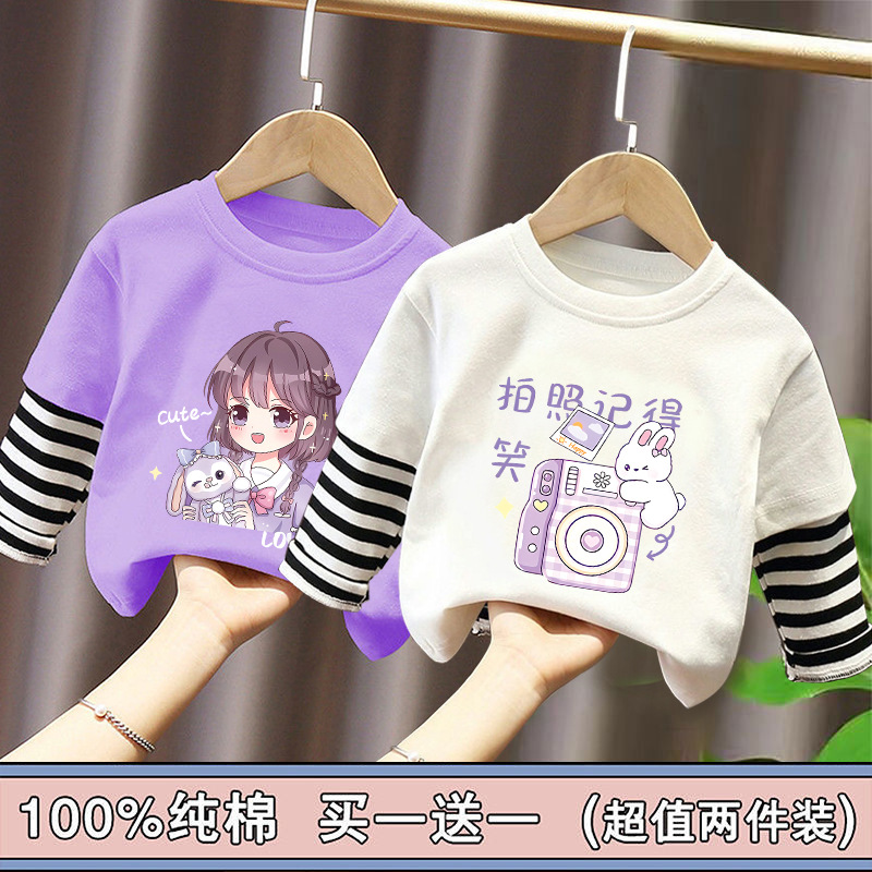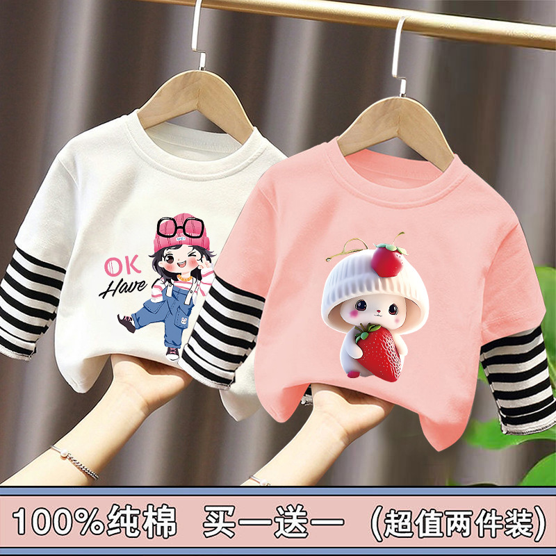 Girls' Base Layer Pure Cotton Autumn Outfit 2025 New Children's Faux Two-Piece Long-Sleeve T-Shirt for Spring and Autumn, Suitable for Older Children