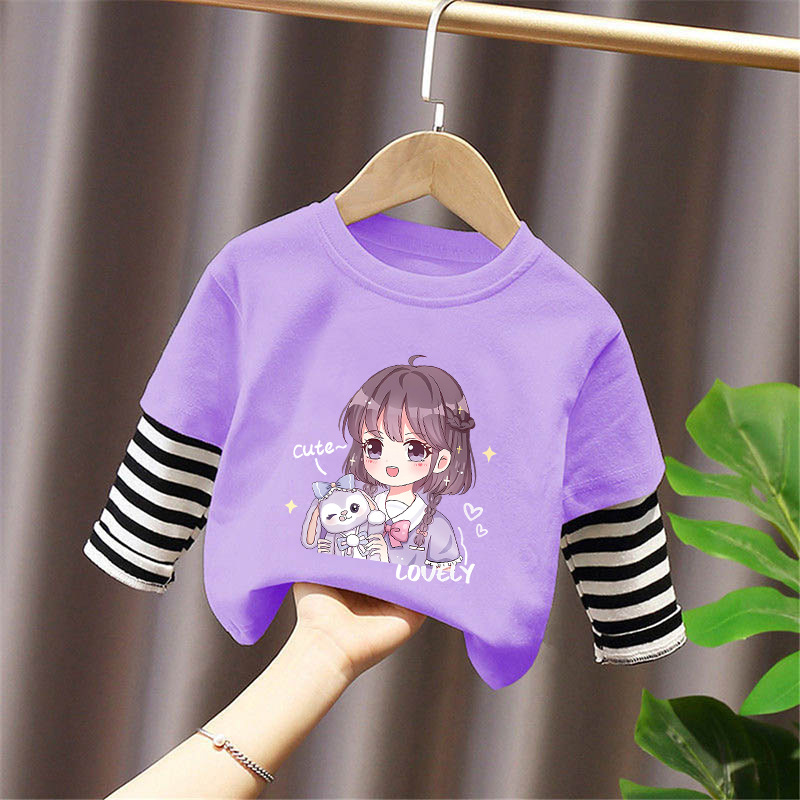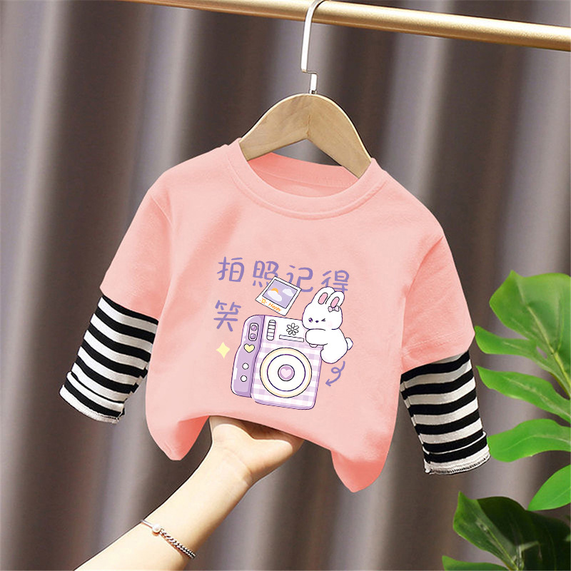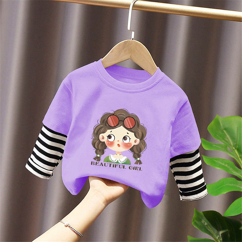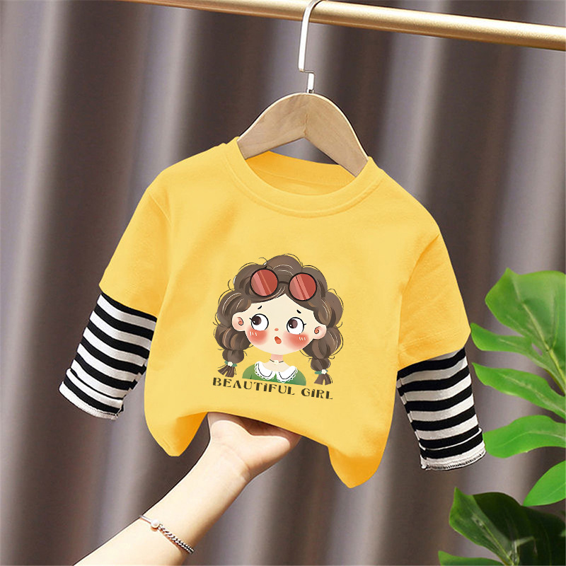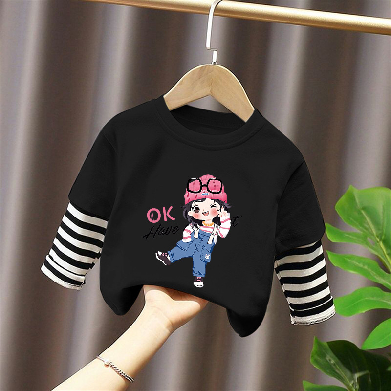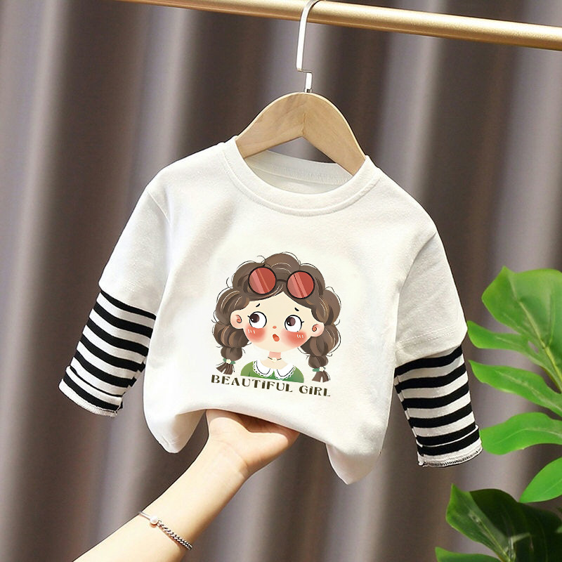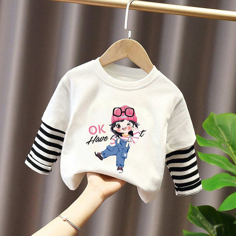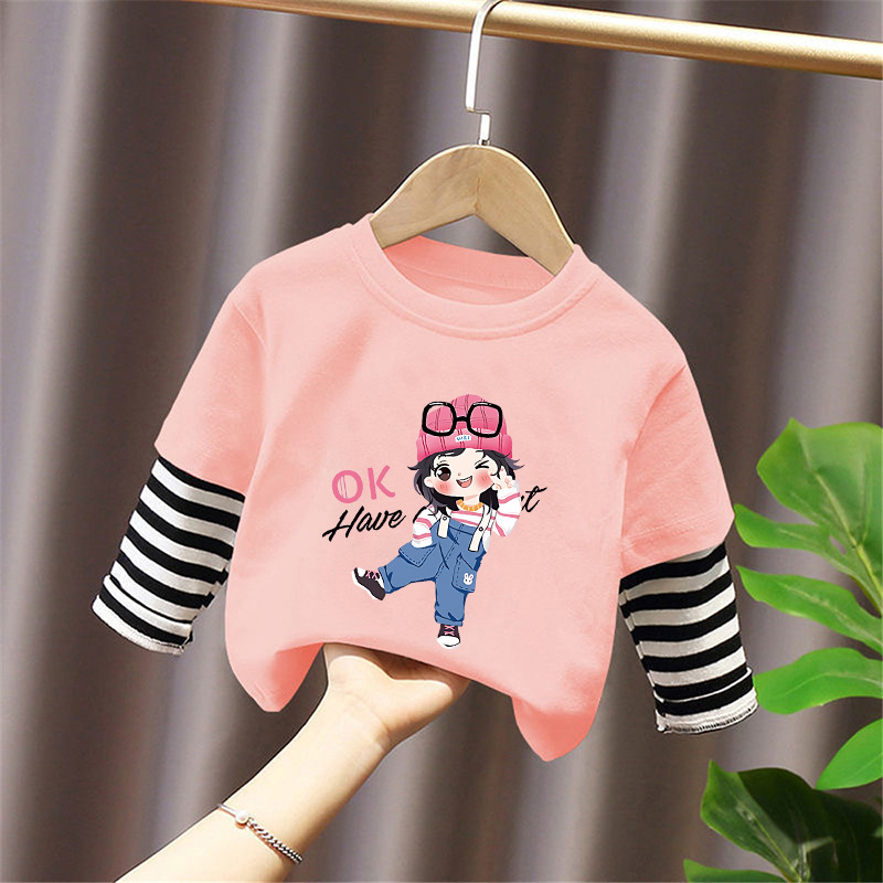 Girls' Base Layer Pure Cotton Autumn Outfit 2025 New Children's Faux Two-Piece Long-Sleeve T-Shirt for Spring and Autumn, Suitable for Older Children
