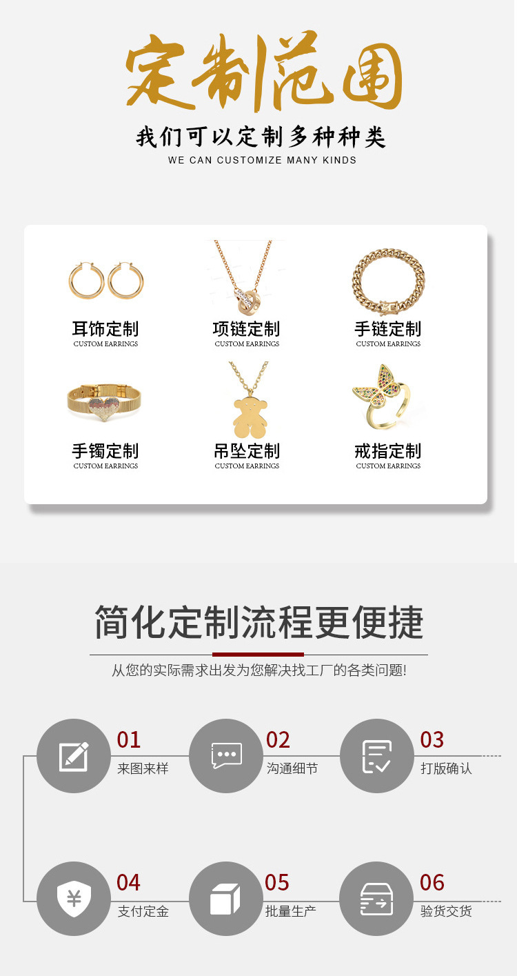 Customized Jewelry with Drawings and Samples, Various Necklaces, Bracelets, Earrings, Rings, Stainless Steel and Copper, Source Factory Processing and Customization
