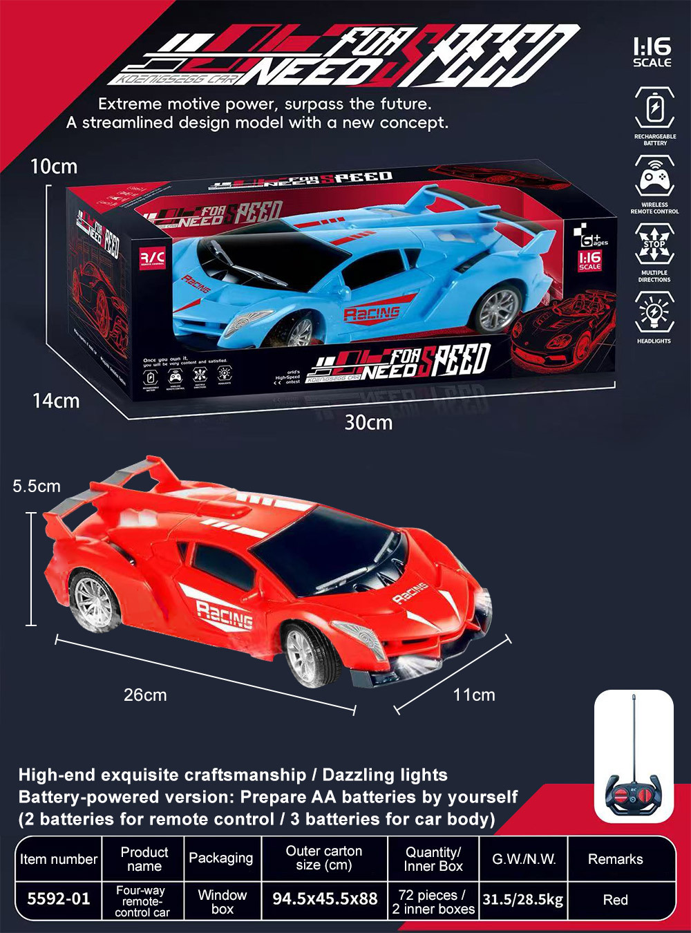 | Color | 5592-01 four-way remote control car-blue [battery model] window box | Color | 5592-01a four-way remote control car-red [rechargeable model] window box |