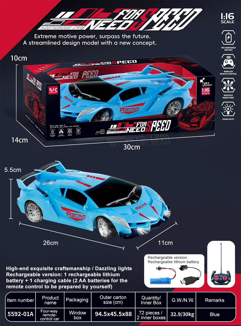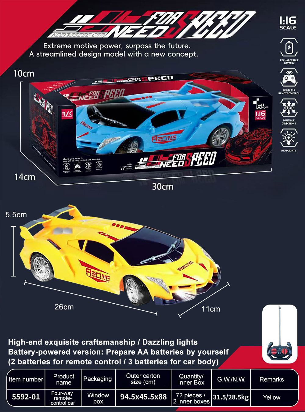 | Color | 5592-01 four-way remote control car-blue [battery model] window box | Color | 5592-01a four-way remote control car-red [rechargeable model] window box |