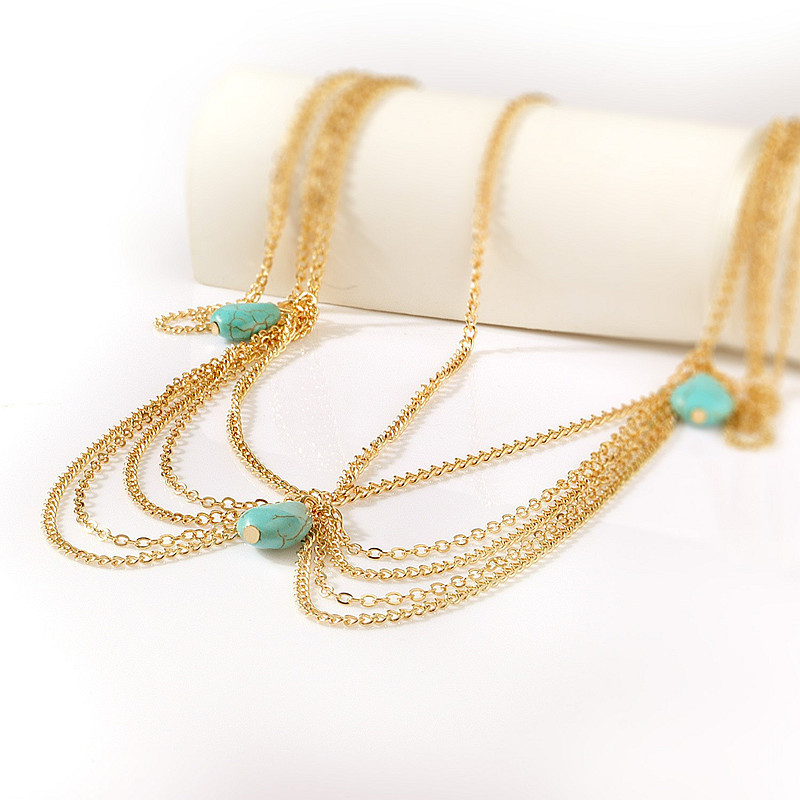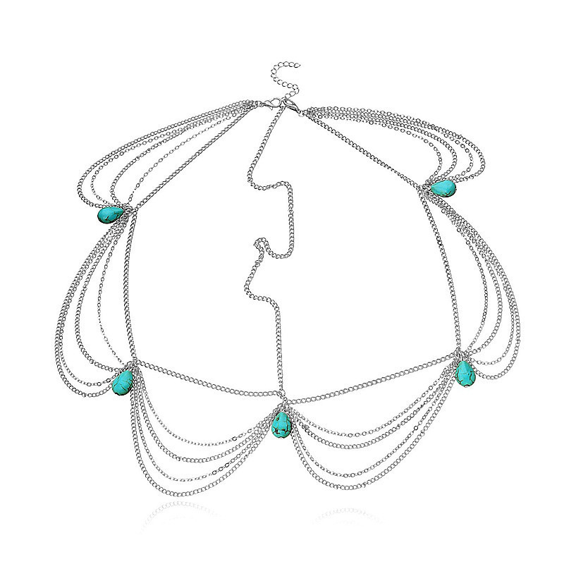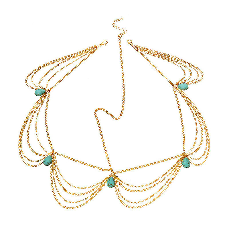 Foreign Trade Exotic Headwear European and American Autumn and Winter Multi-Layer Chain Tassel Turquoise Retro Water Drop Head Chain Women Wholesale