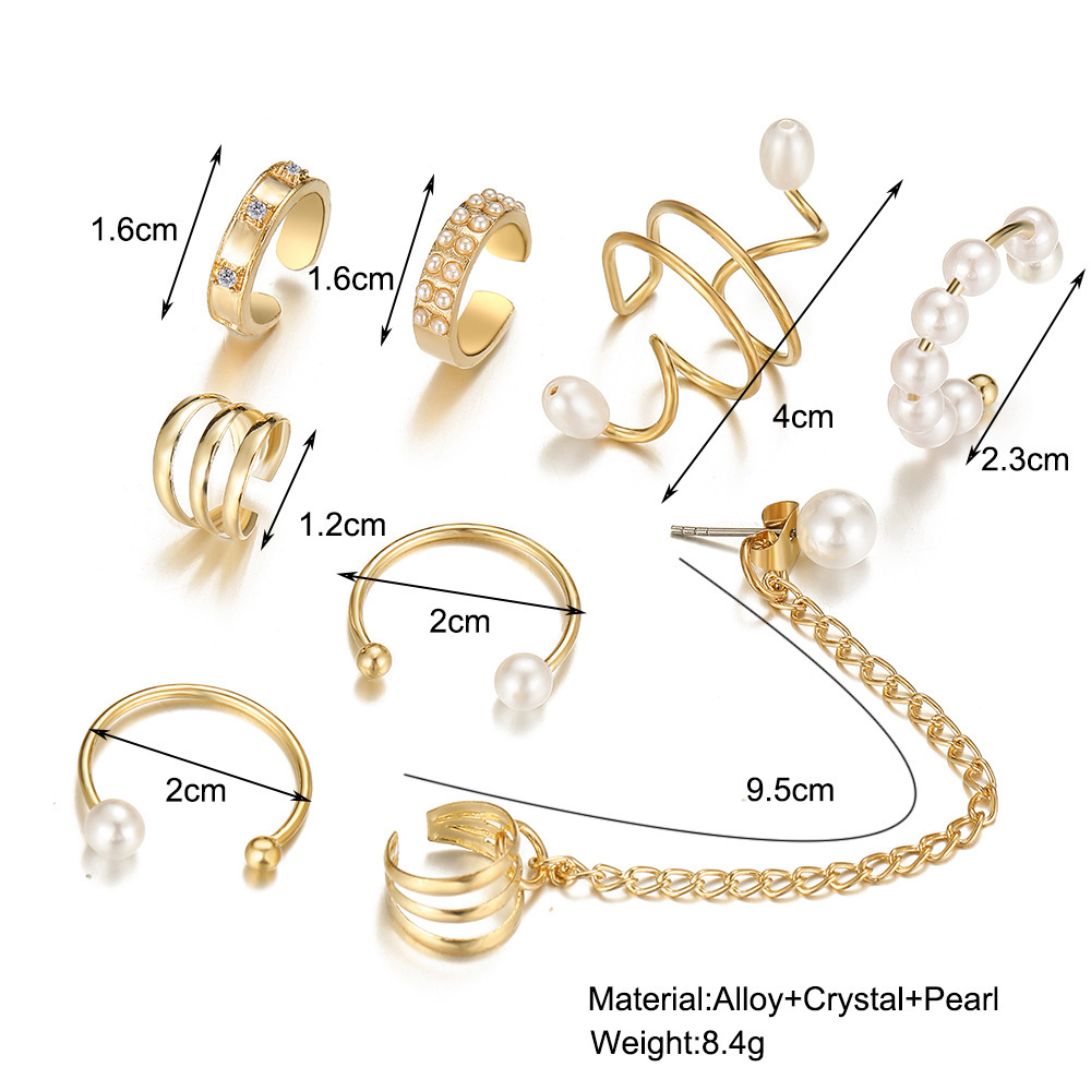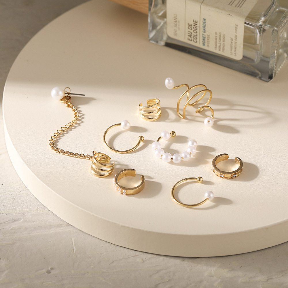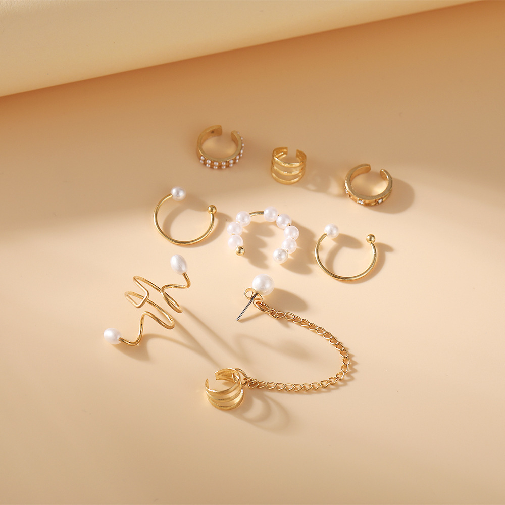 New Cross-Border Ins Creative Pearl Tassel Non-Pierced Ear Bone Clip Simple Ear Clip Set 8-Piece Set of Earrings Wholesale